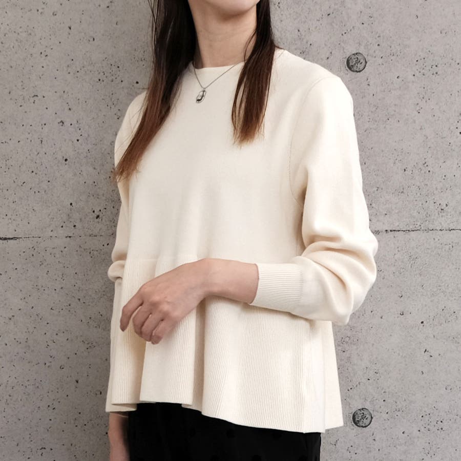 背後から見せる素敵な仕掛けが魅力の「バックパールフレアニットトップス」。