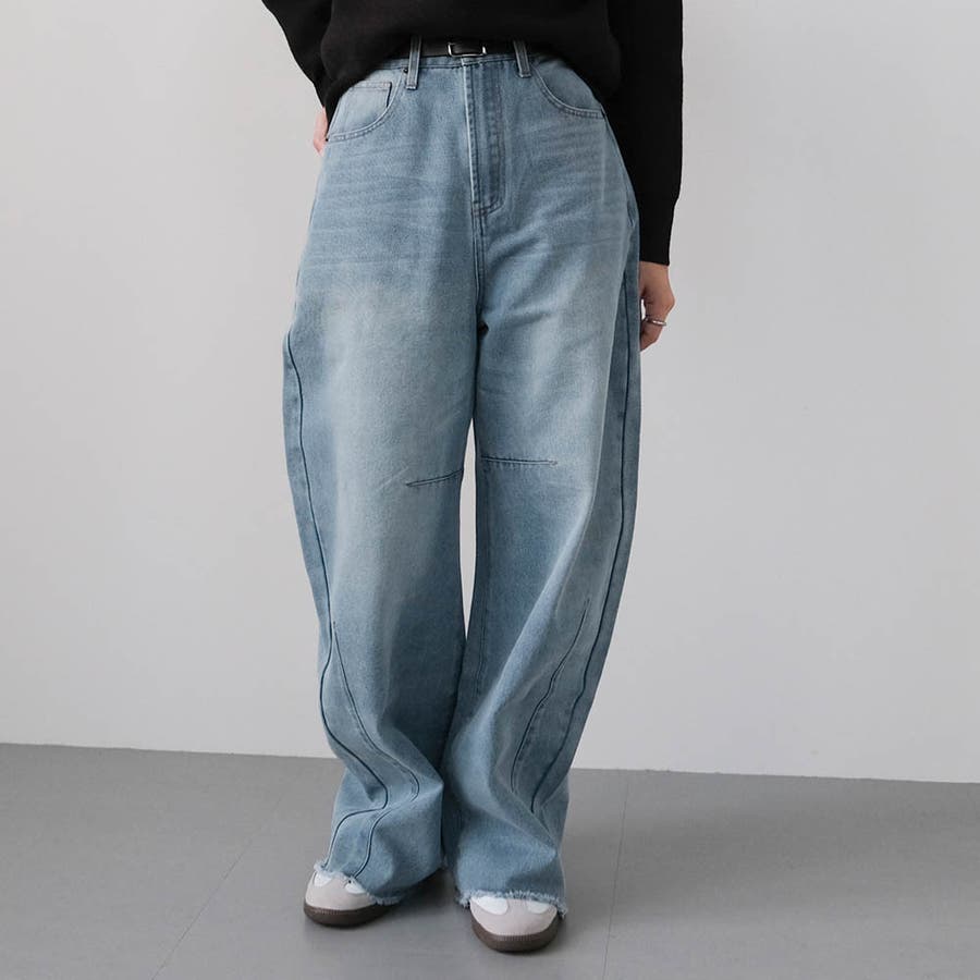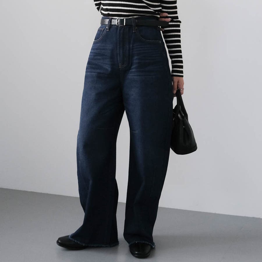 ゆるやかな丸みを描く、今っぽい「バレルレッグ」シルエットのデニムパンツ。