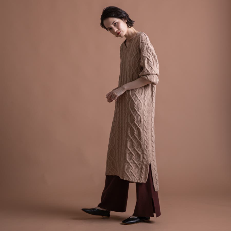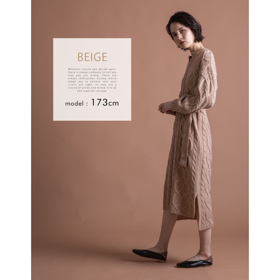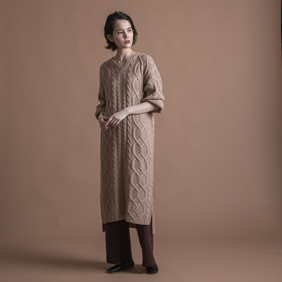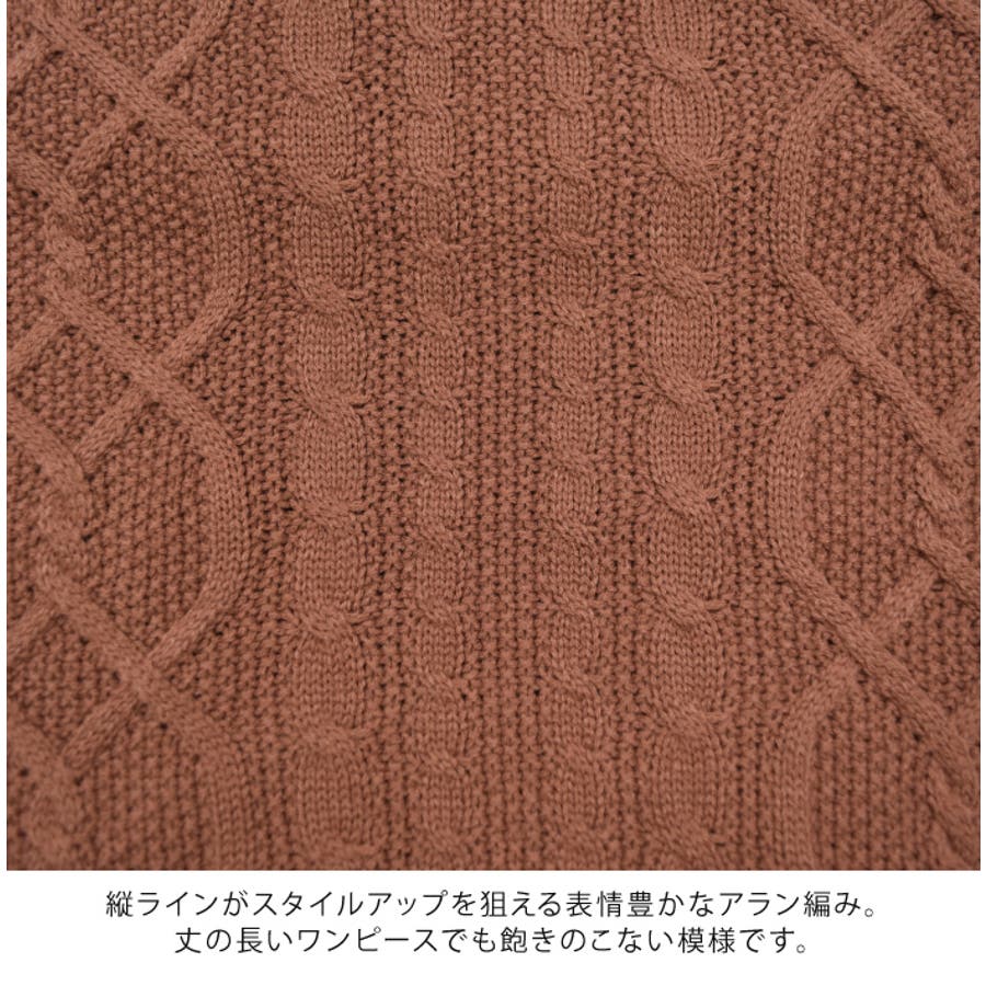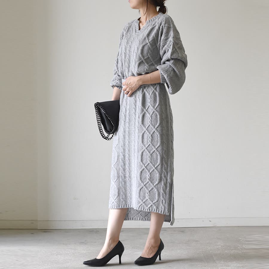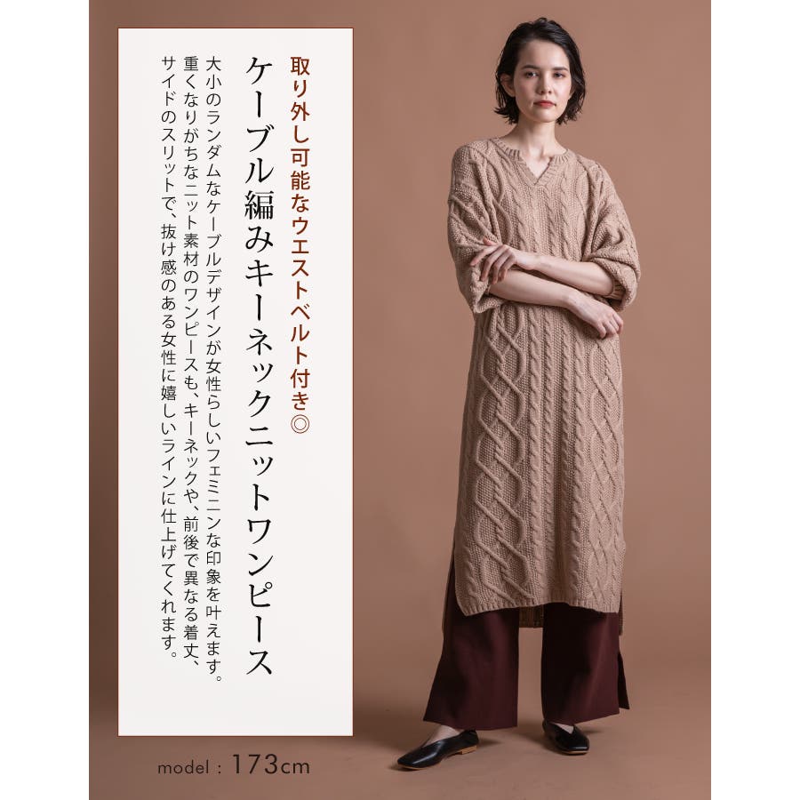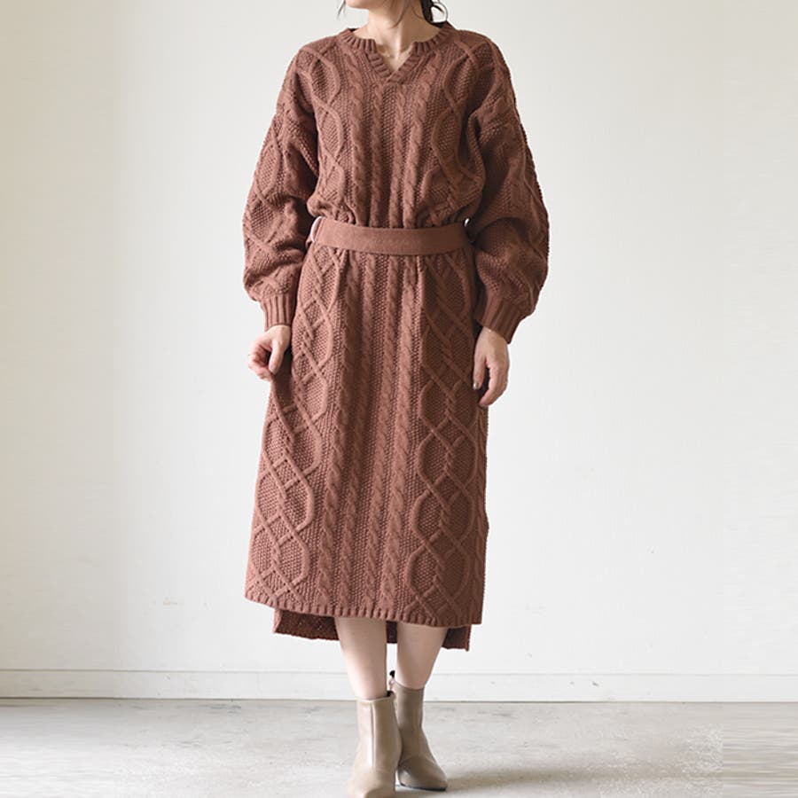 ランダムなデザイン編みが女性らしい印象に!ケーブル編みキーネックニットワンピース…