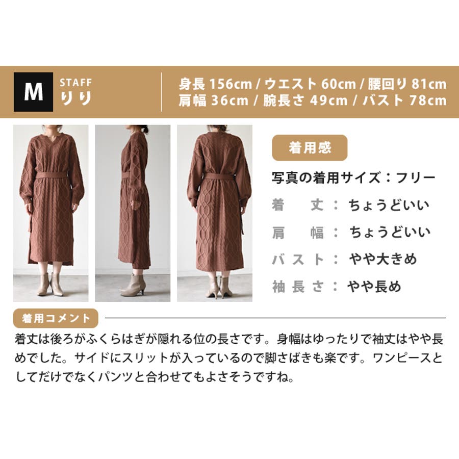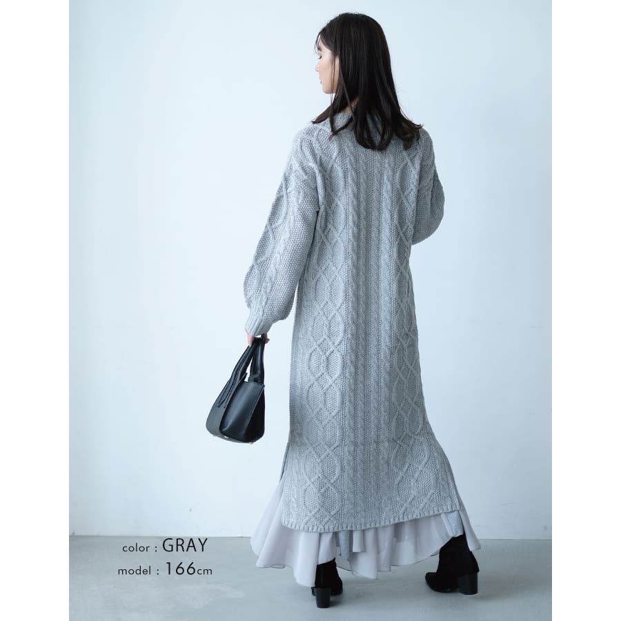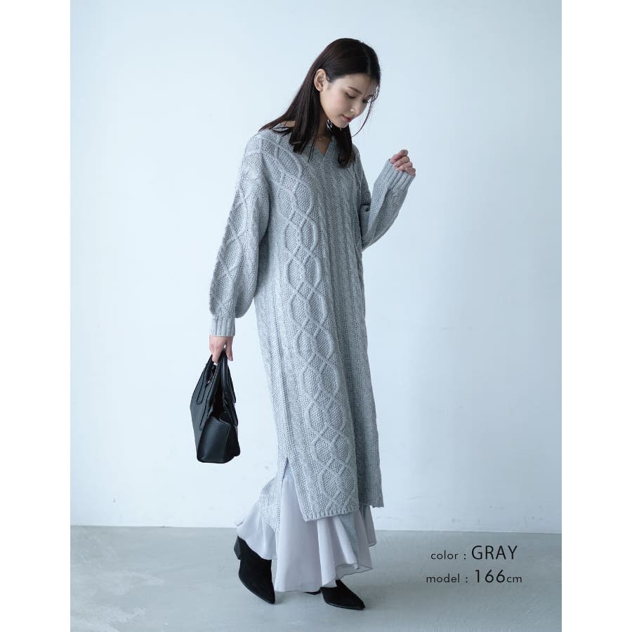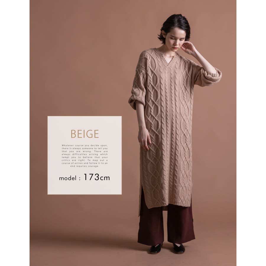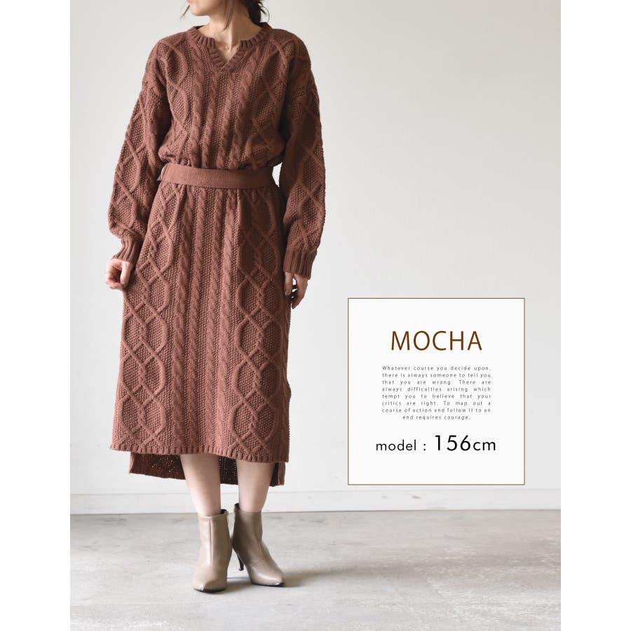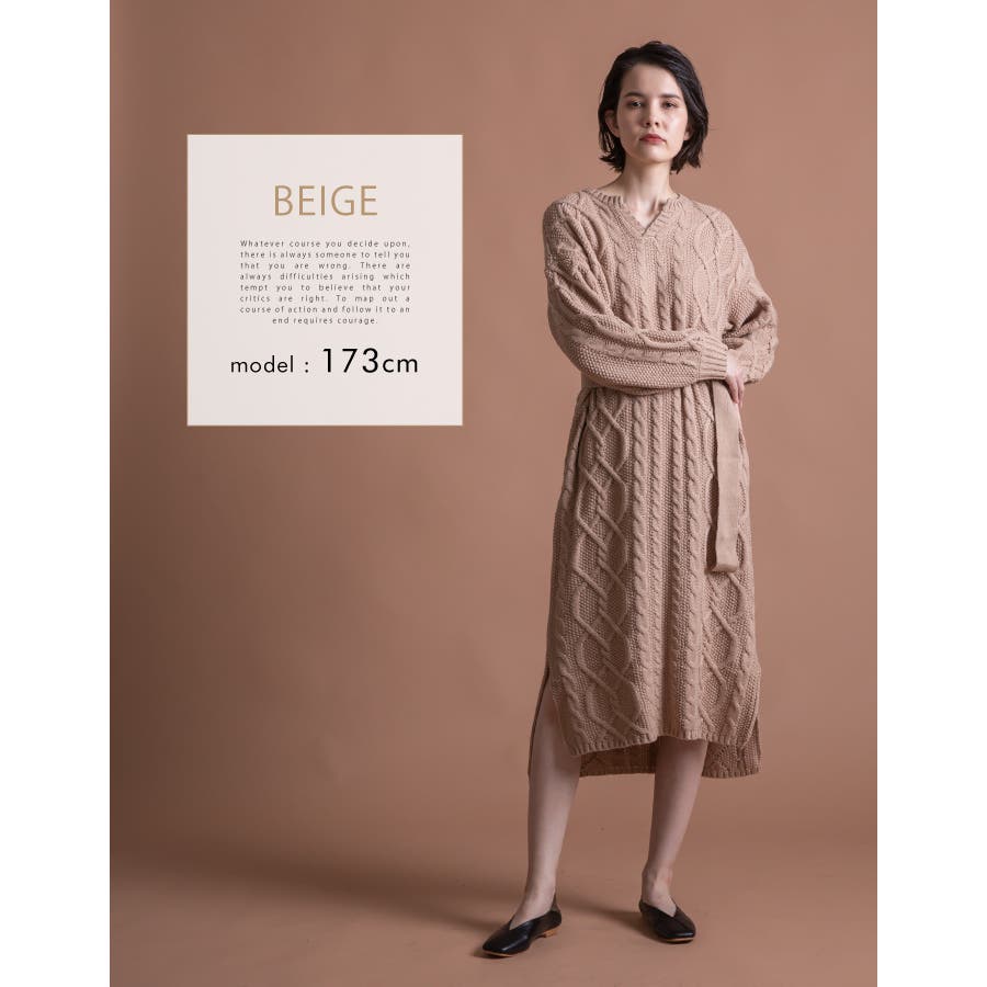ランダムなデザイン編みが女性らしい印象に!ケーブル編みキーネックニットワンピース…