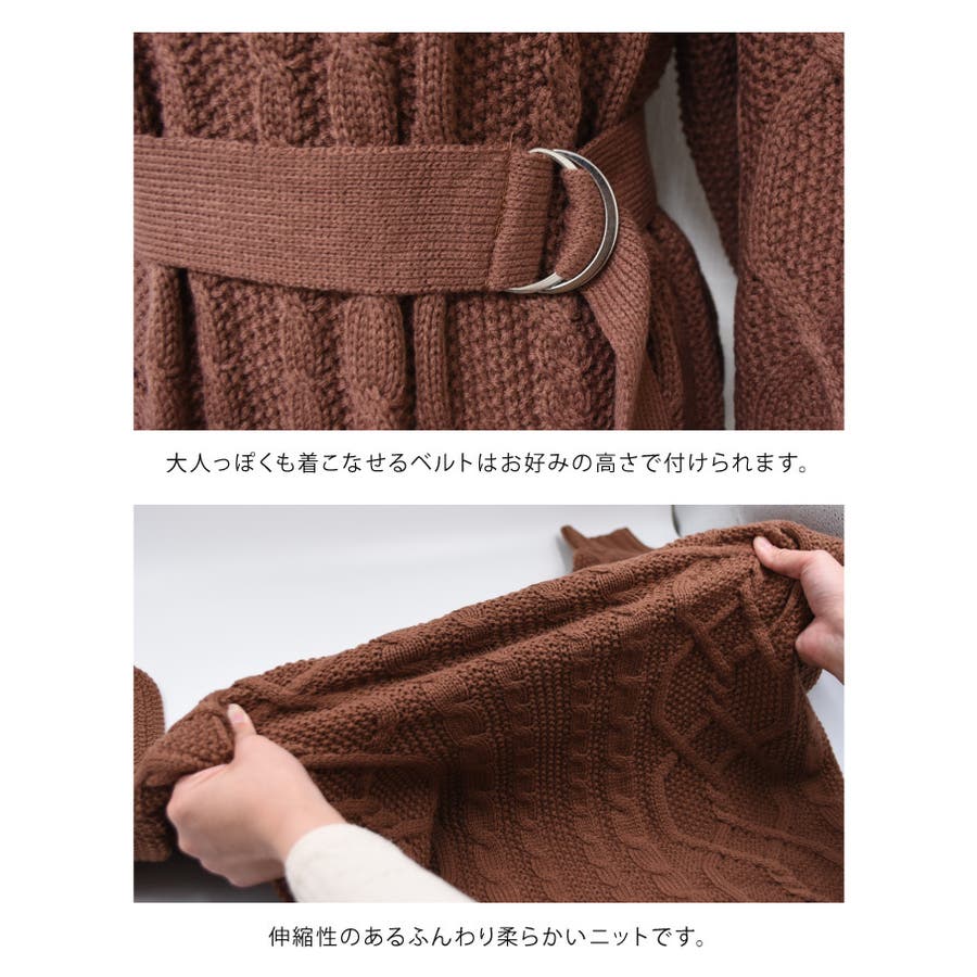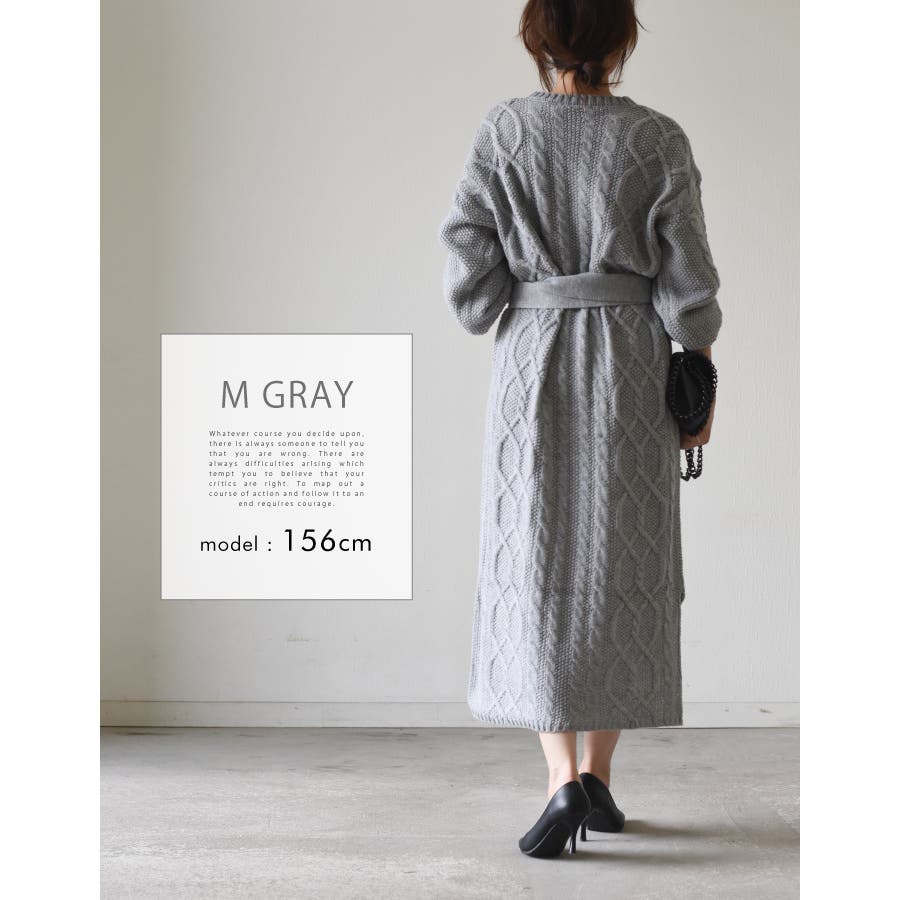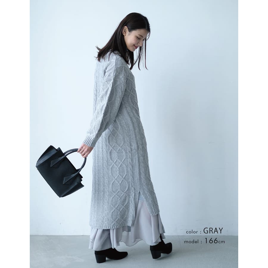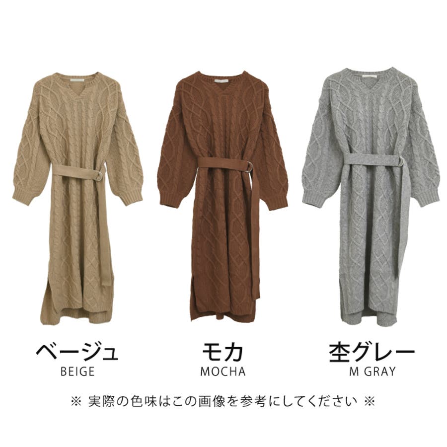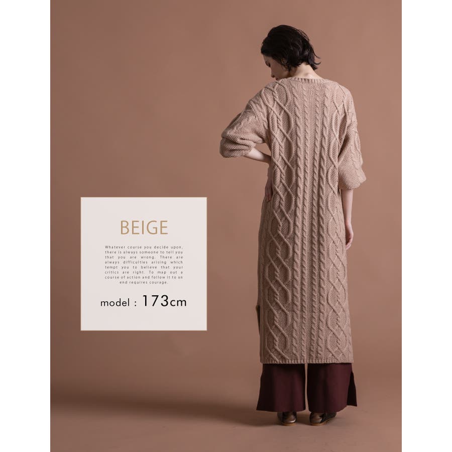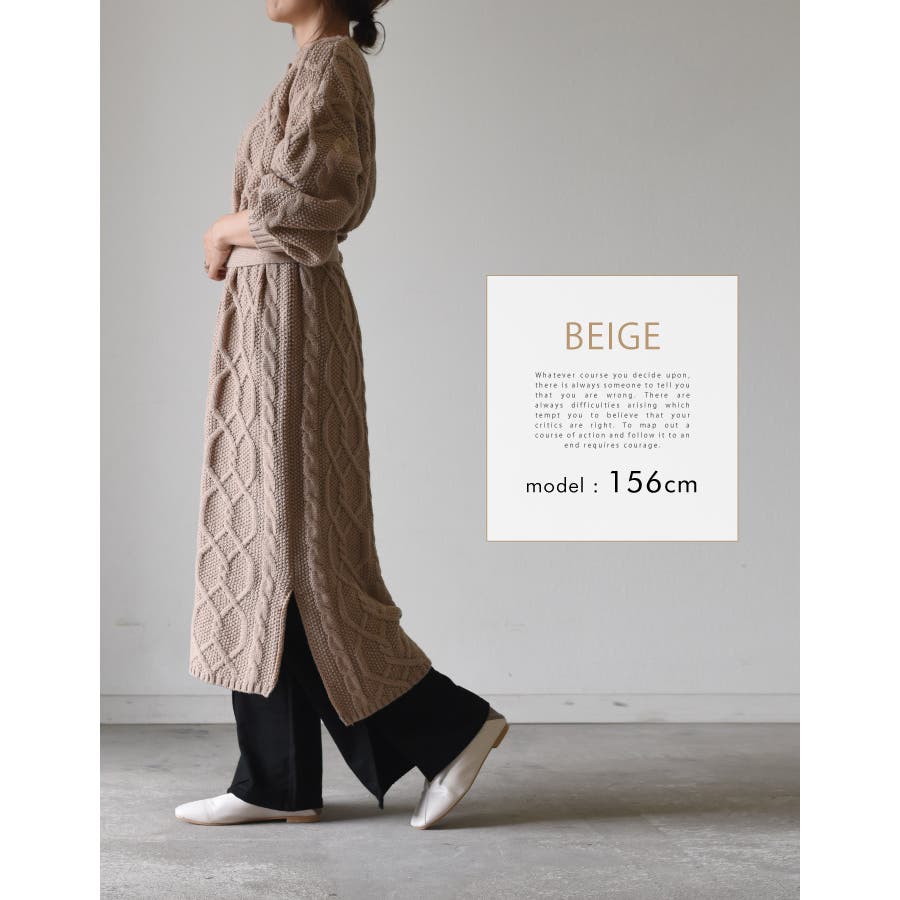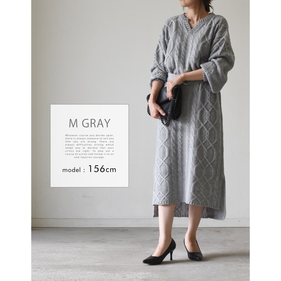ランダムなデザイン編みが女性らしい印象に!ケーブル編みキーネックニットワンピース…