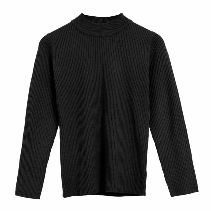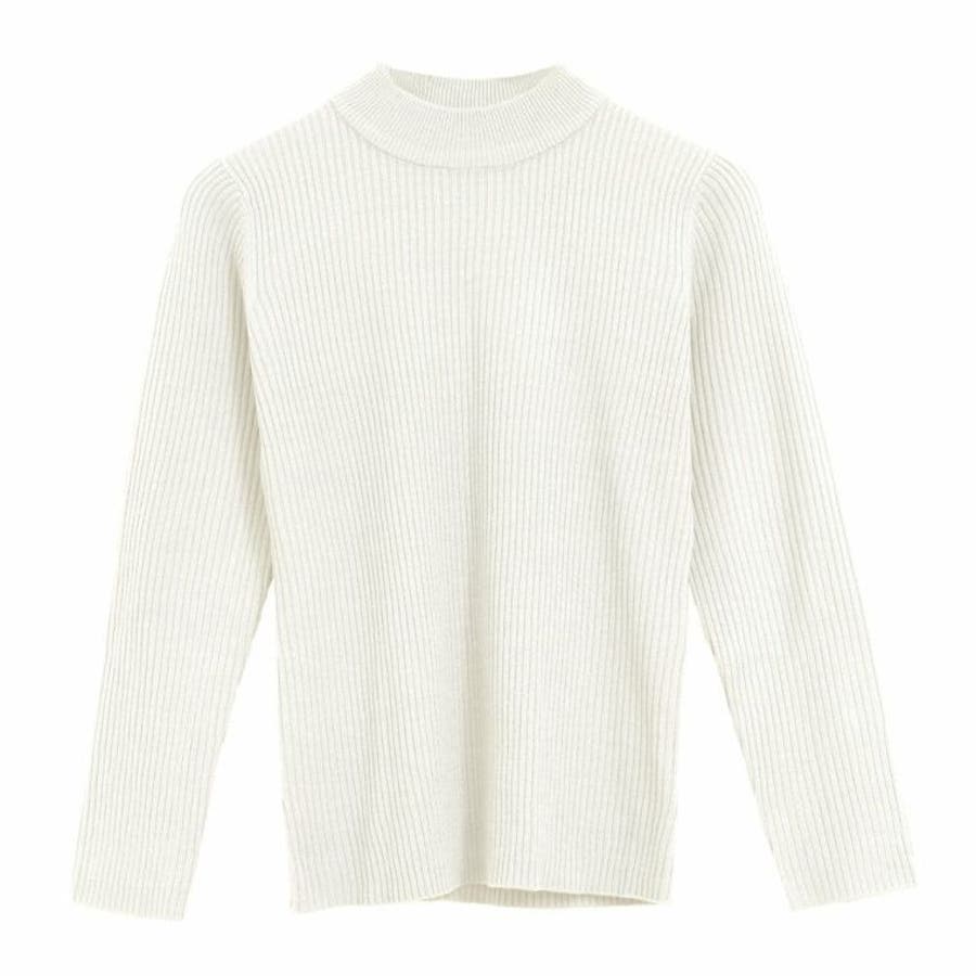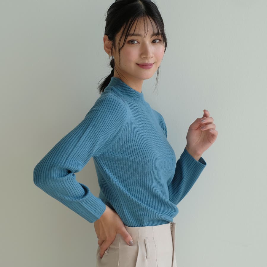 首元を上品に見せてくれるプチハイネックのニットトップス。