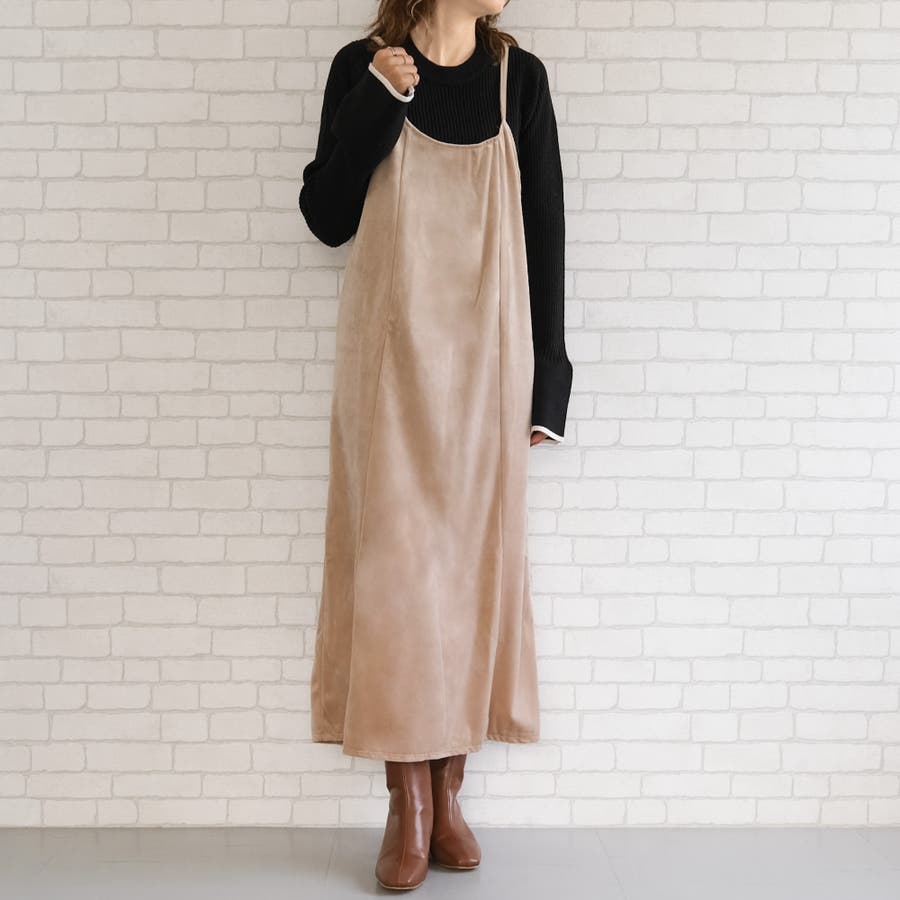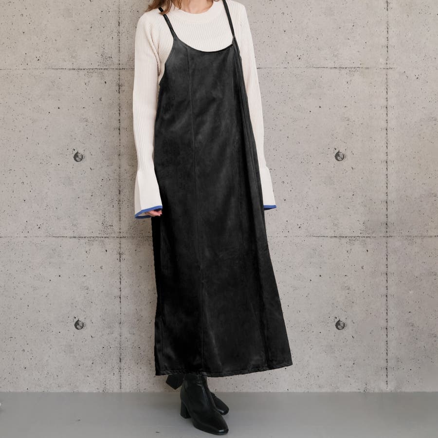 バックリボンキャミワンピース キャミワンピ レディース 春 秋 ロング丈 マキシ丈 ジャンスカ サロペット ジャンパースカート オールインワン ロングスカート マキシスカート 無地 シンプル 大人 お洒落 おしゃれ かっこいい レイヤード 重ね着 カジュアル ベロア ベロア生地 光沢感 光沢