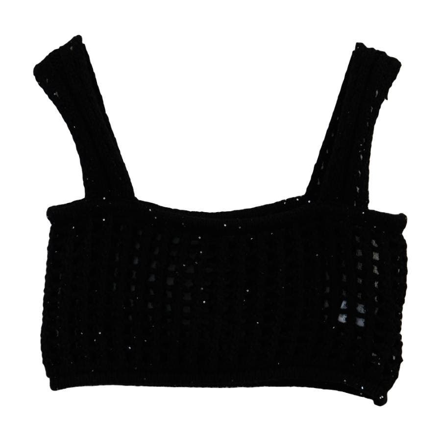 スパンコールが編みこまれたバンドゥ型のニットビスチェ
