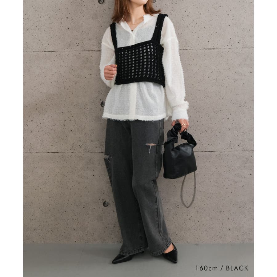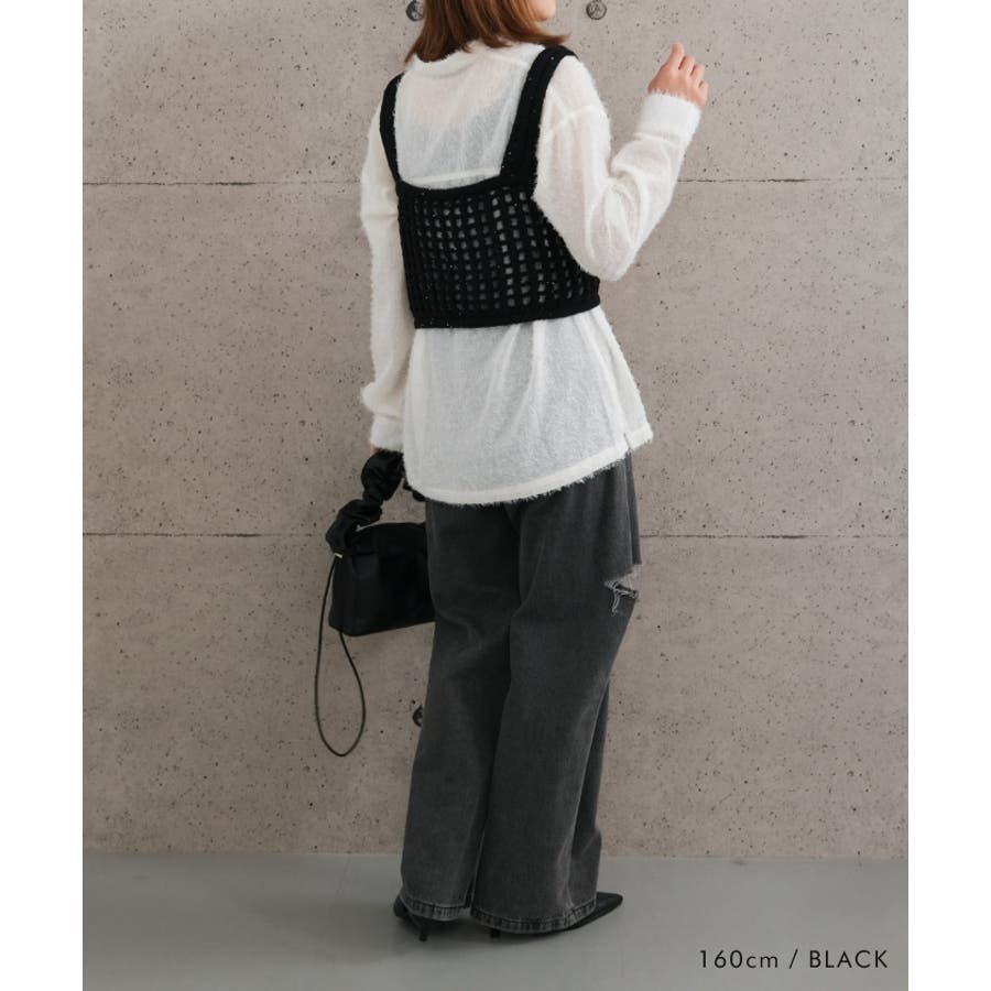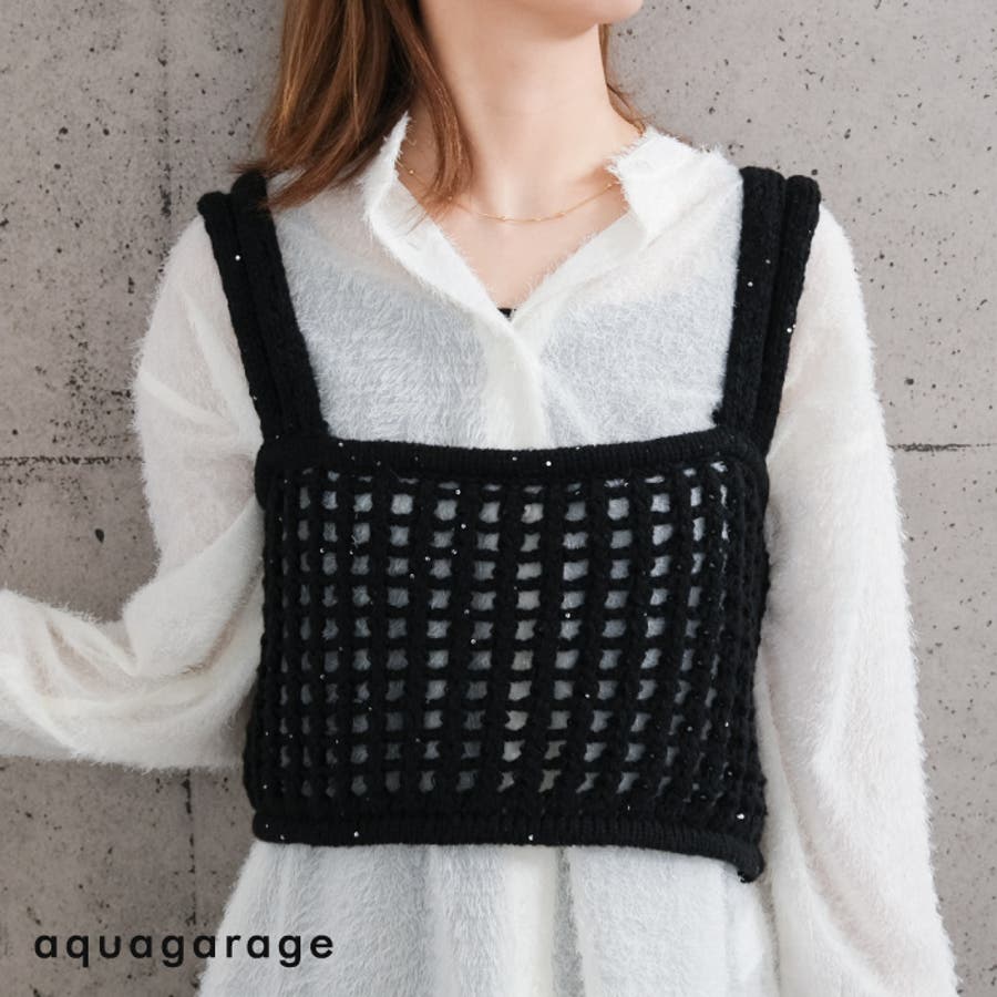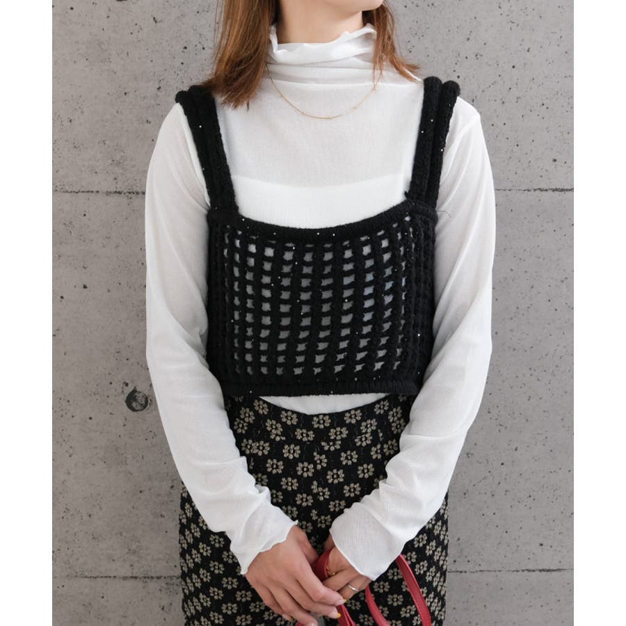 メッシュ編みニットビスチェ トップス レディース 春 夏 秋 M 無地 ガーリー フェミニン カジュアル シンプル ベーシック コンパクト 華奢魅せ きれいめ 体型カバー レイヤード 重ね着 ビスチェ スパンコール