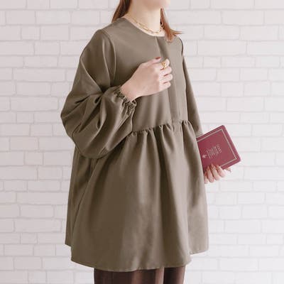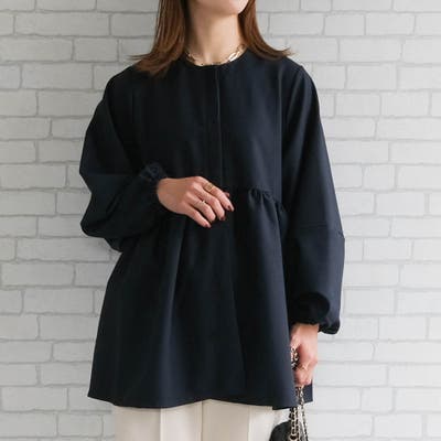 前スリットペプラムトップス ブラウス ペプラム 体型カバー チュニック レディース トップス シャツ ノーカラー オーバー 長い ロング 長袖 羽織 アウター ライトアウター ボリュームスリーブ 無地 レイヤード