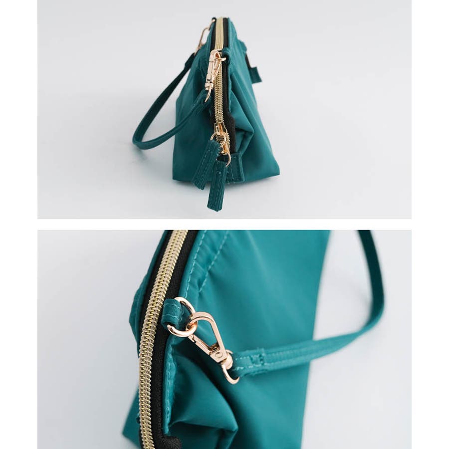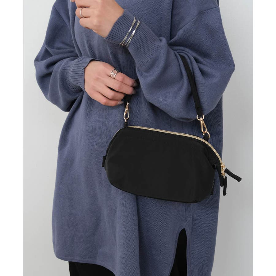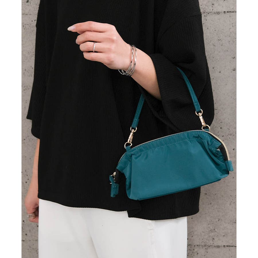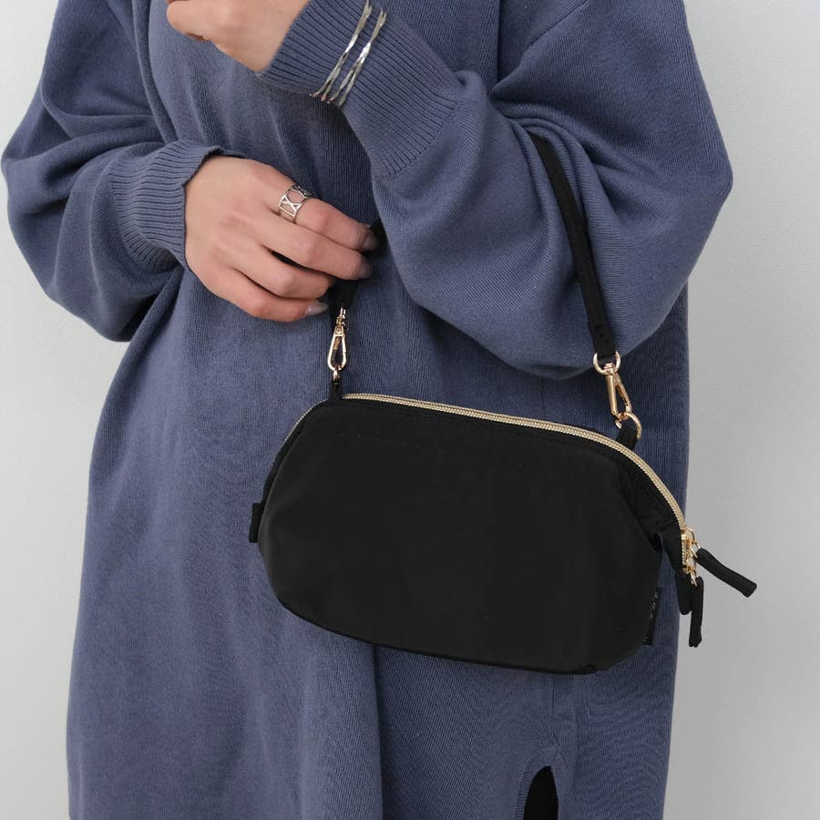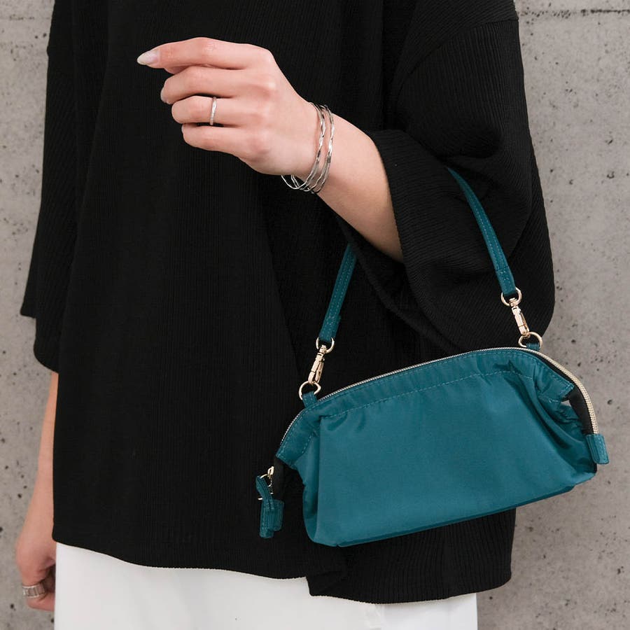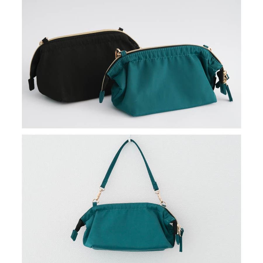 脱着式ストラップ付きで、持ち歩きや化粧室などでの置き場に困らない仕様。