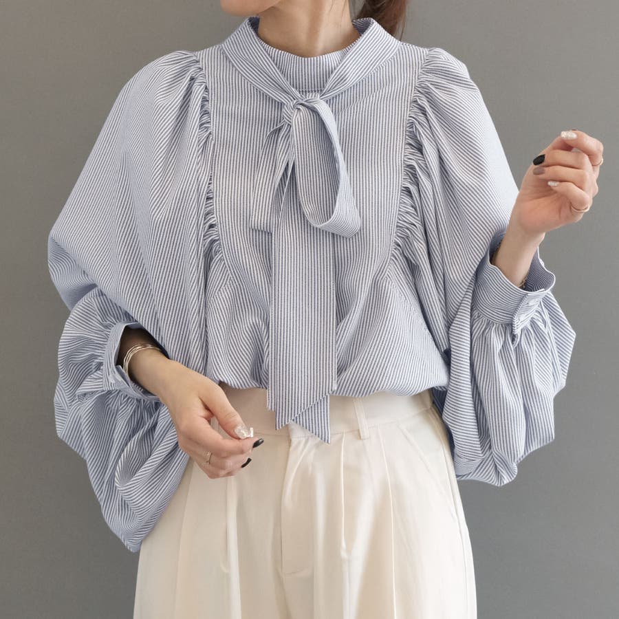 ギャザースリーブボウタイブラウス トップス シャツ ブラウス レディース 春 秋 M 長袖 バルーン袖 バルーンスリーブ ボリューム袖 袖コンシャス ぽわん袖 ポワン袖 二の腕カバー 無地 カジュアル シンプル ハイネック スタンドカラー 立ち襟 立ち衿 シンプル ベーシック きれいめ フェミニン クラシック エレガント リボン 白シャツ 白ブラウス ストライプ デコルテギャザースリーブボウタイブラウス