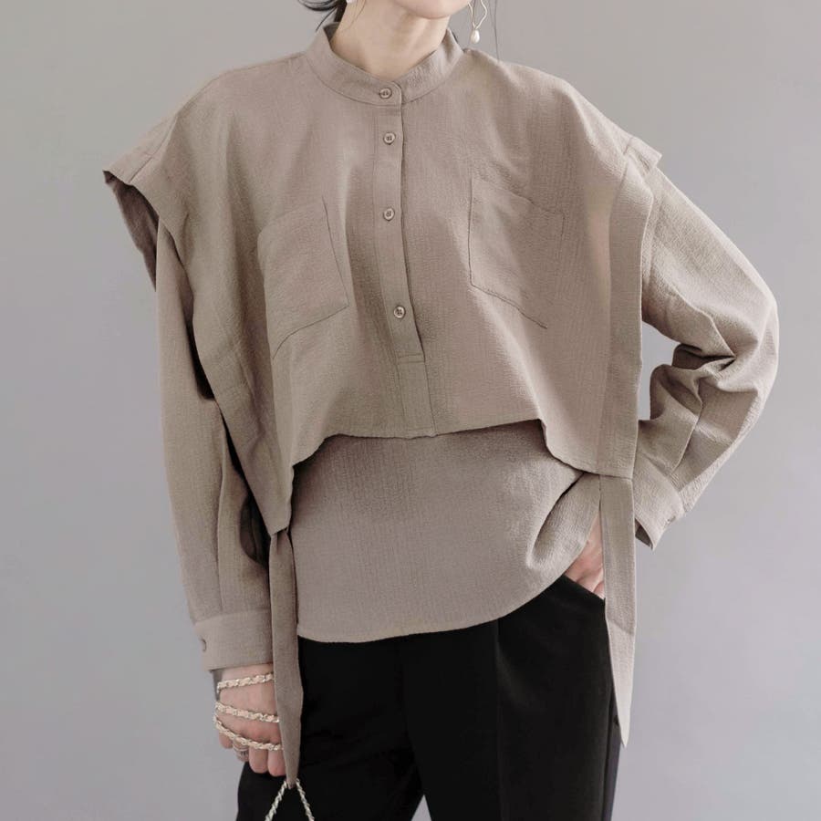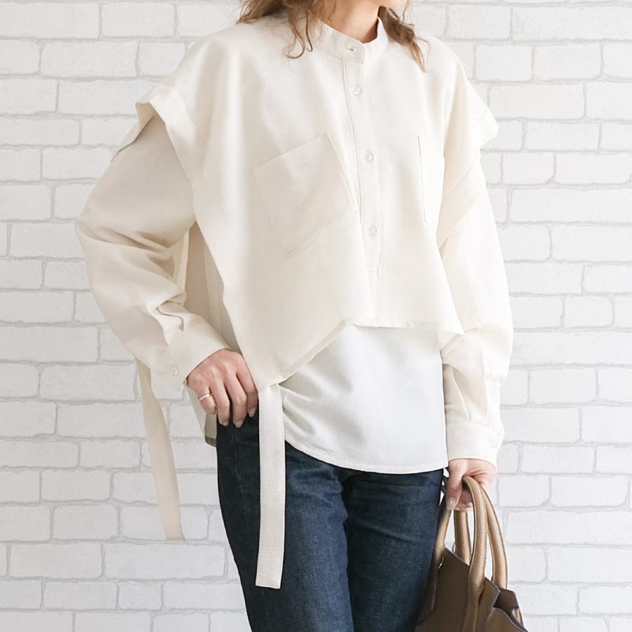 バンドカラー袖口リボンレイヤード長袖ブラウス トップス シャツ レディース 春 秋 冬 M プルオーバー 無地 カジュアル 体型カバー ゆったり リラックス リラクシング スタイルアップ きれいめ フェミニン 大人 可愛い おしゃれ 大きいサイズ 海 レジャー