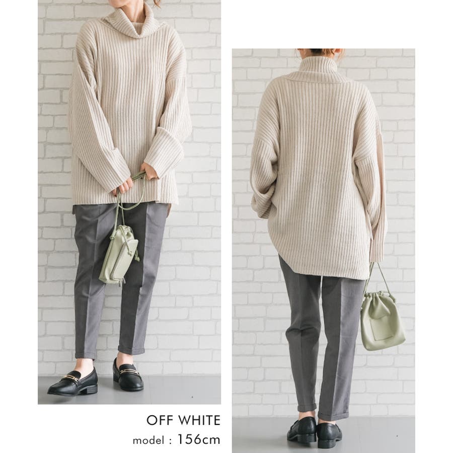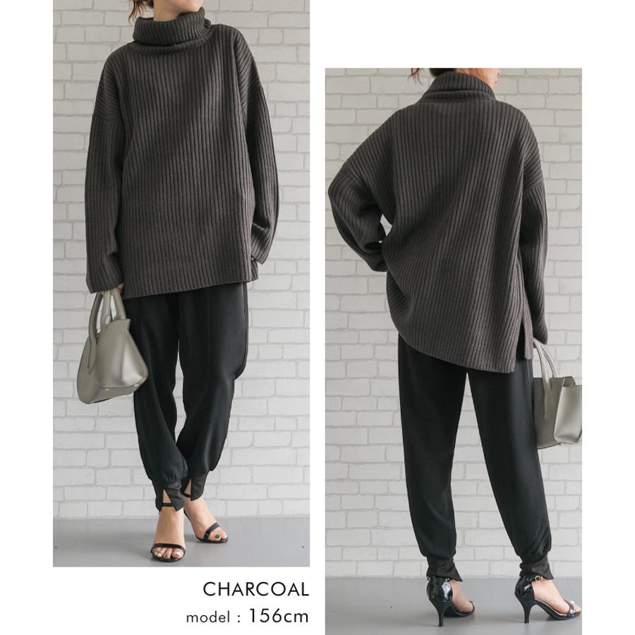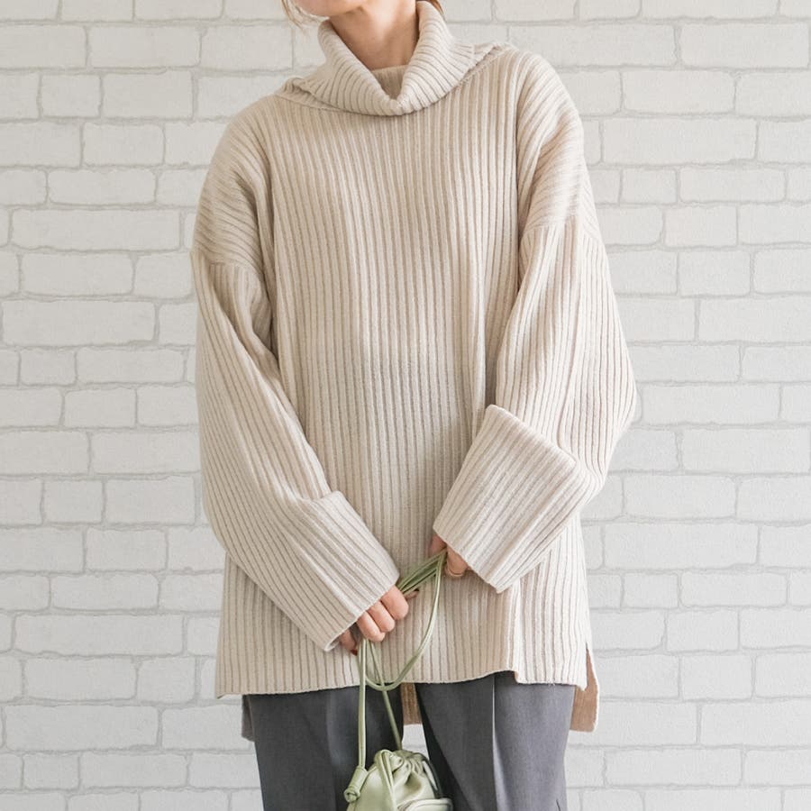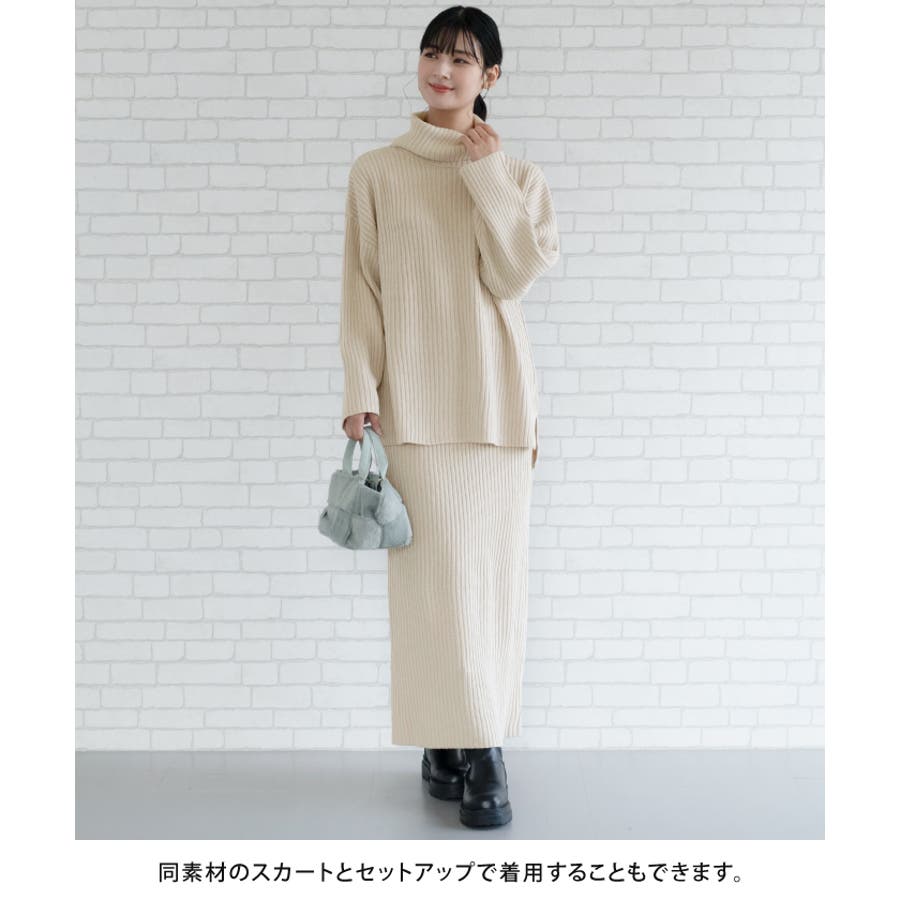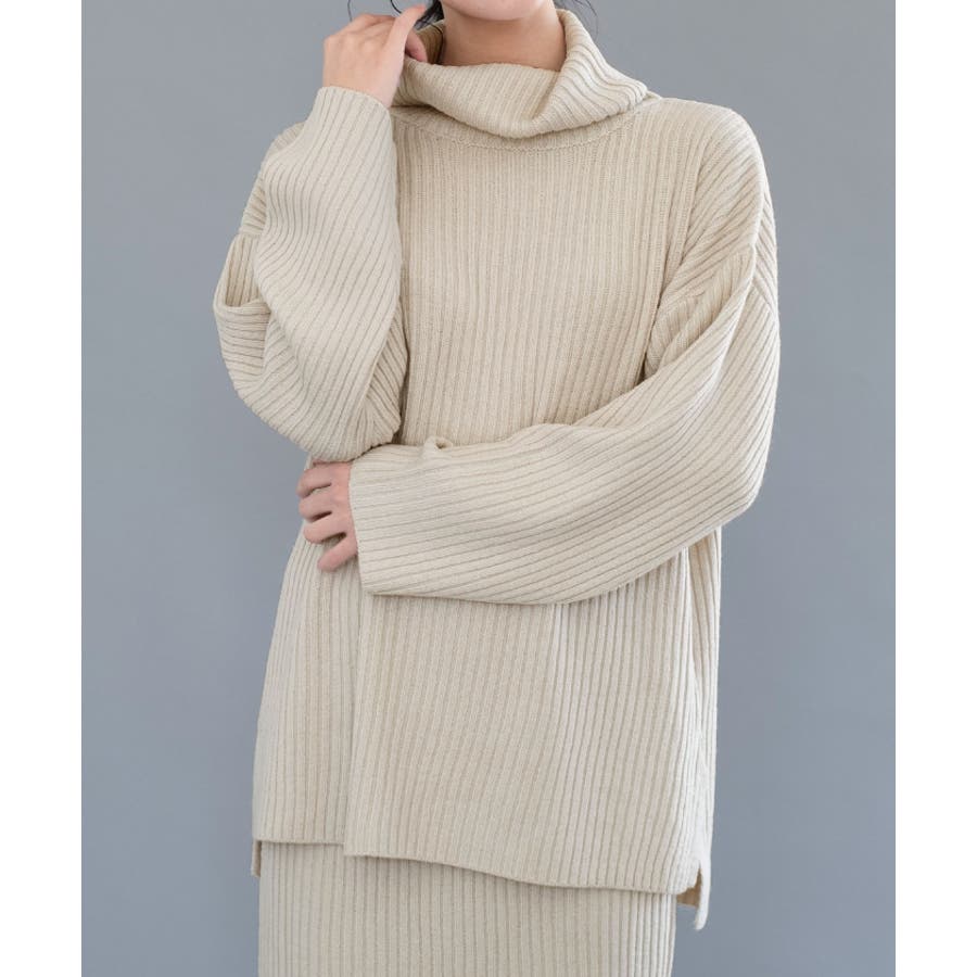 シンプルだけど一枚で様になるリブニットタートルロングプルオーバー セットアップ可