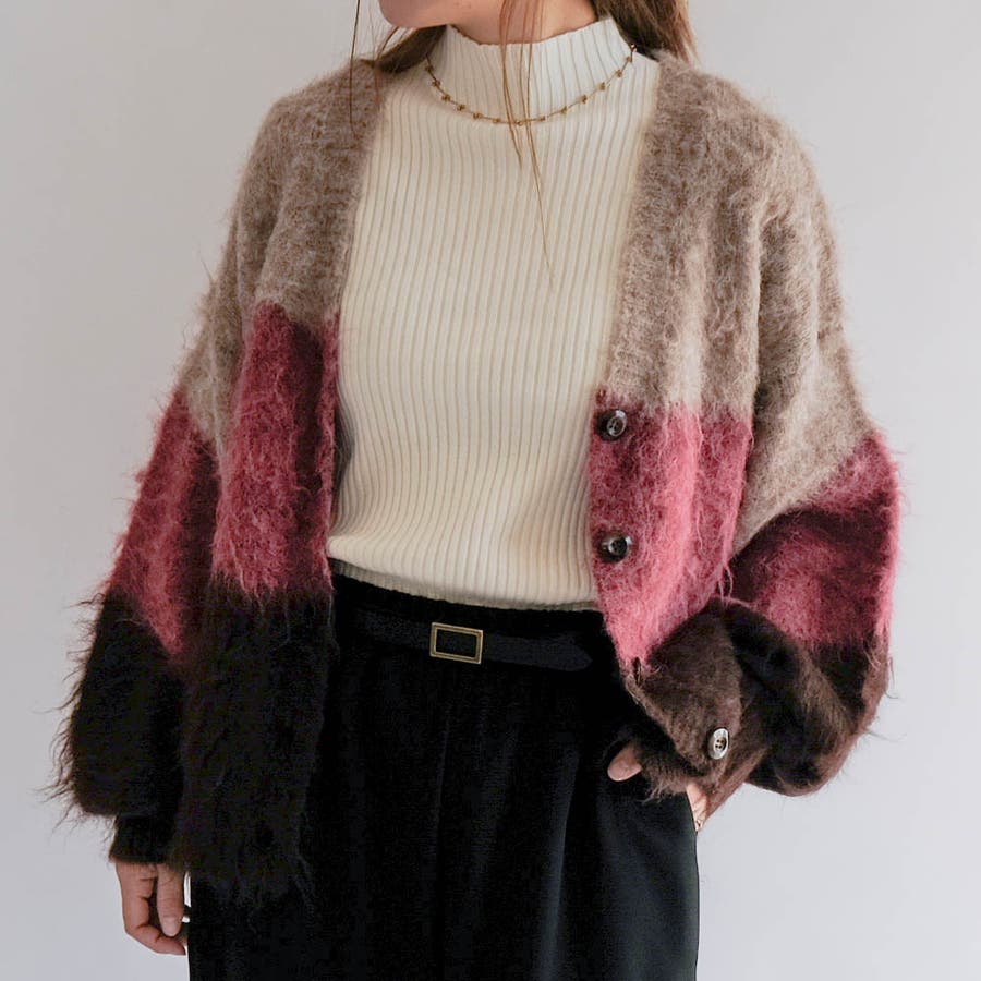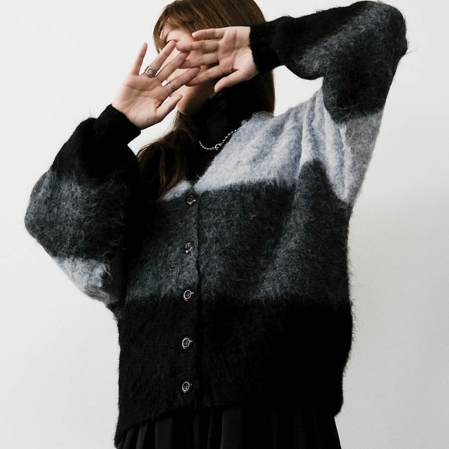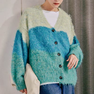 優しい色合いのグラデーションが目を惹く、ふんわりとした風合いのニットカーディガン。