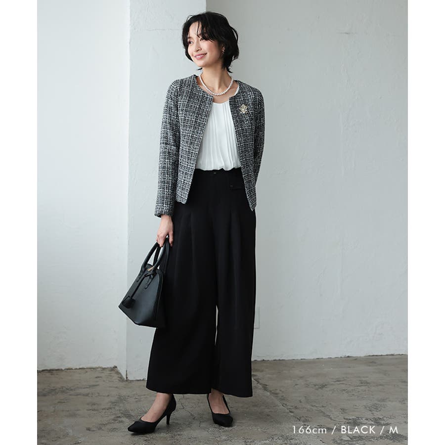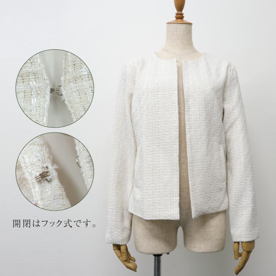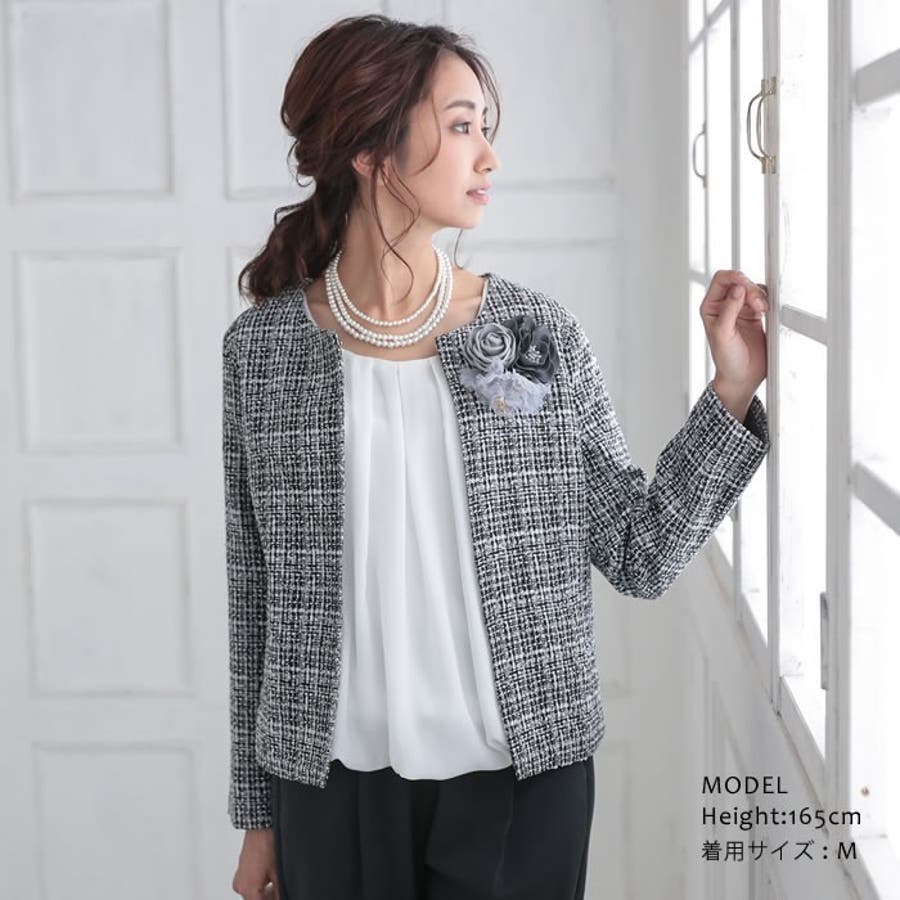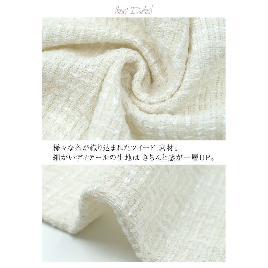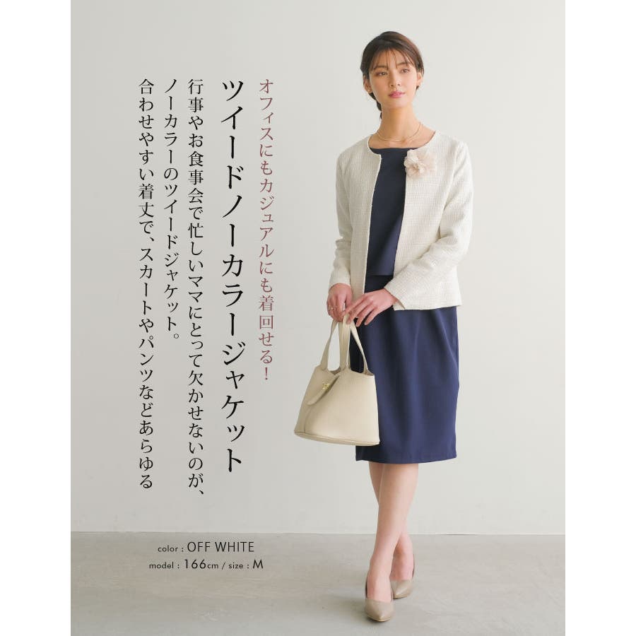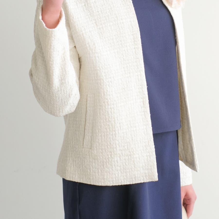 セレモニーでもデイリーでも着回しできる!上品ツイード素材ノーカラージャケット パ…