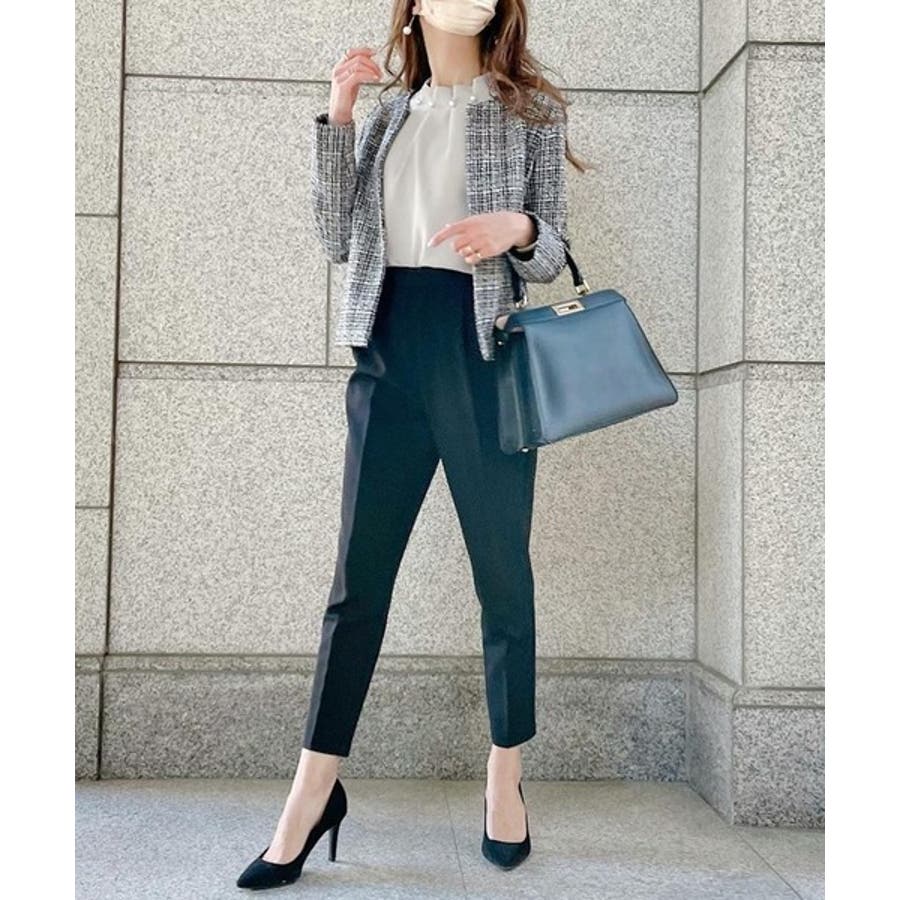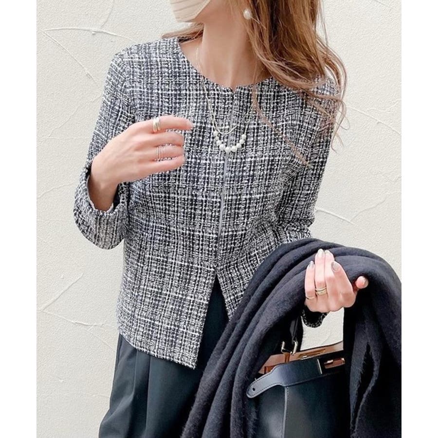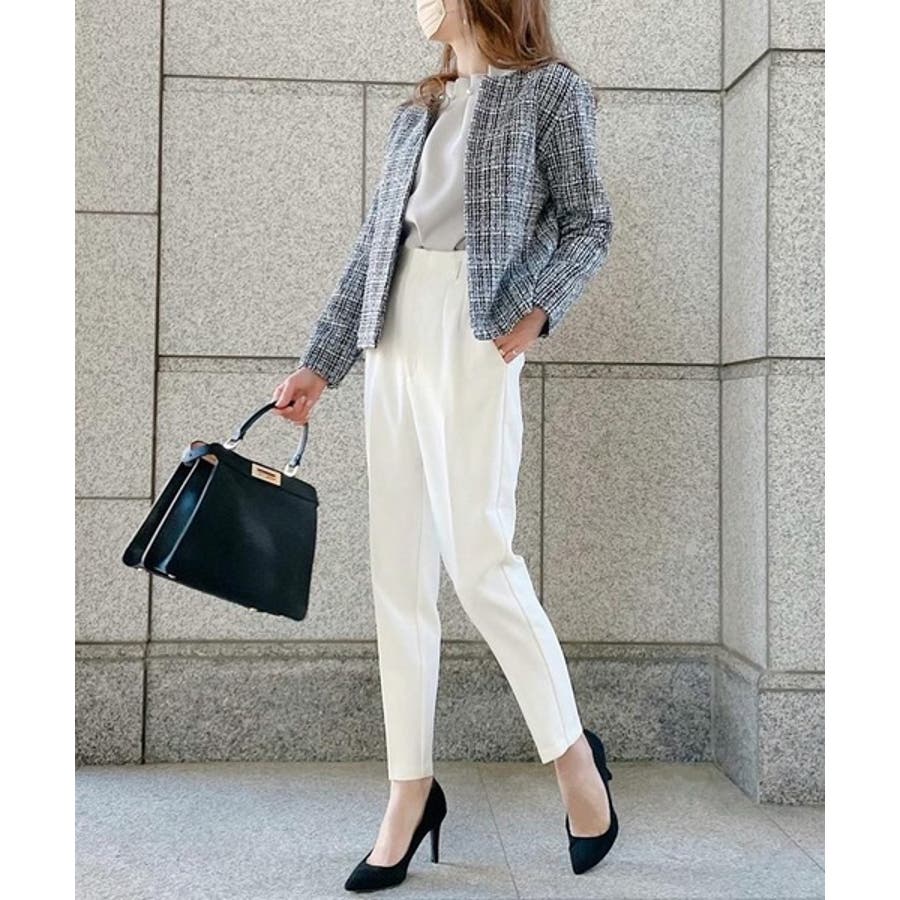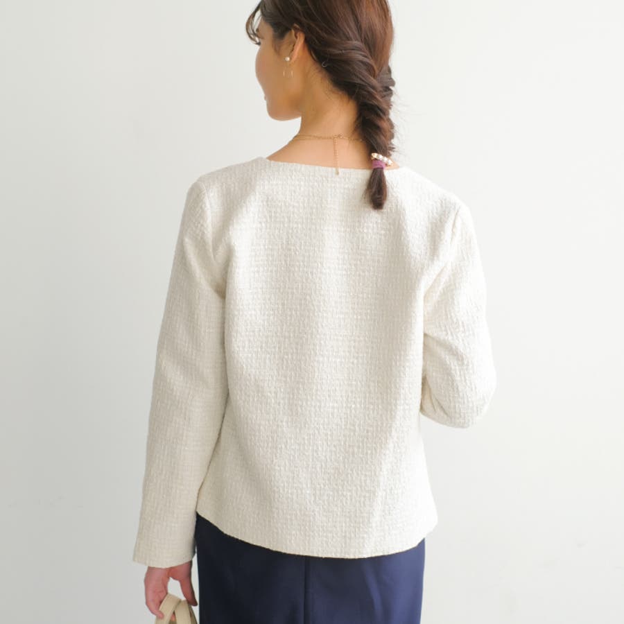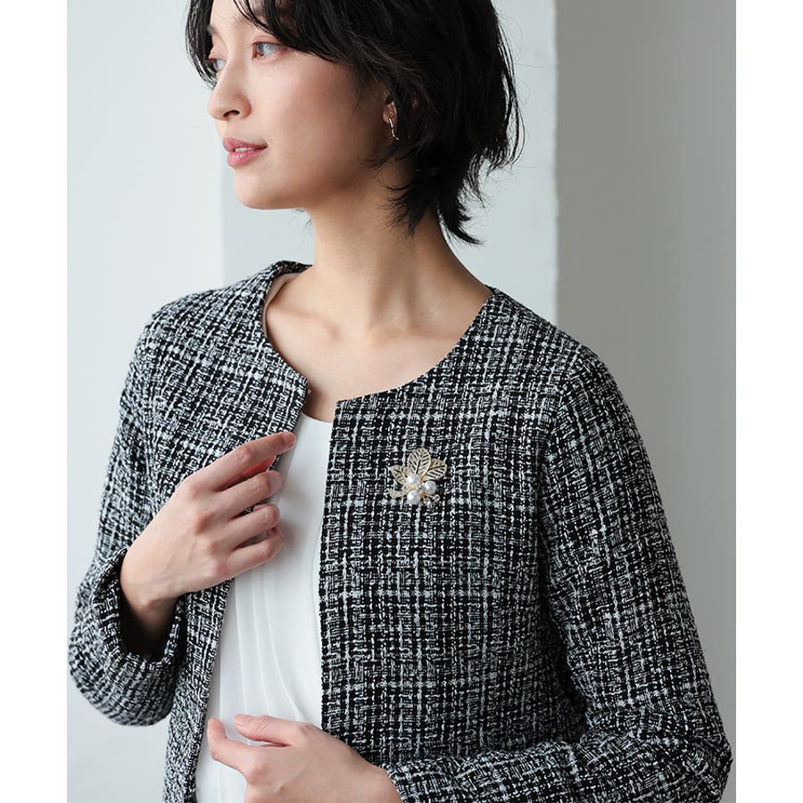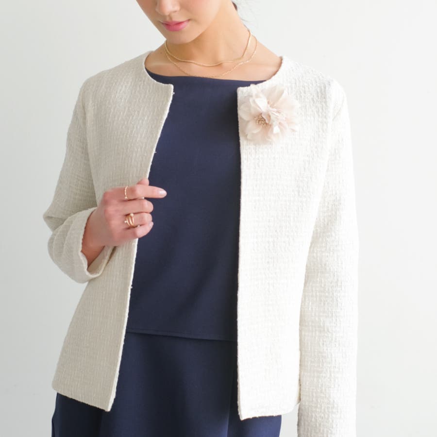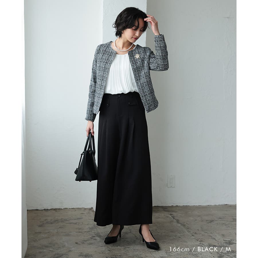 セレモニーでもデイリーでも着回しできる!上品ツイード素材ノーカラージャケット パ…