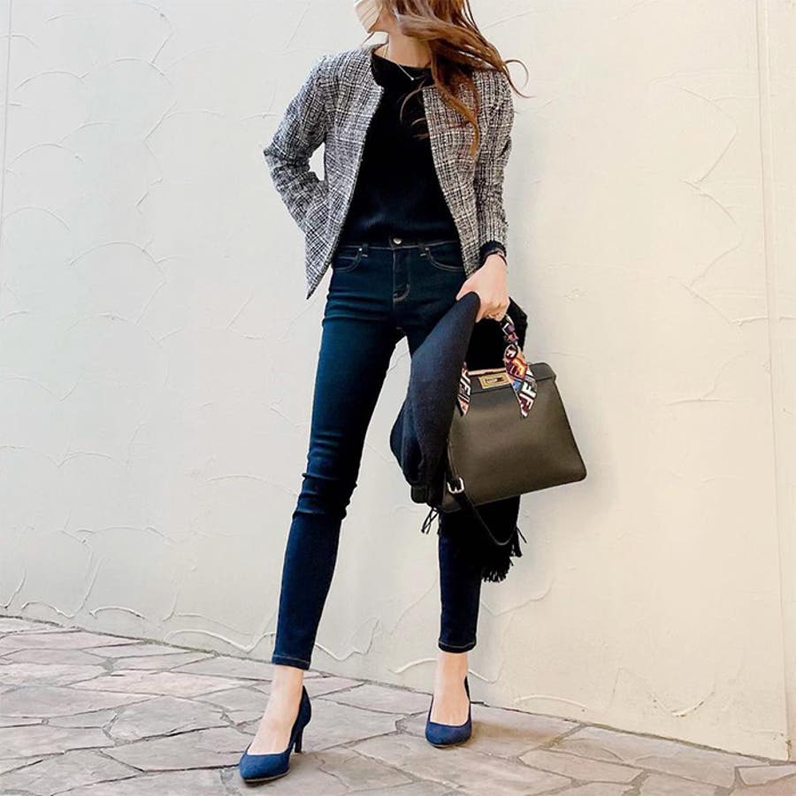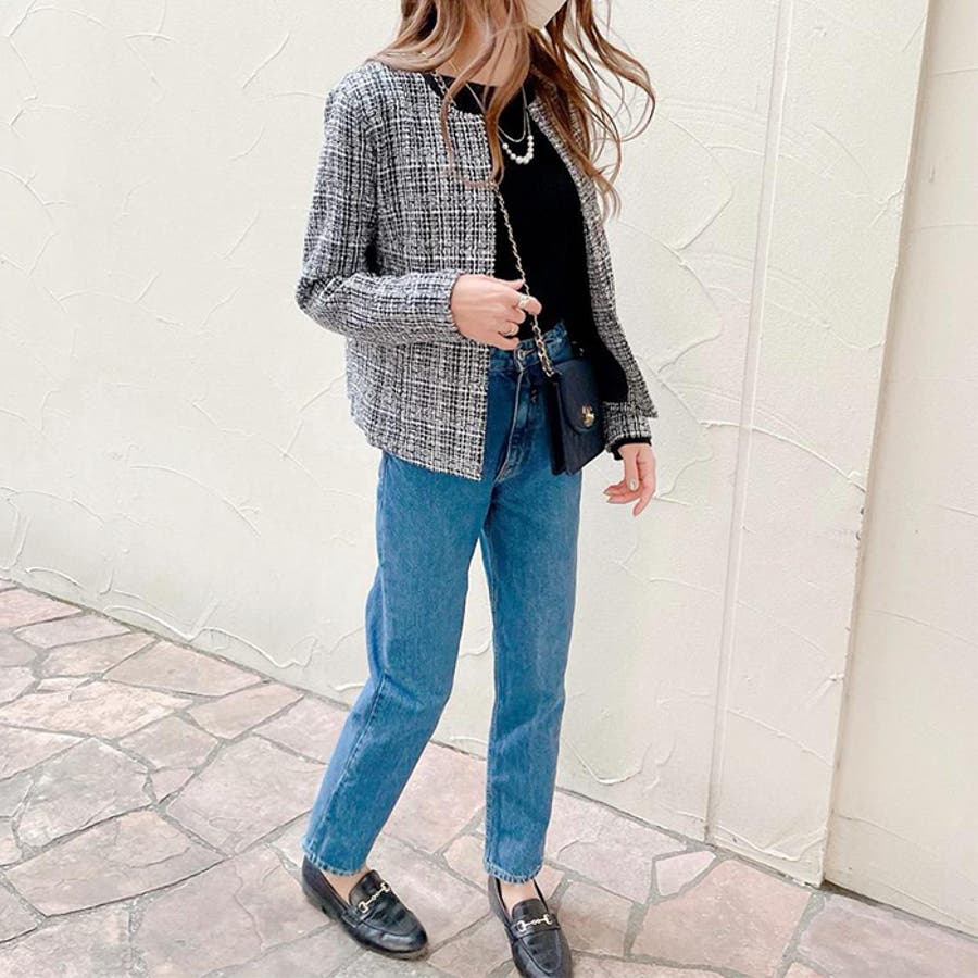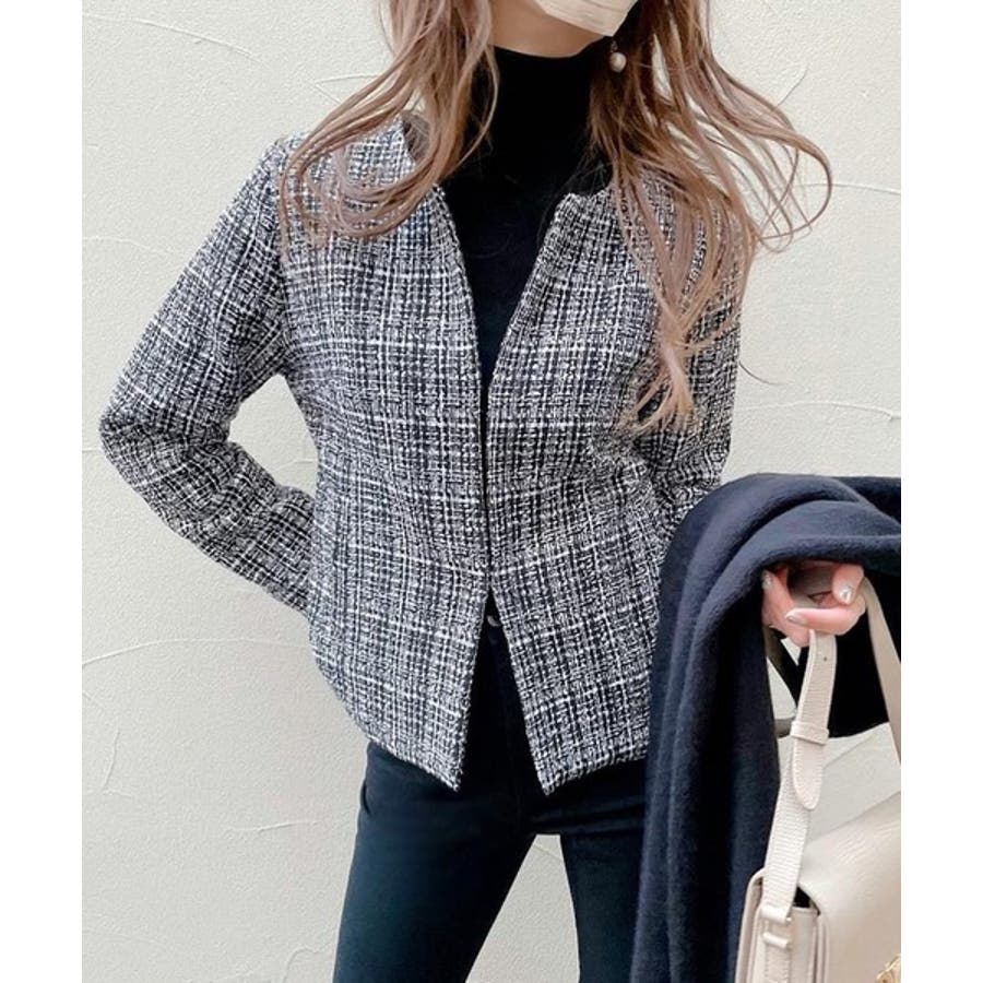行事やお食事会で忙しいママにとって欠かせないのが、ノーカラーのツイードジャケット。