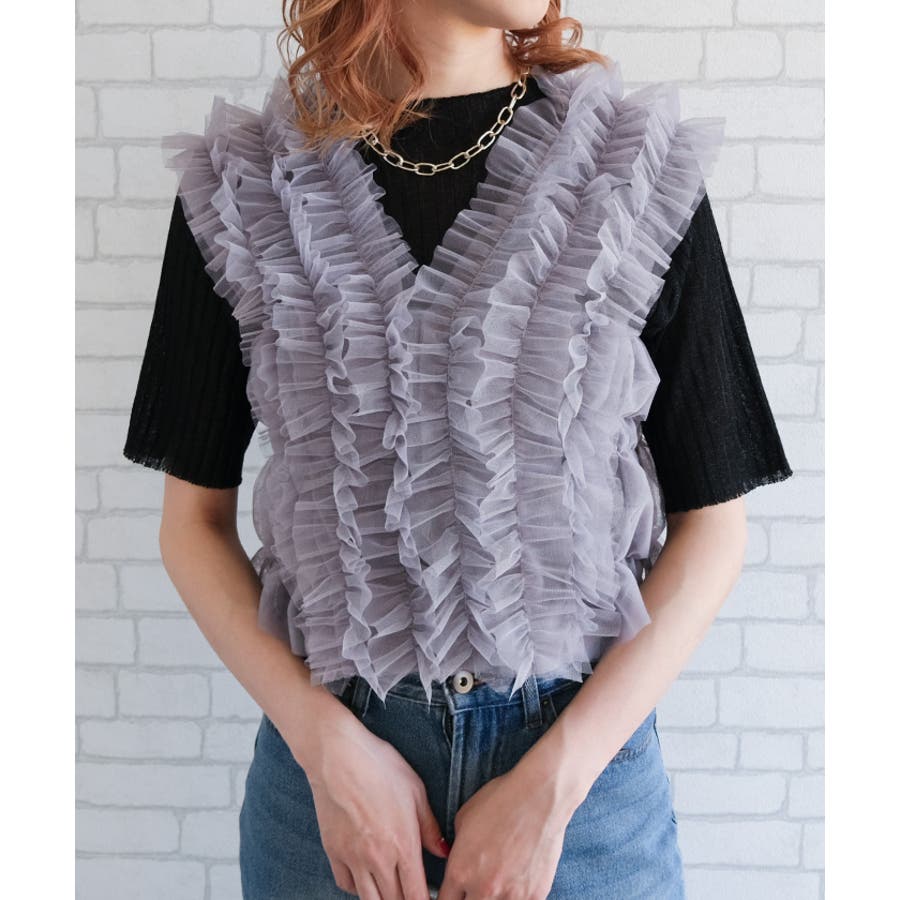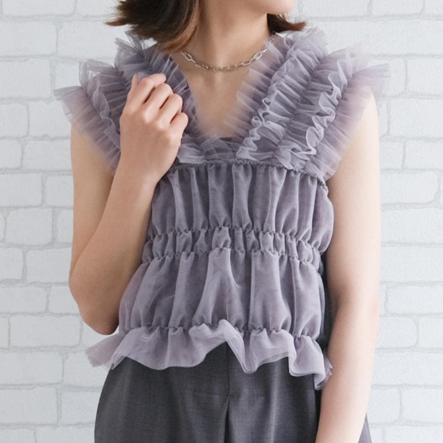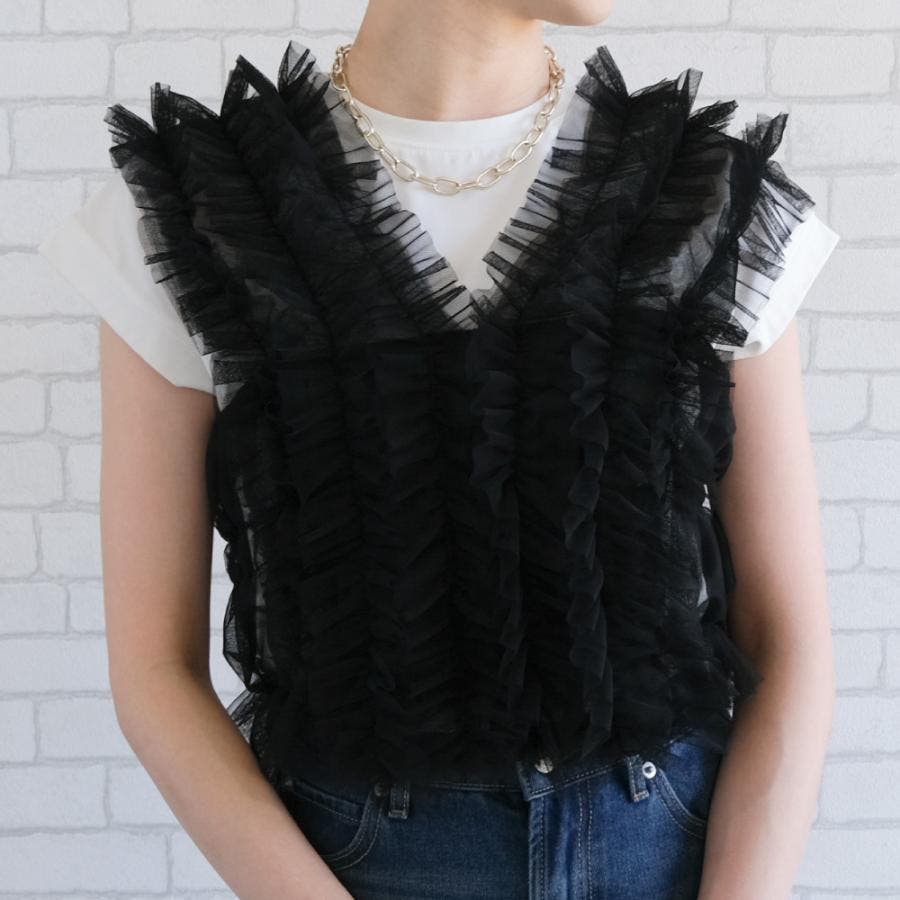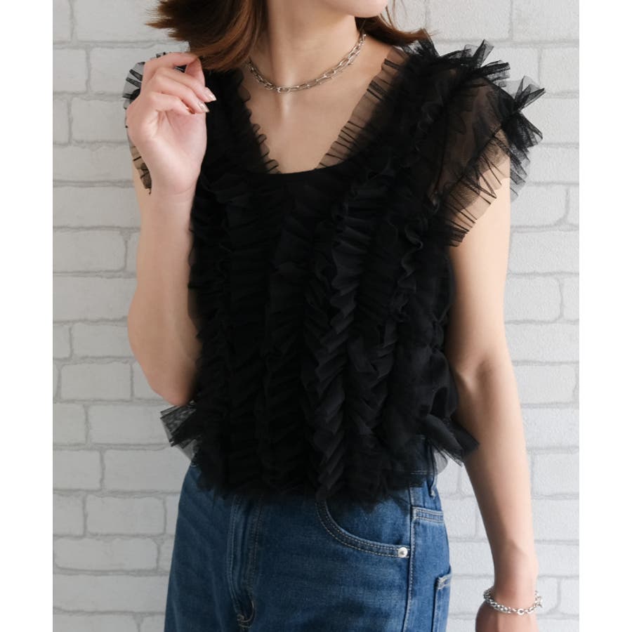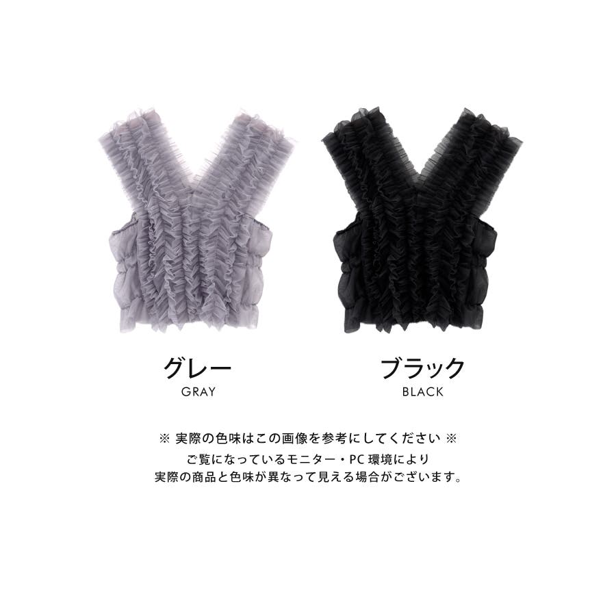 シアー感のある繊細なチュールを重ねたチュールフリルタンクビスチェ