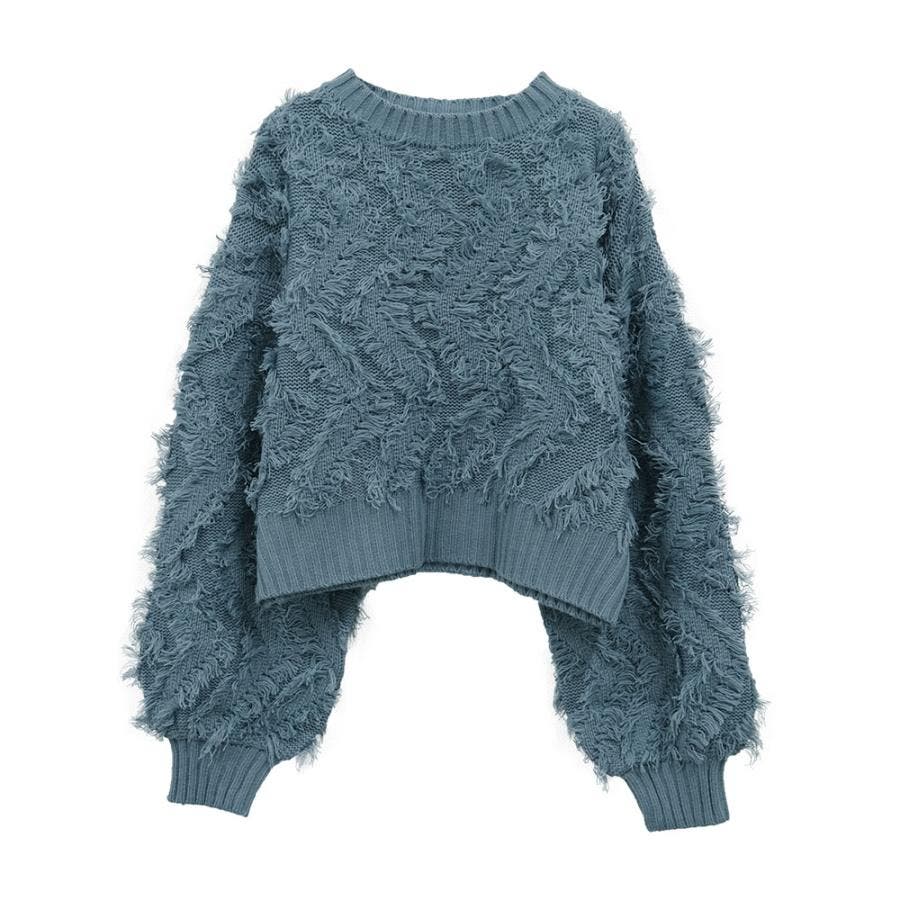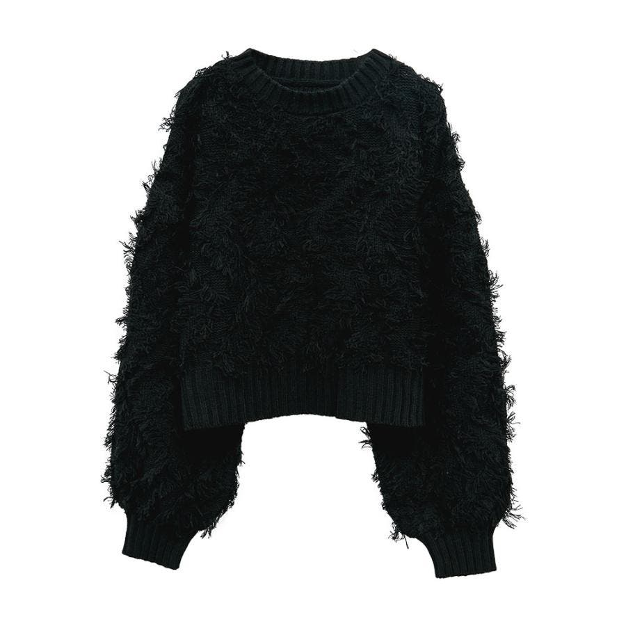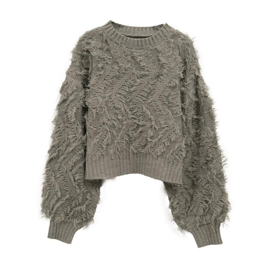 表情豊かなフリンジデザインが目を引くジャガードショート丈ニットトップス