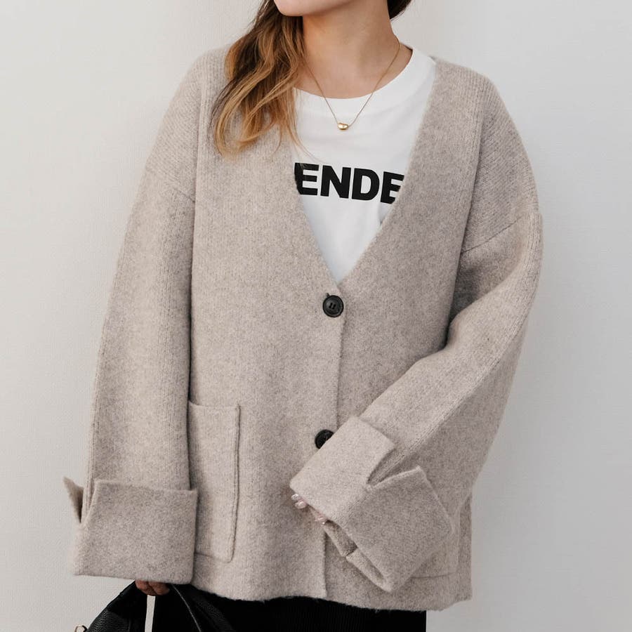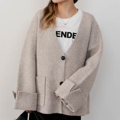 大人の抜け感をさりげなく演出してくれる、ワイドスリーブノーカラーニットジャケット。