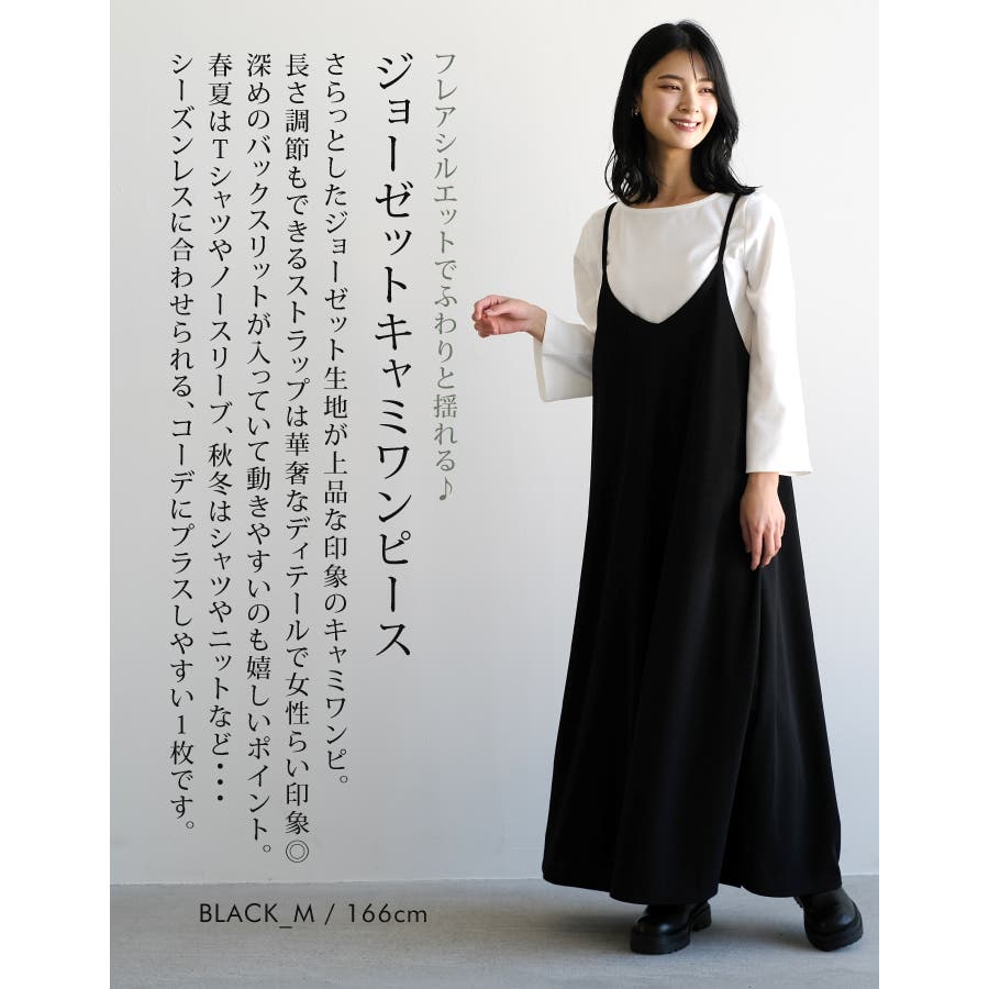 さらっとしたジョーゼット生地が上品な印象のキャミワンピ。 長さ調節もできるストラップは華奢なディテールで女性らい印象。 深めのバックスリットが入っていて動きやすいのも嬉しいポイント。夏はTシャツやノースリーブ、秋冬はシャツやニットなど・・・ シーズンレスに合わせられる、コーデにプラスしやすい1枚です。