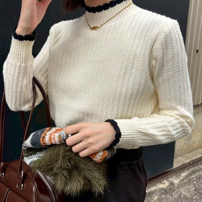 長めにとったリブに首元や袖口、裾の配色がちょっとしたアクセントに丁度いいリブ編みニット