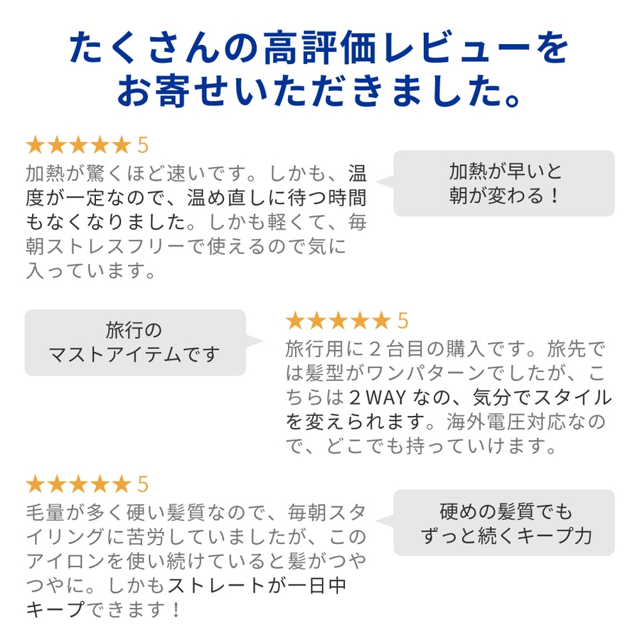 投稿日:2022.04.24ショートボブの私も、ミディアムヘアの母も使えるサイズ感でした!!以前使っていた他アイロンよりも温まるのが早くて助かります!