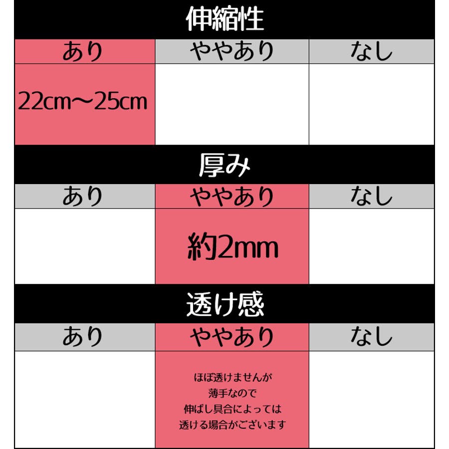 ディティール | 生地の厚さ:普通 伸縮性:あり(画像を参照) 透け感:ほぼなし(薄い色は引き延ばすと若干透けて見える場合がございますが、基本的には透け感はほぼありません) |