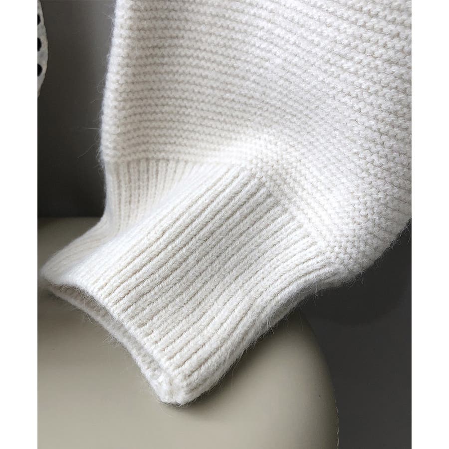 襟から裾までの横リブ編みとシルバーカラーの金属ボタンがプラスαに