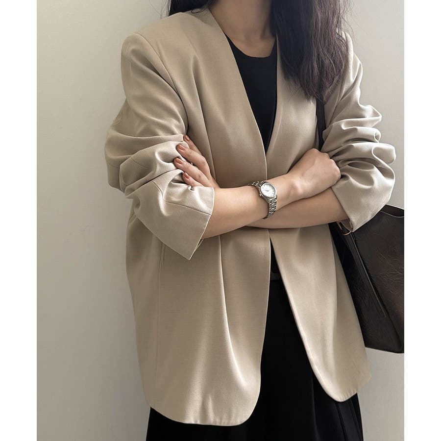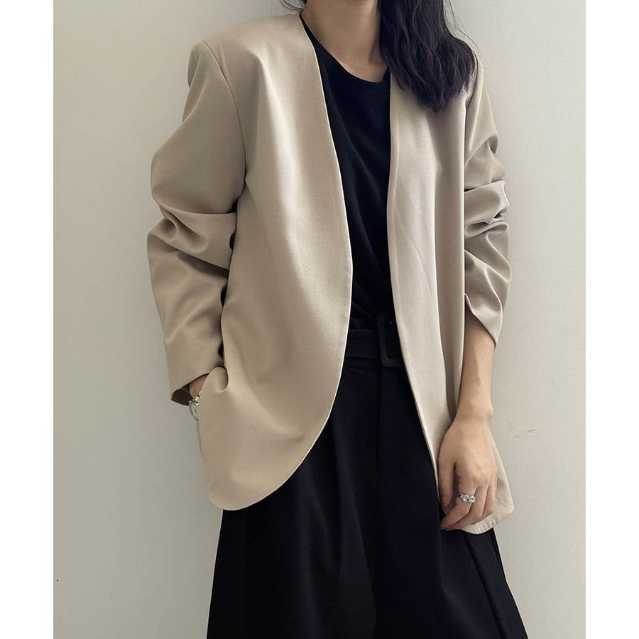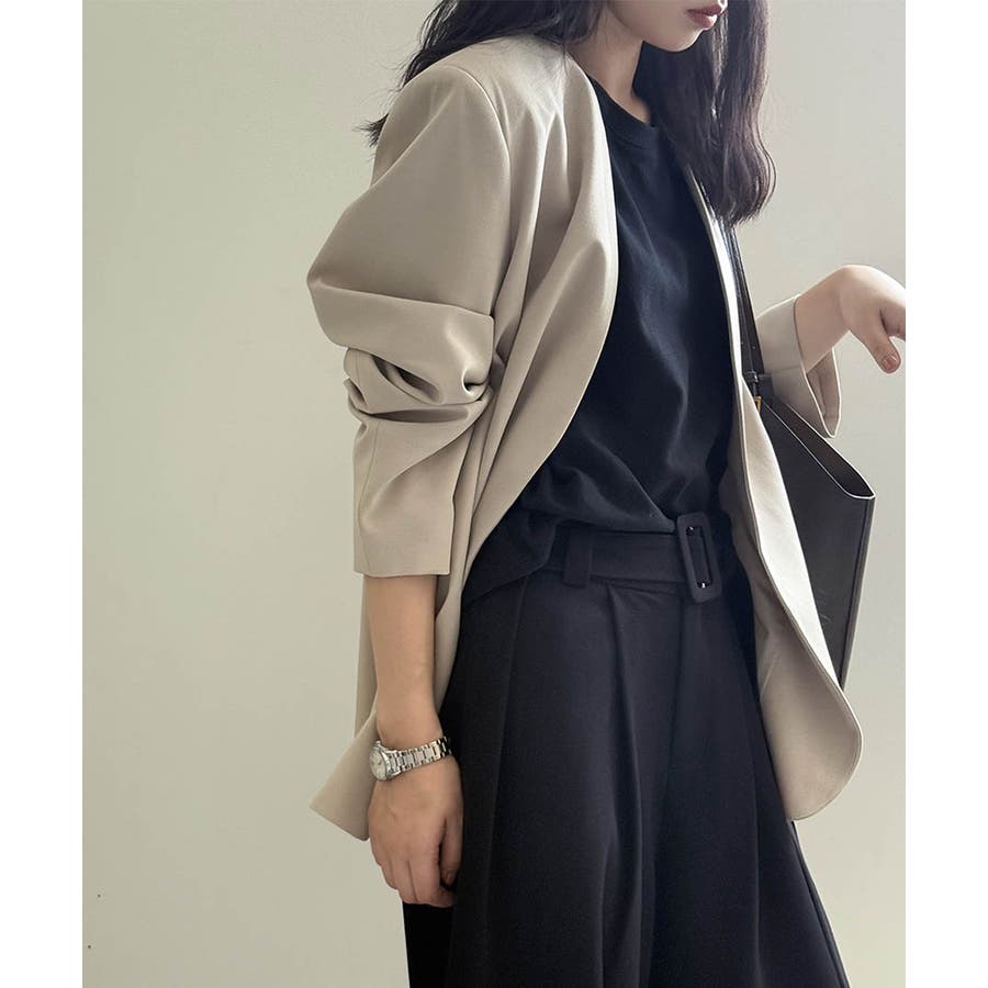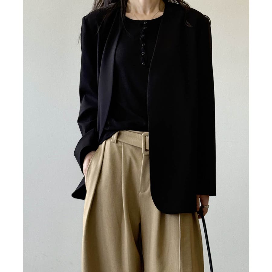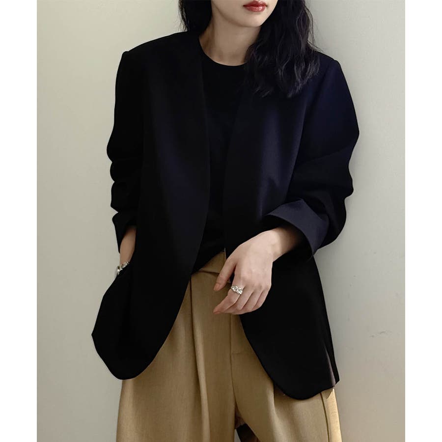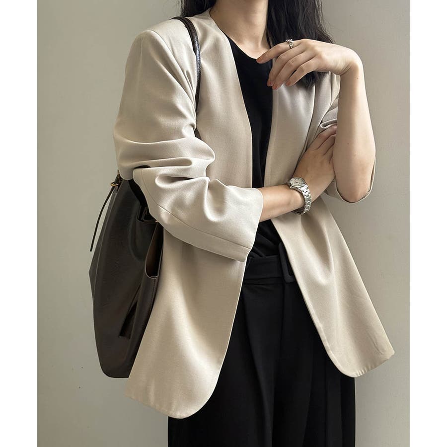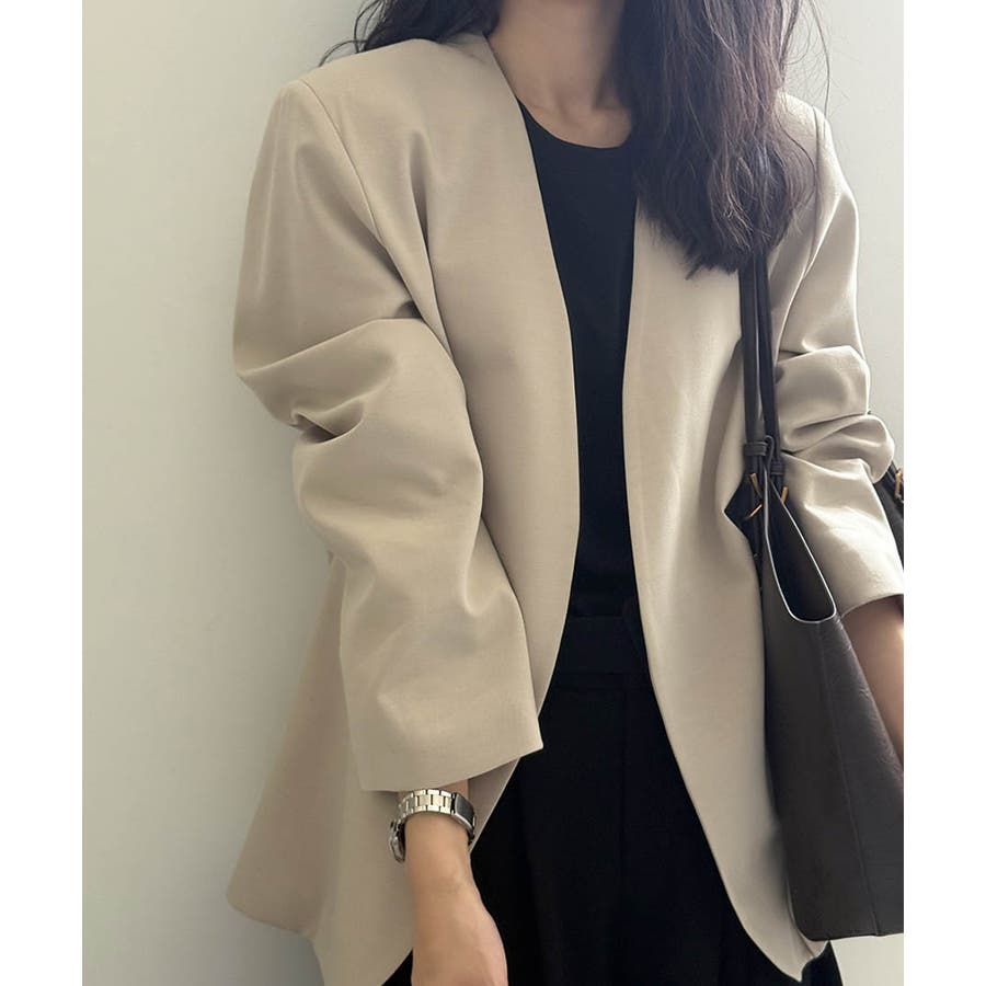 襟がないデザインとルーズなシルエットが相まって、かっちりしすぎず、程よいカジュアルさやこなれ感を出すことができます。