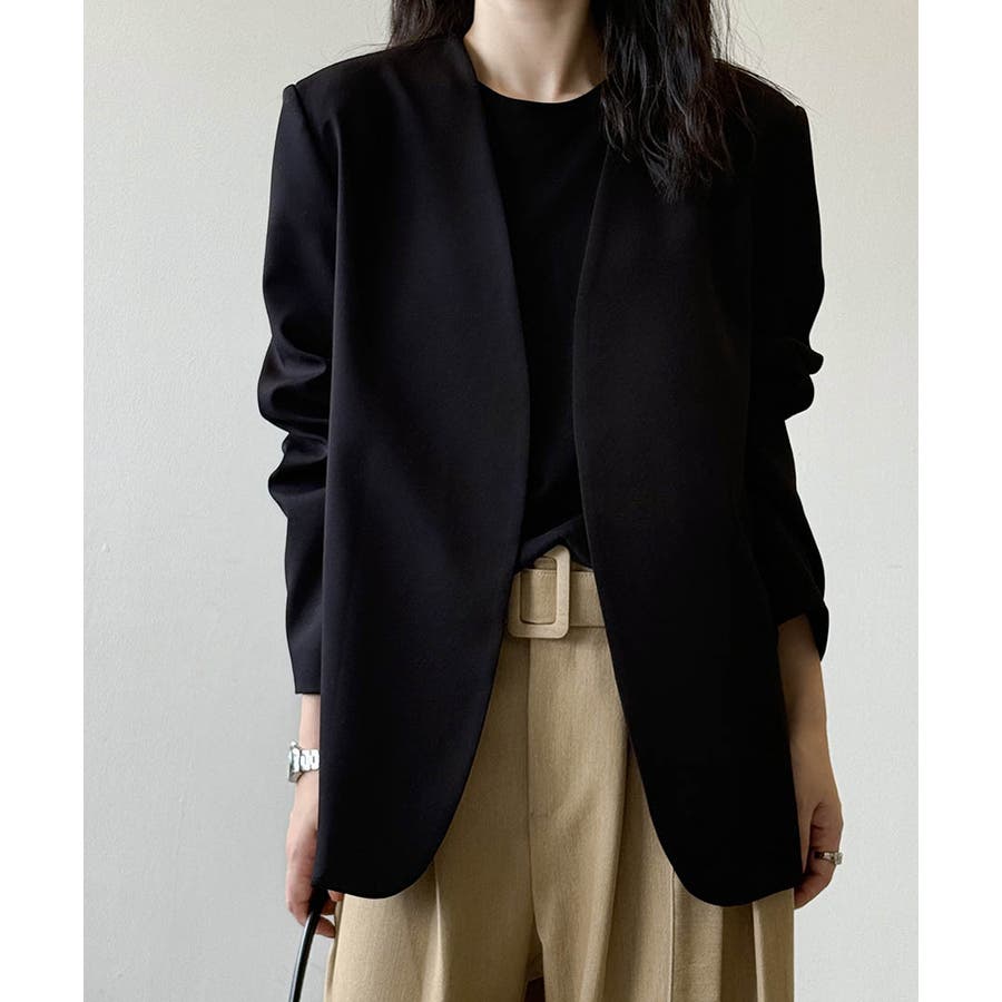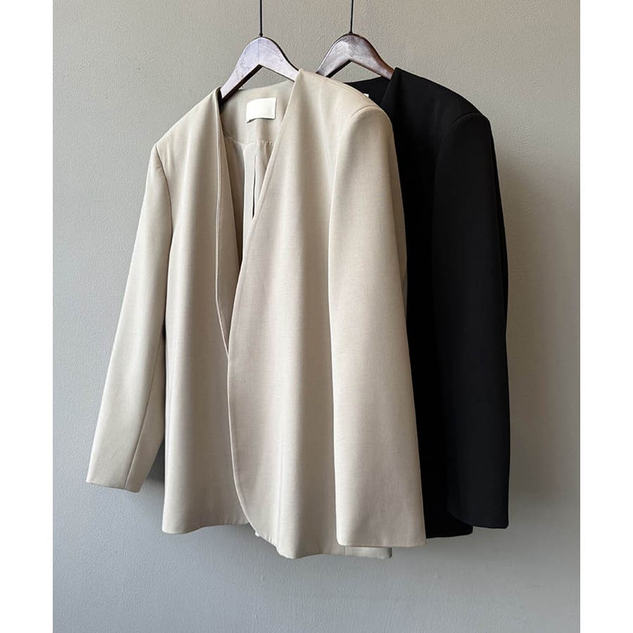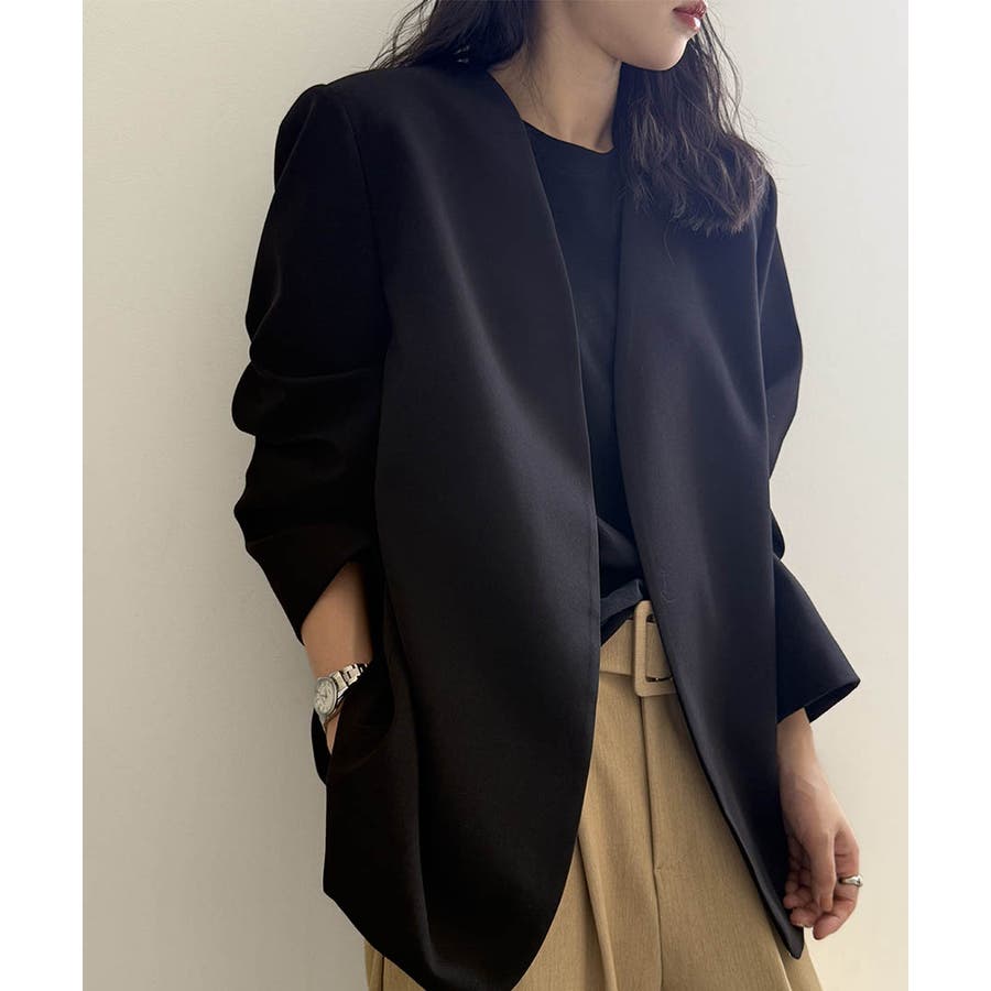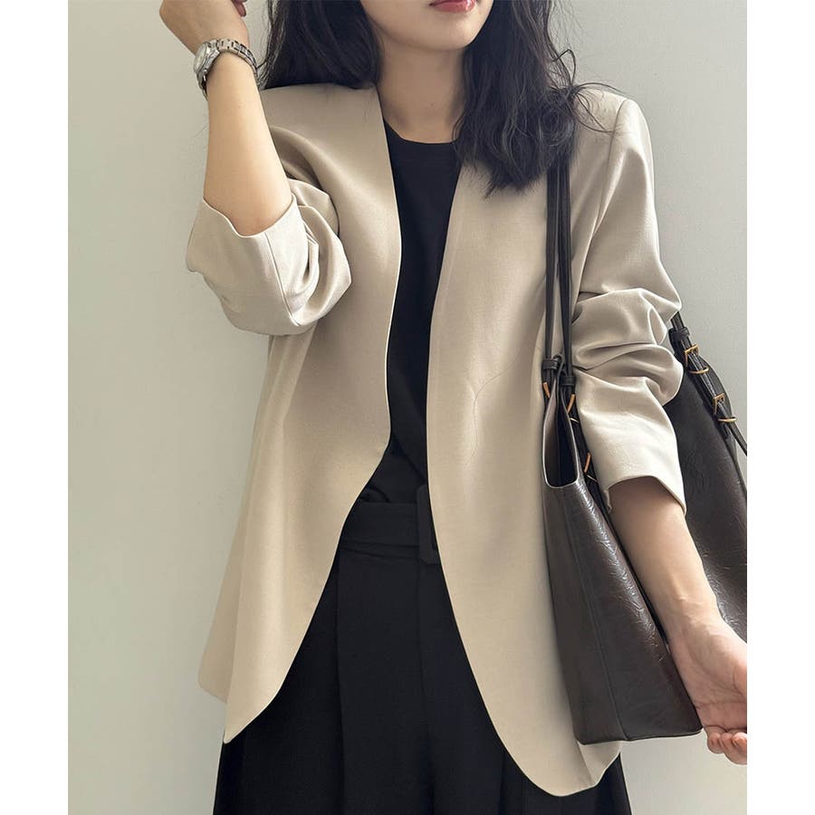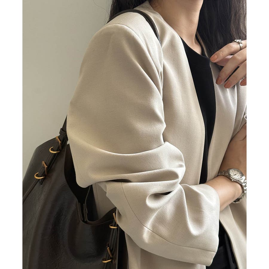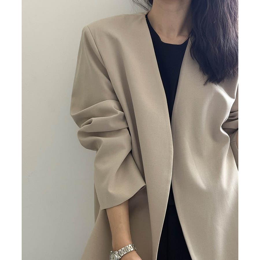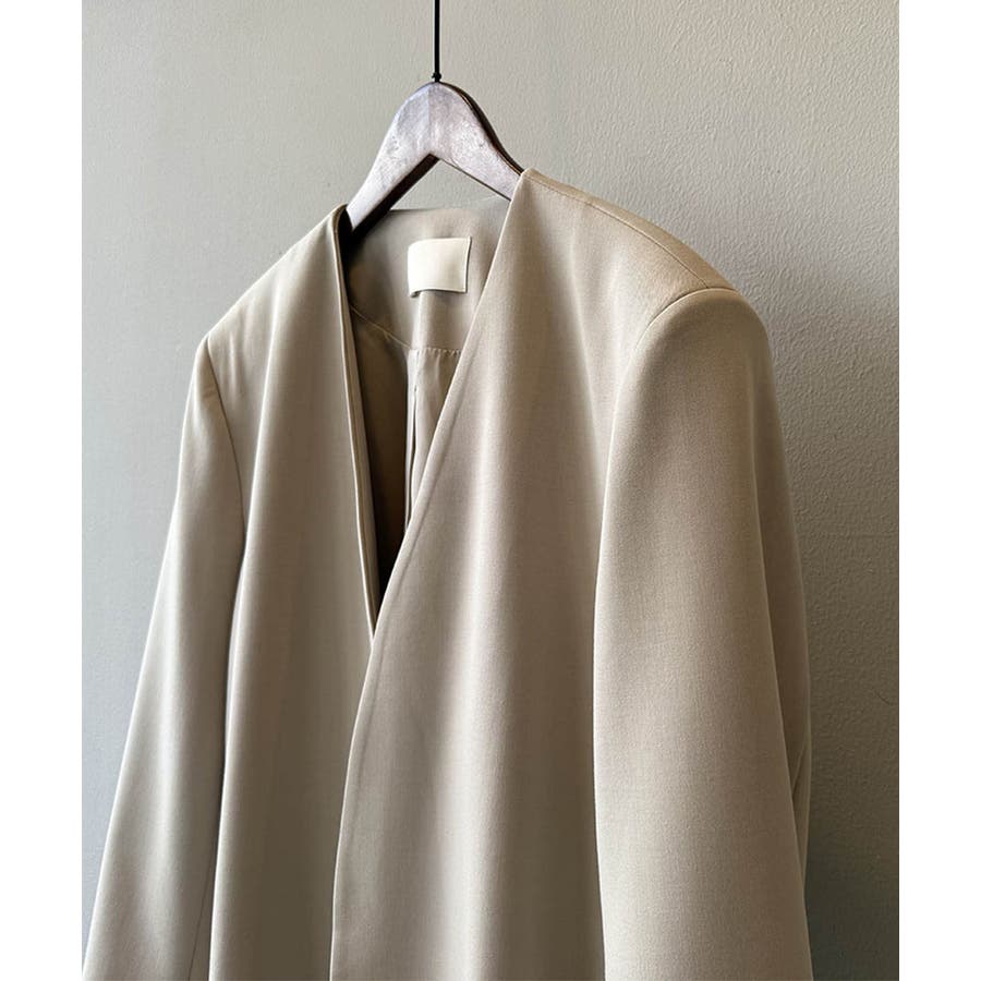 襟がないデザインとルーズなシルエットが相まって、かっちりしすぎず、程よいカジュアルさやこなれ感を出すことができます。