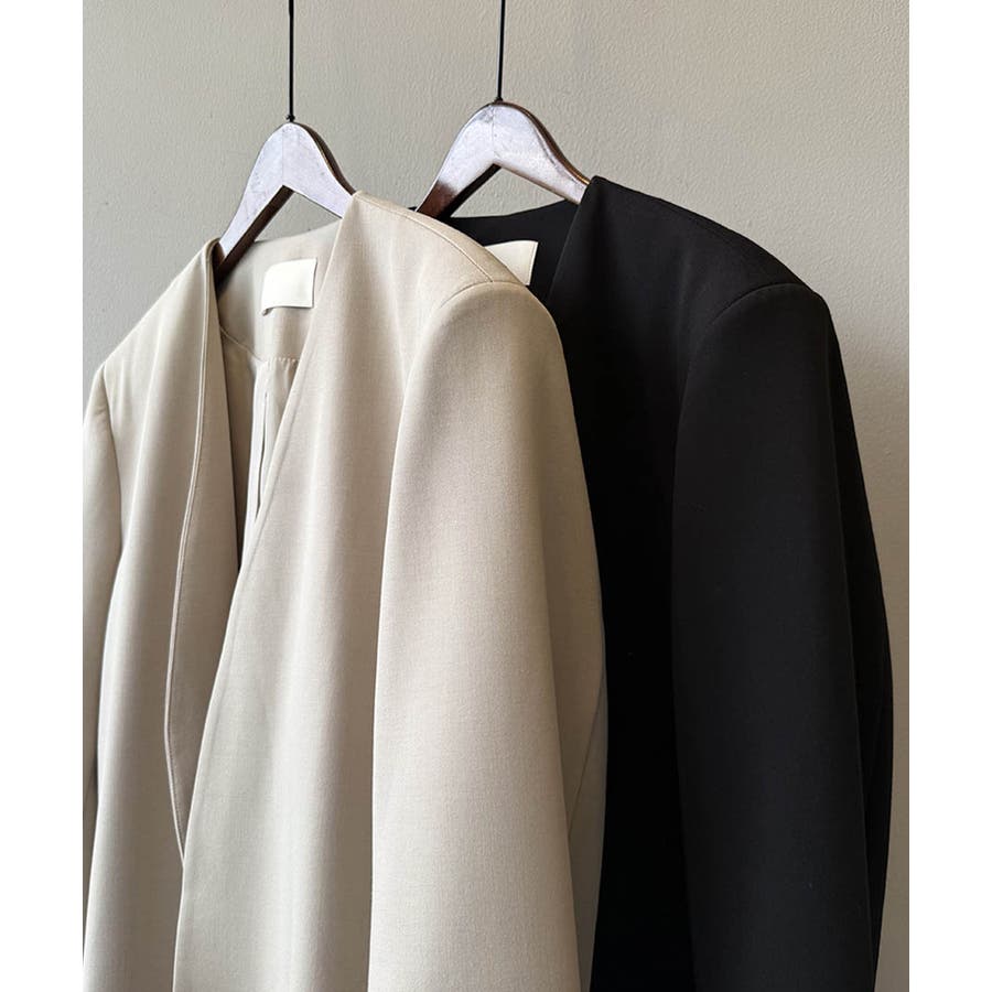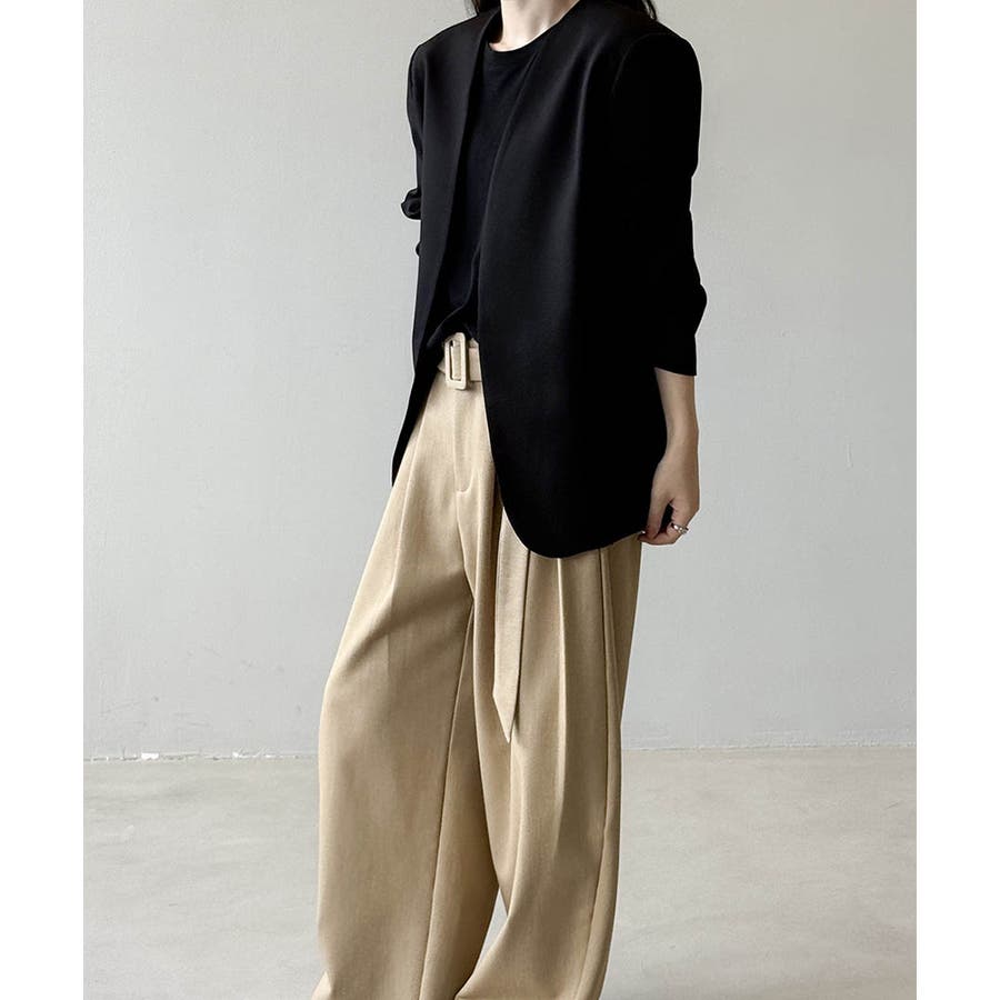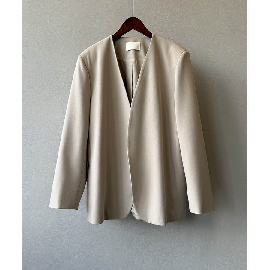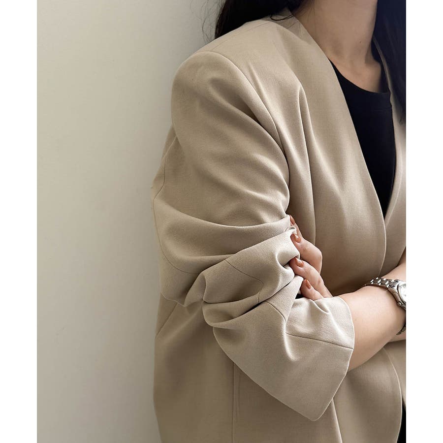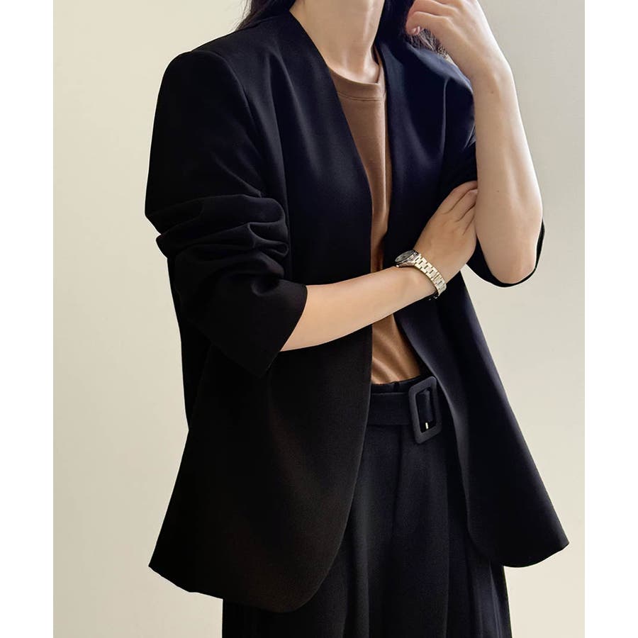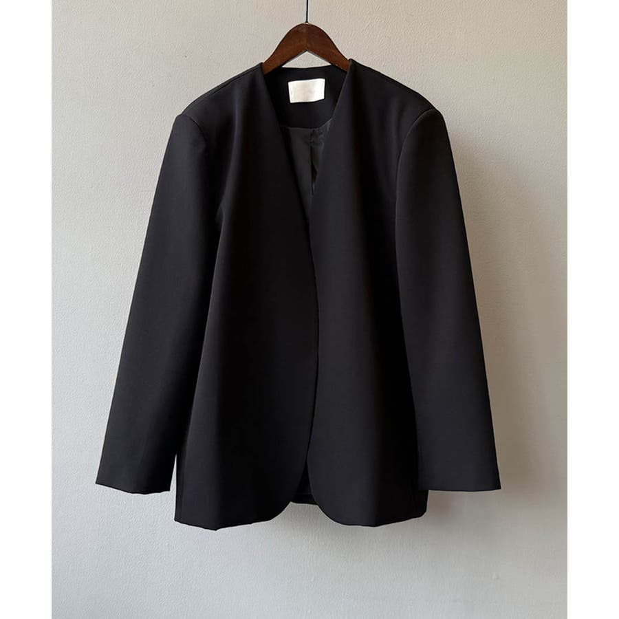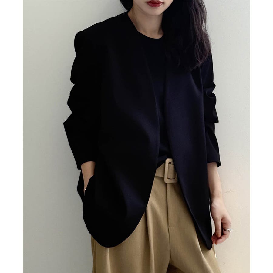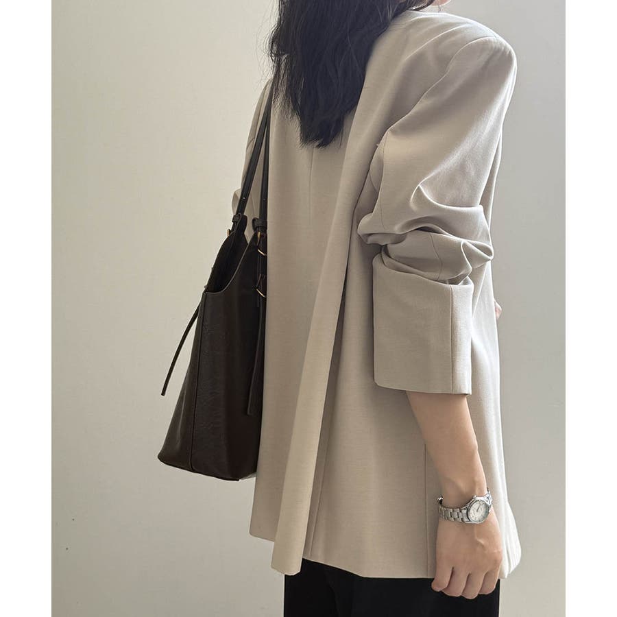襟がないデザインとルーズなシルエットが相まって、かっちりしすぎず、程よいカジュアルさやこなれ感を出すことができます。