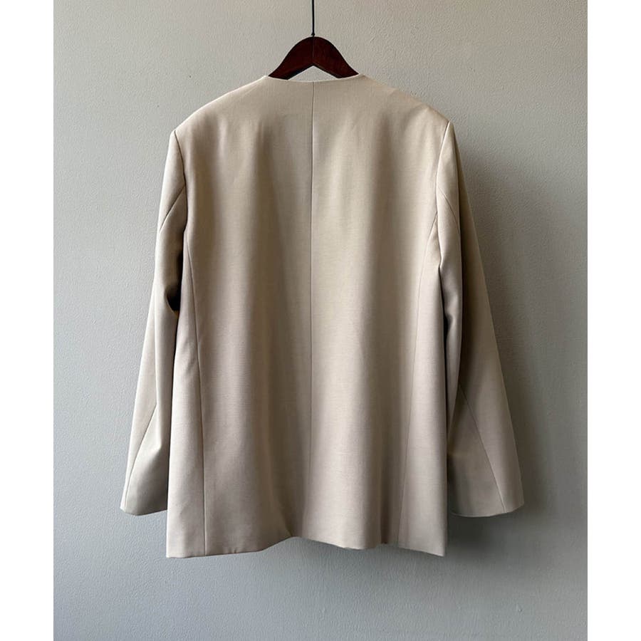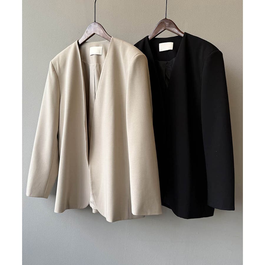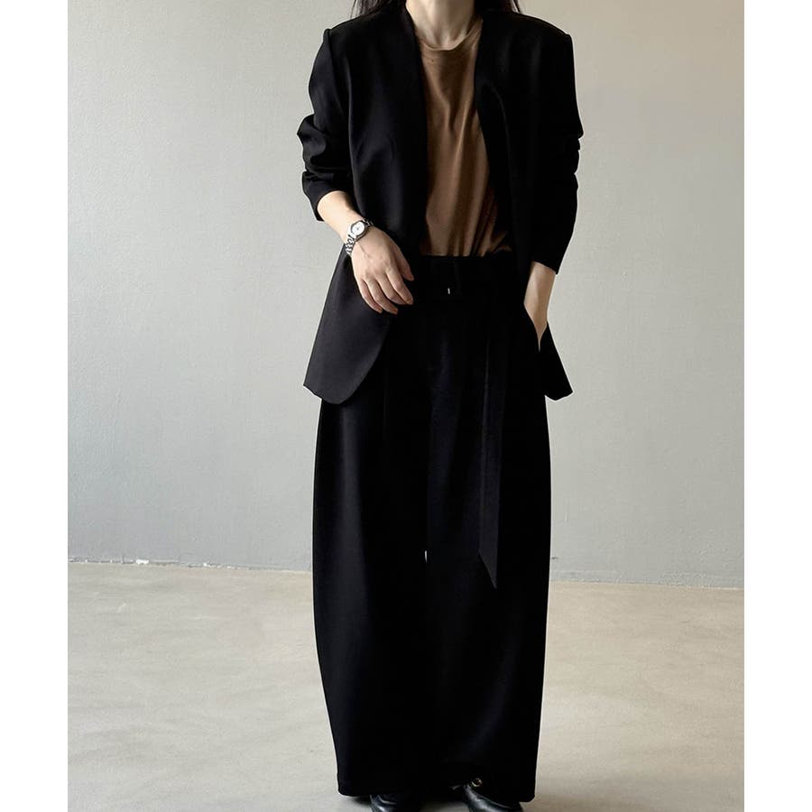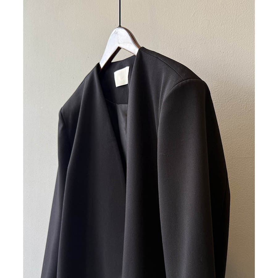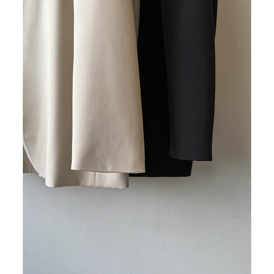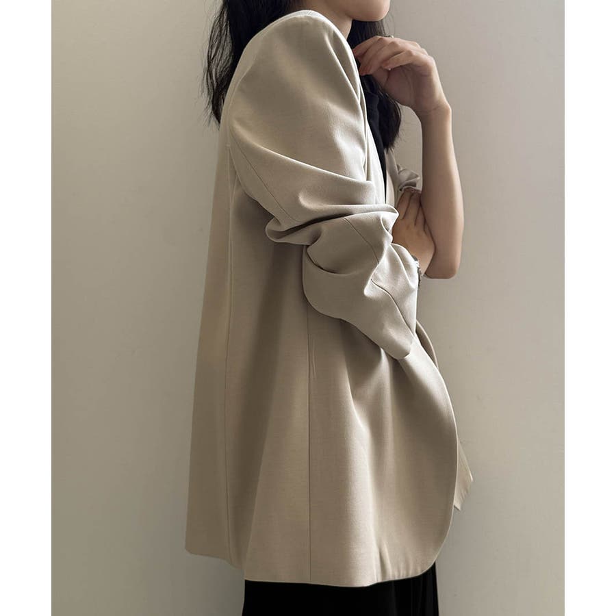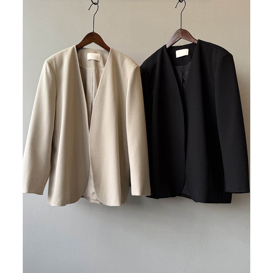 襟がないデザインとルーズなシルエットが相まって、かっちりしすぎず、程よいカジュアルさやこなれ感を出すことができます。