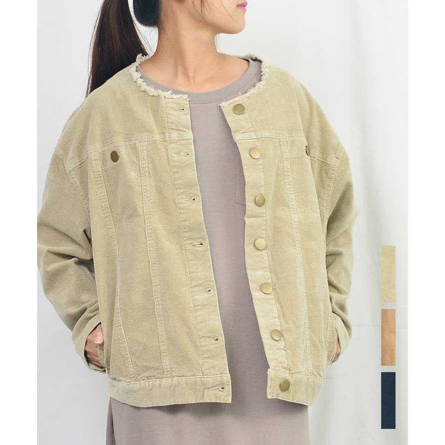まだ肌寒い季節に活躍する着心地が良いコ-デュロイ素材のノーカラージャケット。