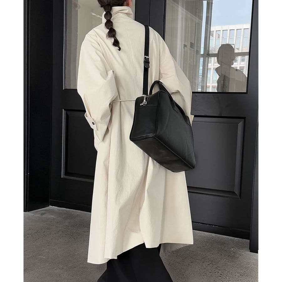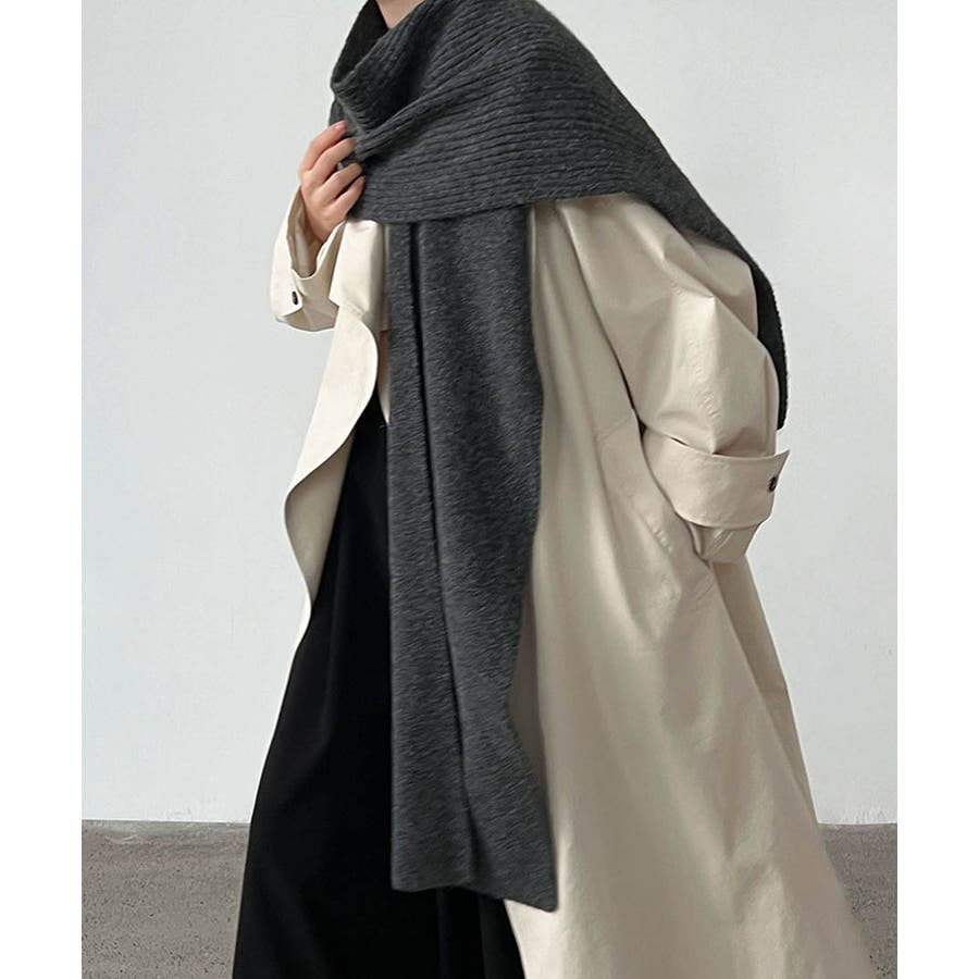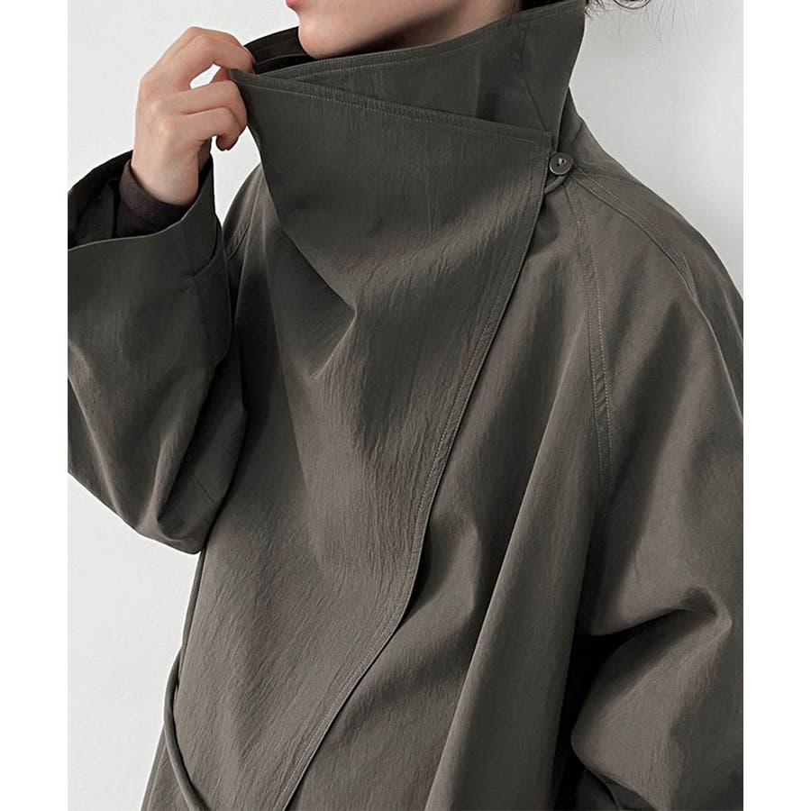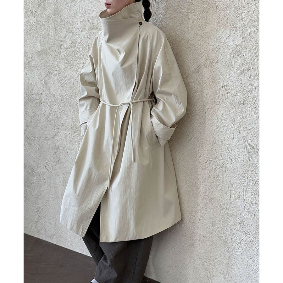 スタンドカラーの魅力: 襟を立てることで、首元をしっかりと覆い、凜とした知的な印象とモダンなムードを演出します。マフラー要らずで風を防ぐ機能性も兼ねています。