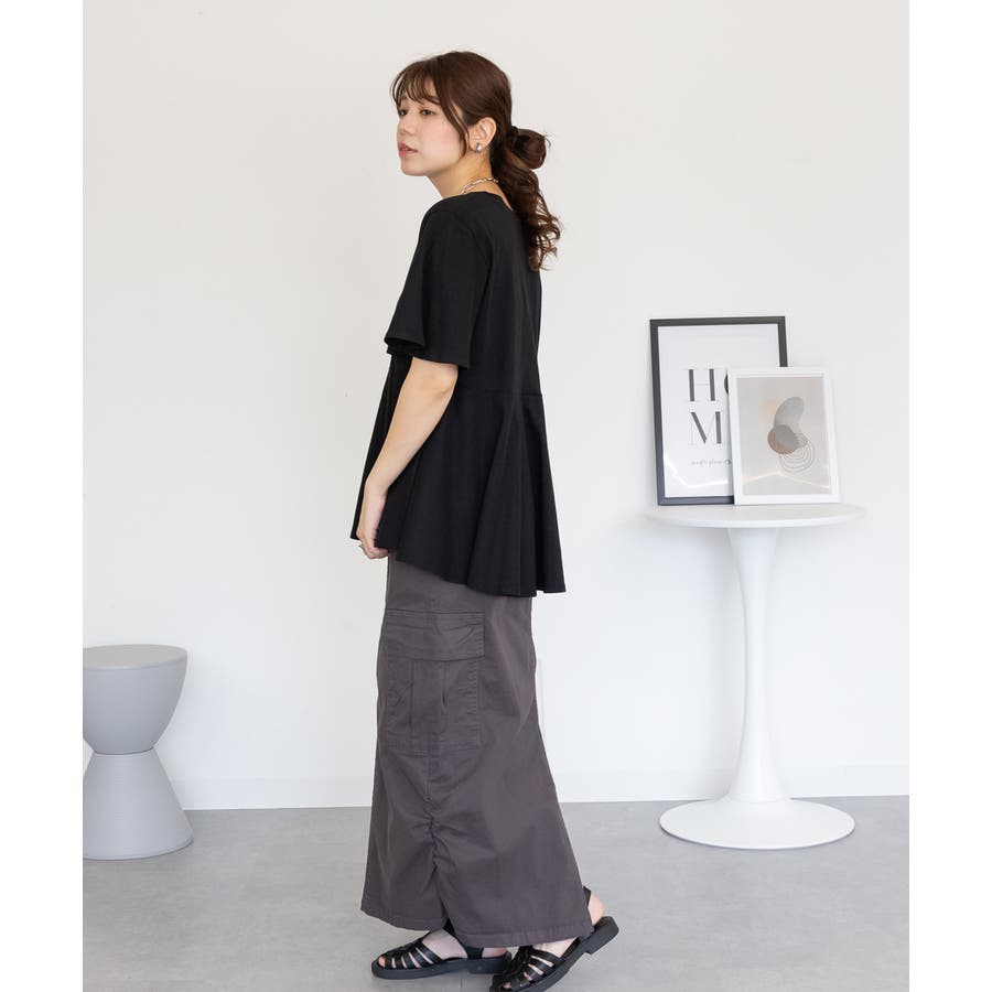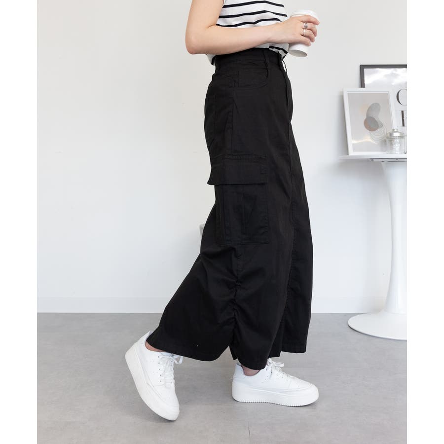 サイドのギャザーデザインが程よくアクセントになり、後ろスリット入りで足さばきもスムーズに。