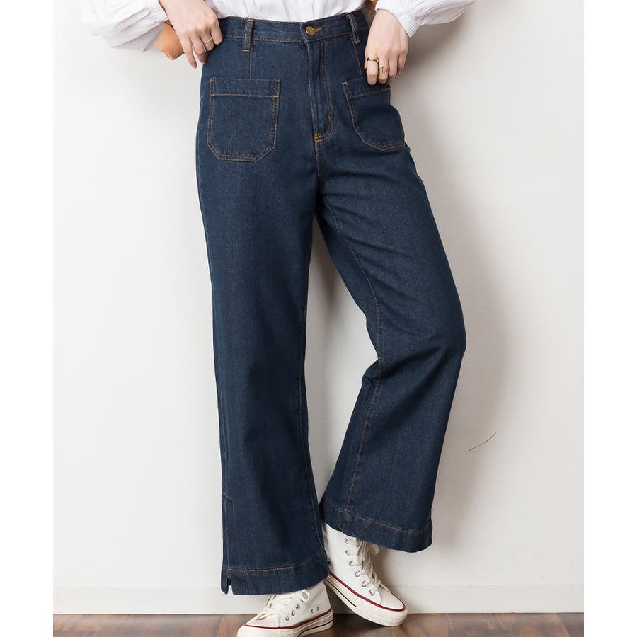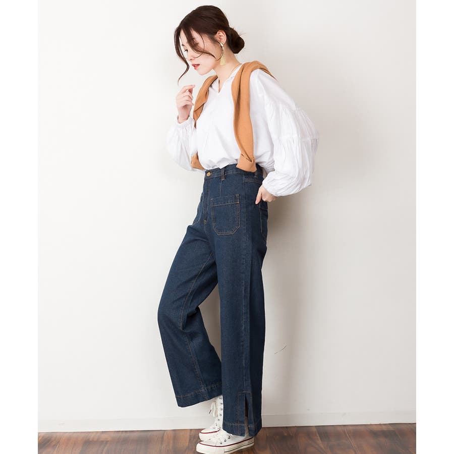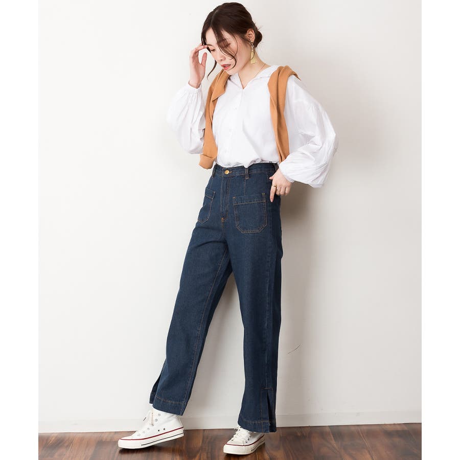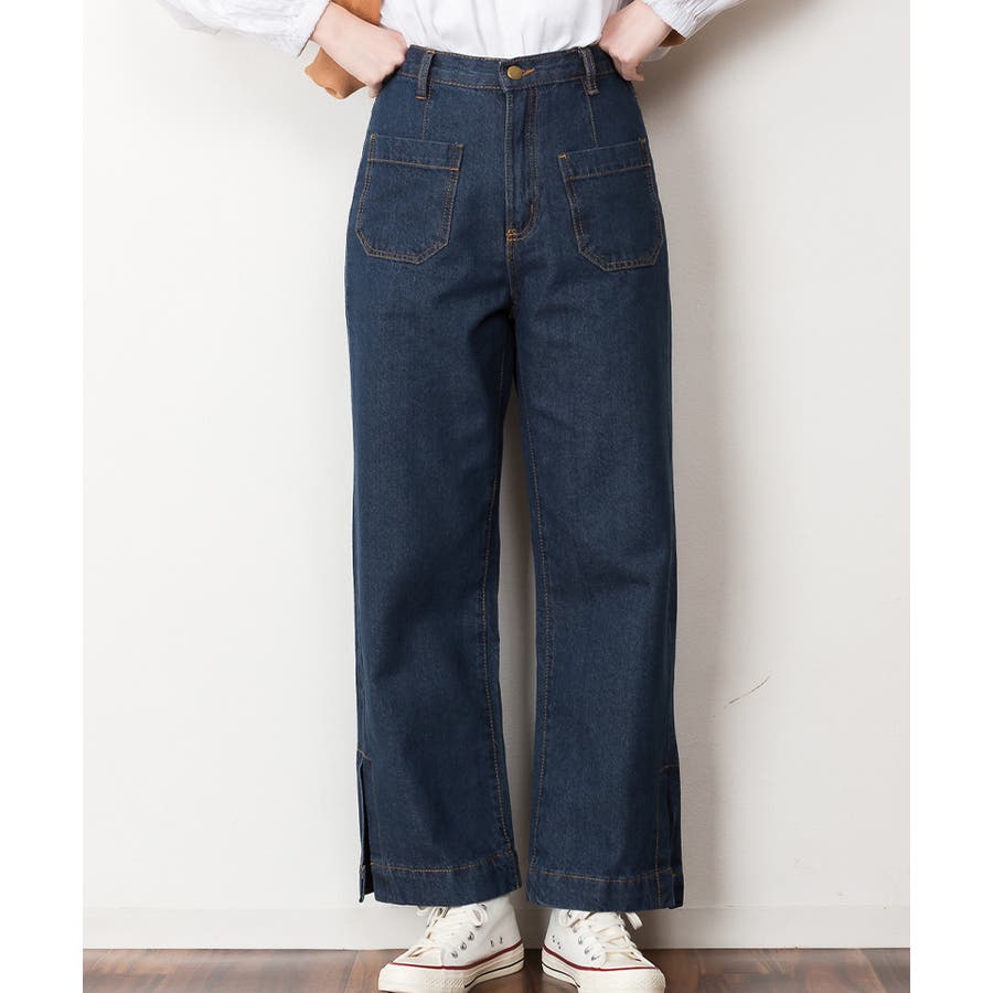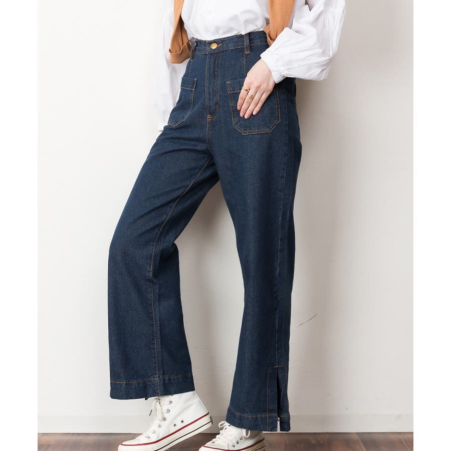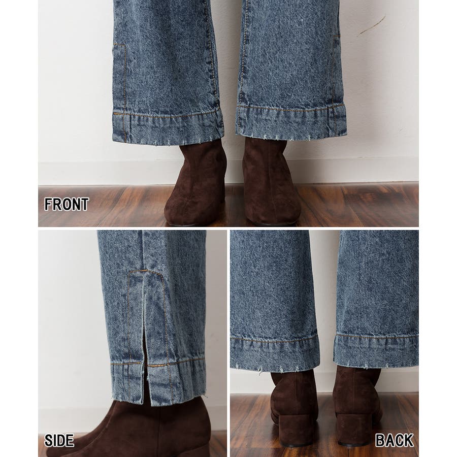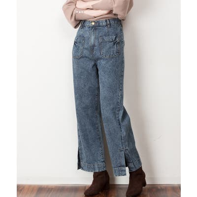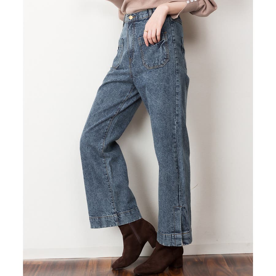 裾スリットデニムストレートパンツ