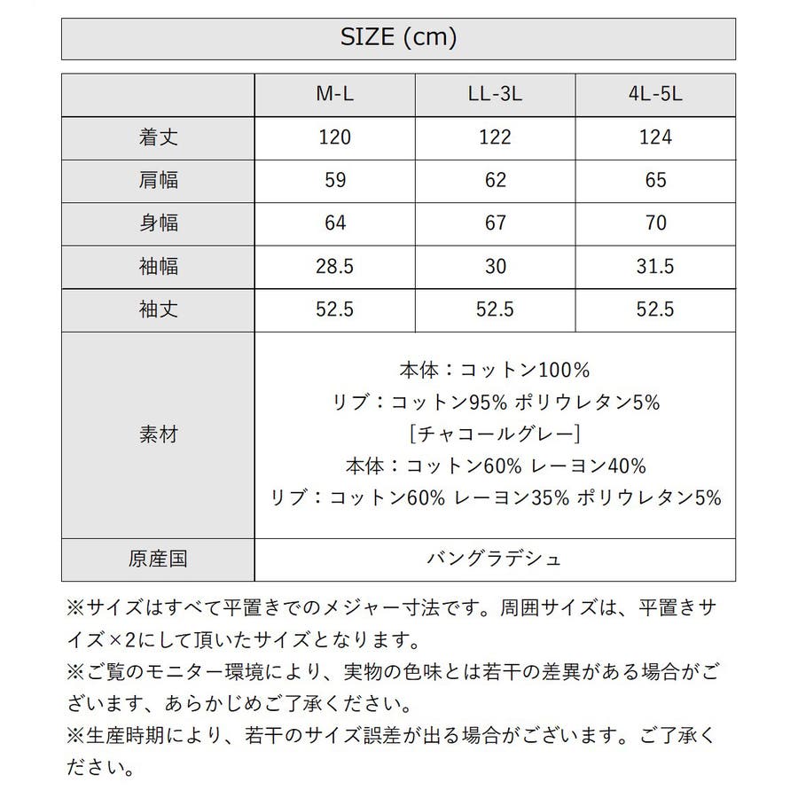 [LL-3Lサイズ]着丈122cm、肩幅62cm、身幅67cm、袖幅30cm、袖丈52.5cm