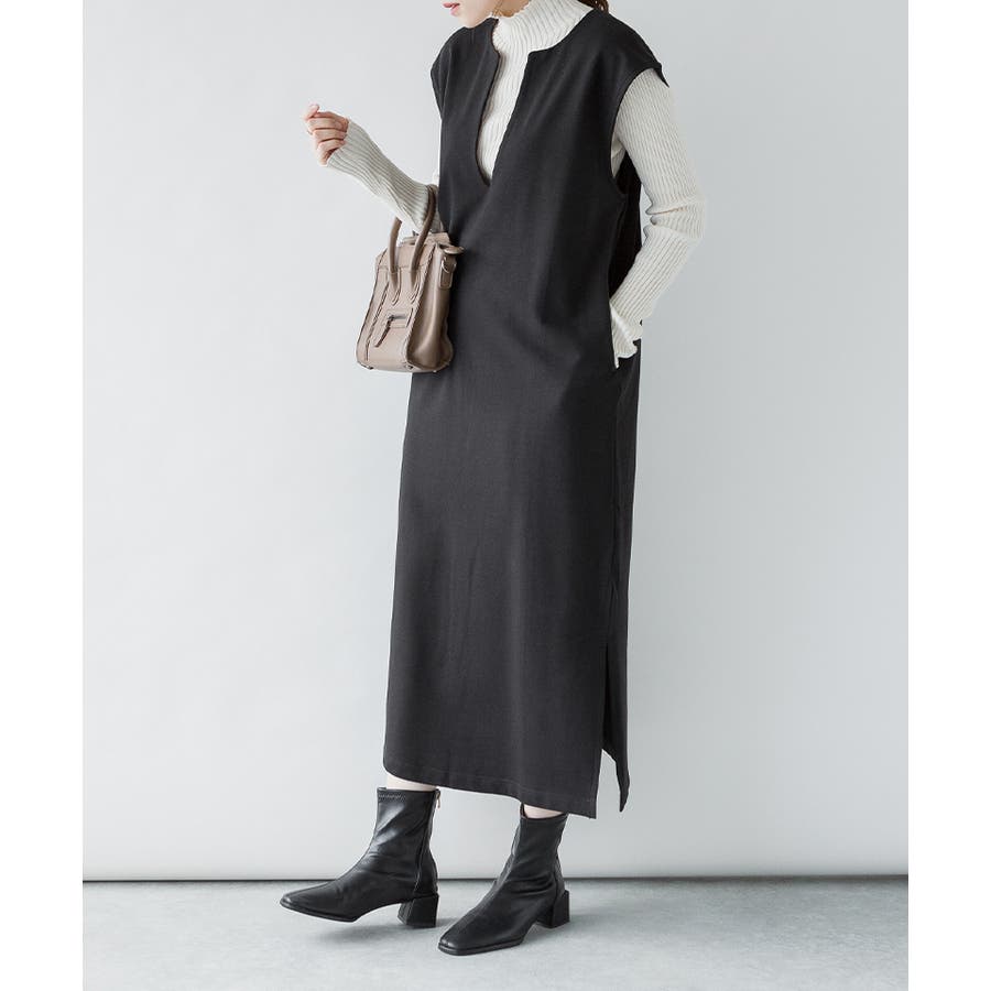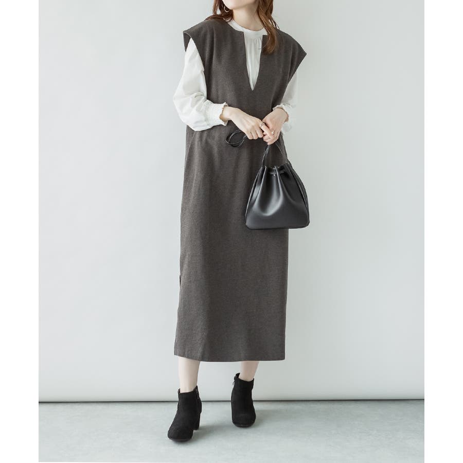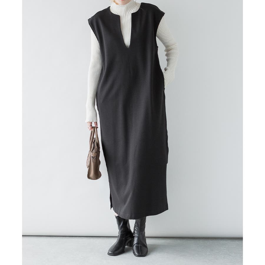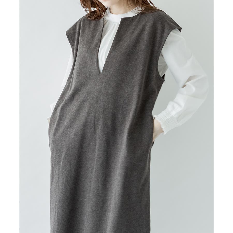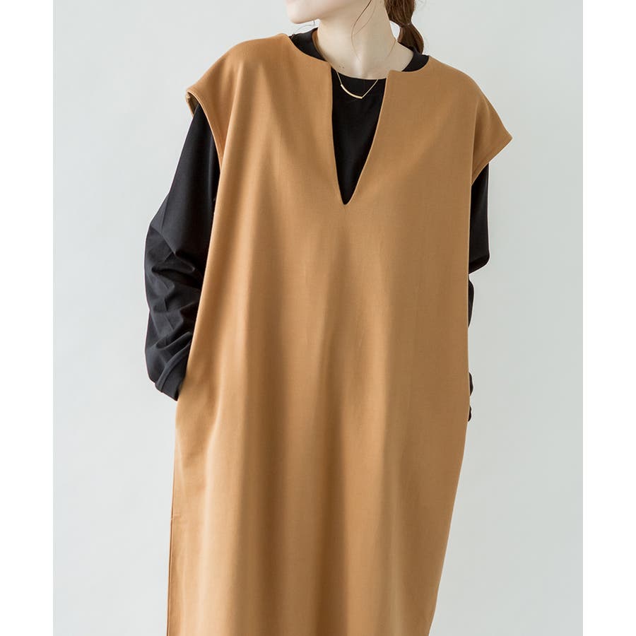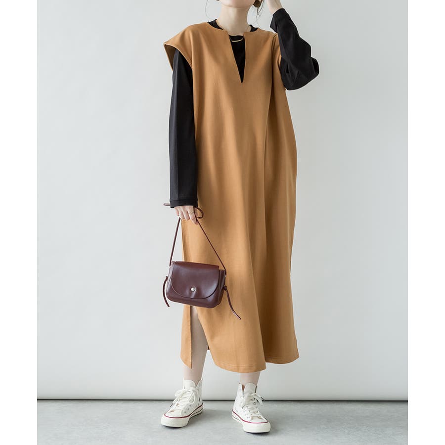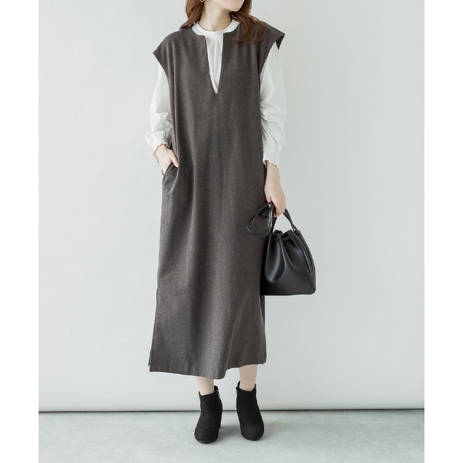 トップスとの合わせが楽しめる、キーネックロングワンピース。