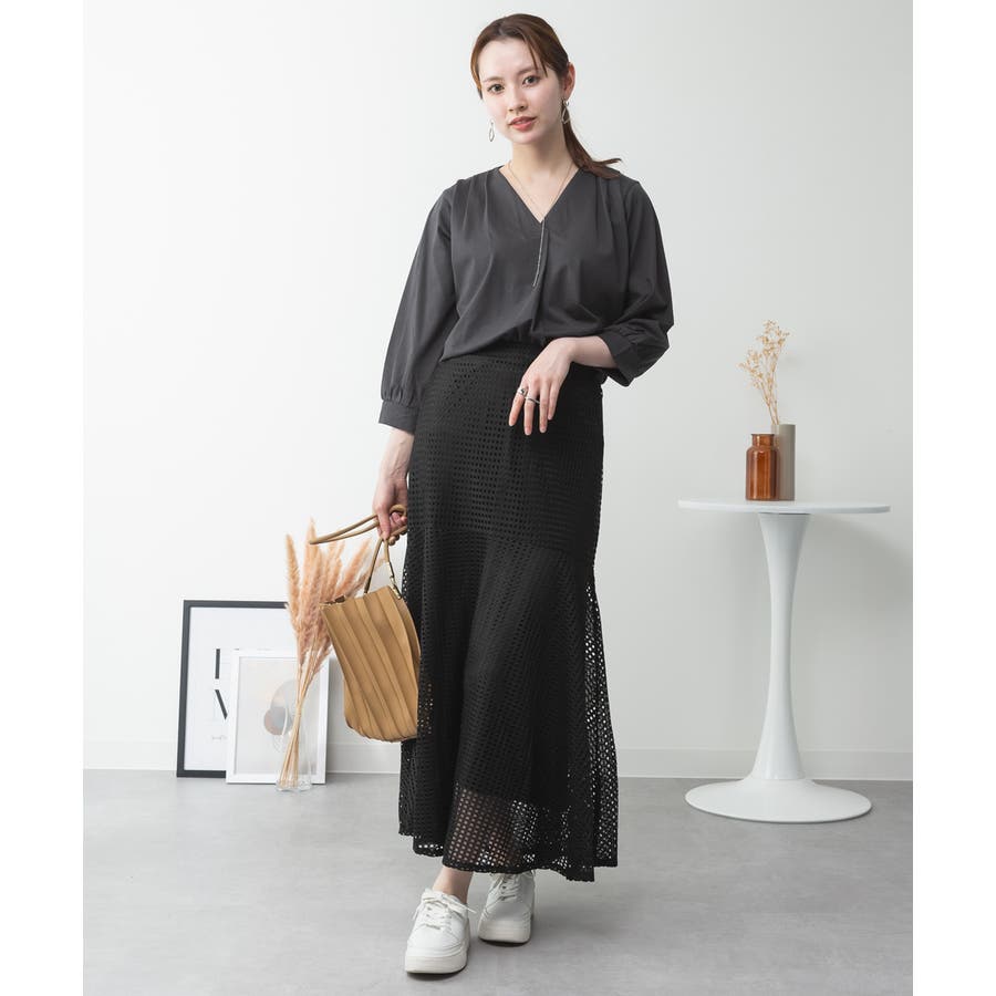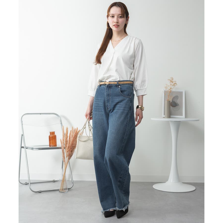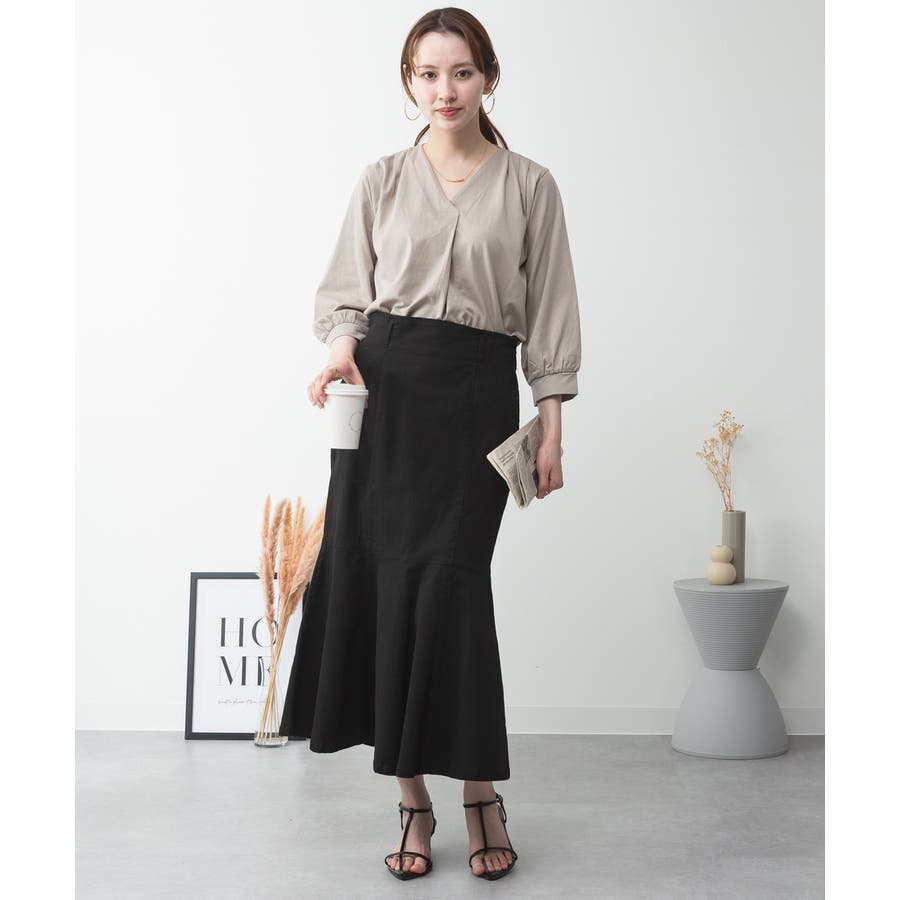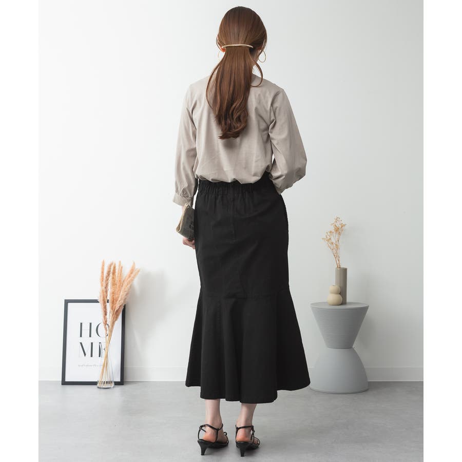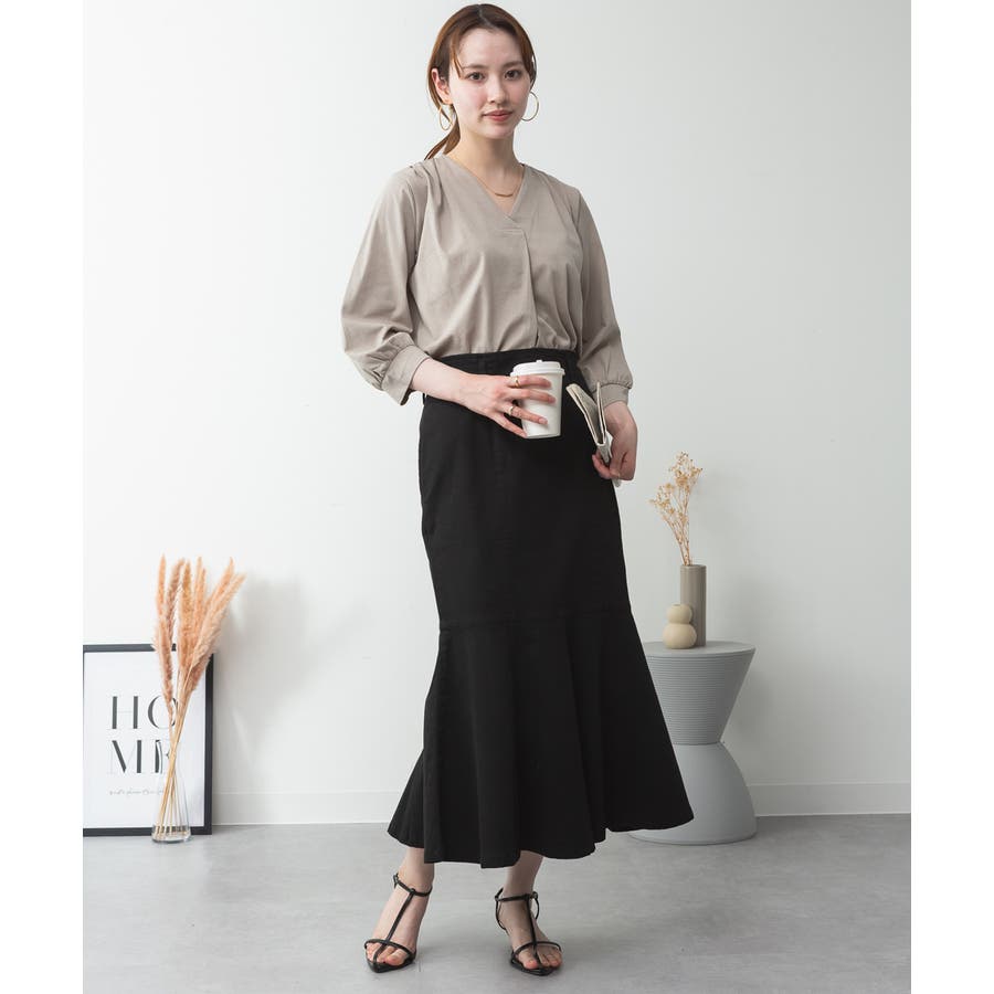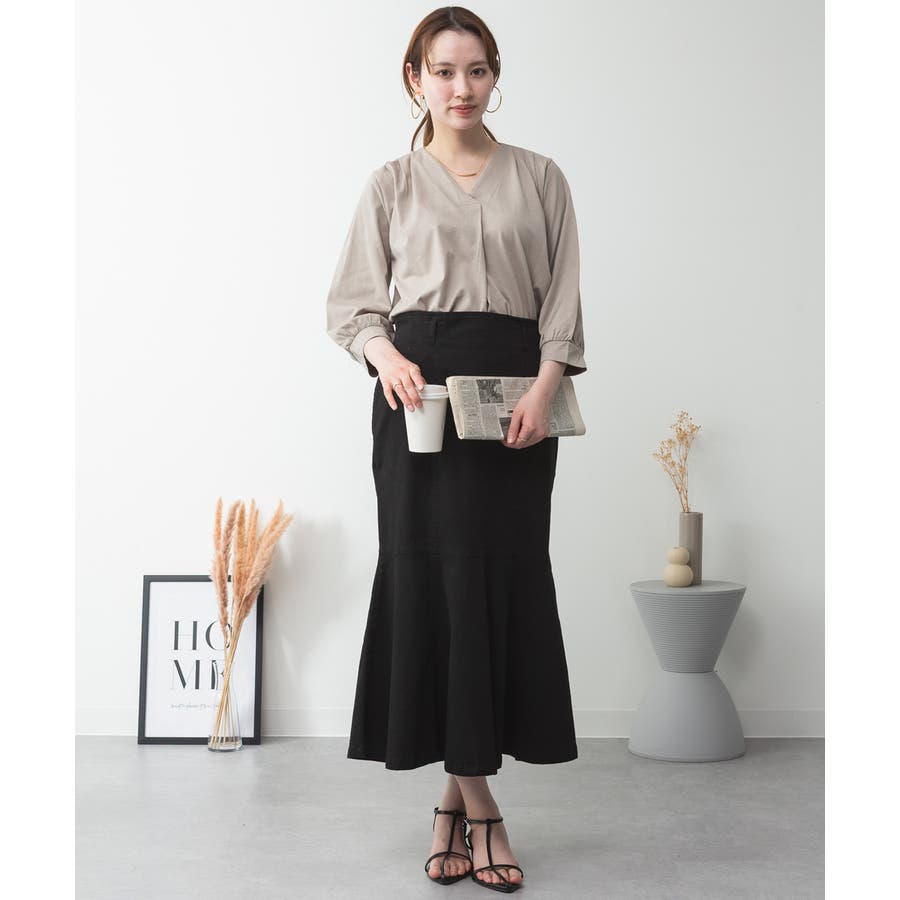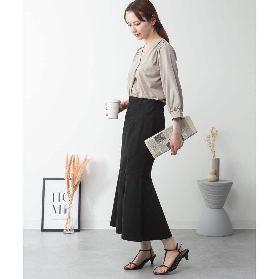 スキッパーネックが顔まわりをすっきり見せ、肩タックと袖ギャザーが程よい立体感とやわらかな女性らしさを演出します。
