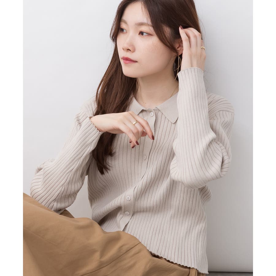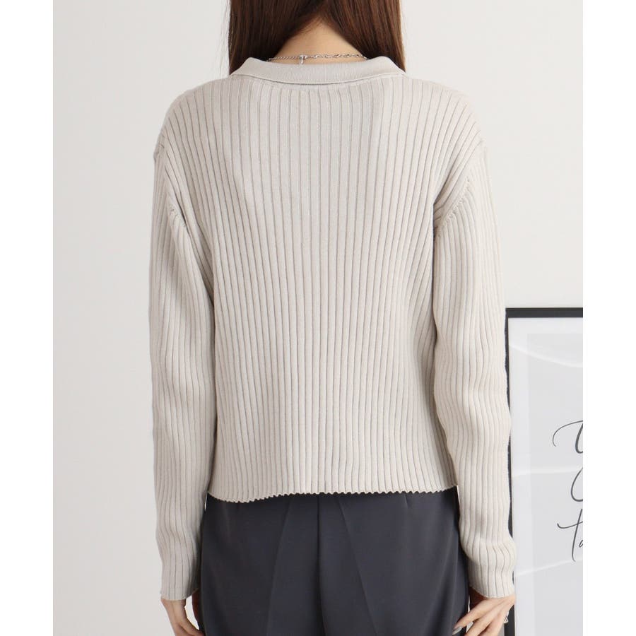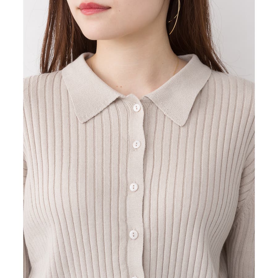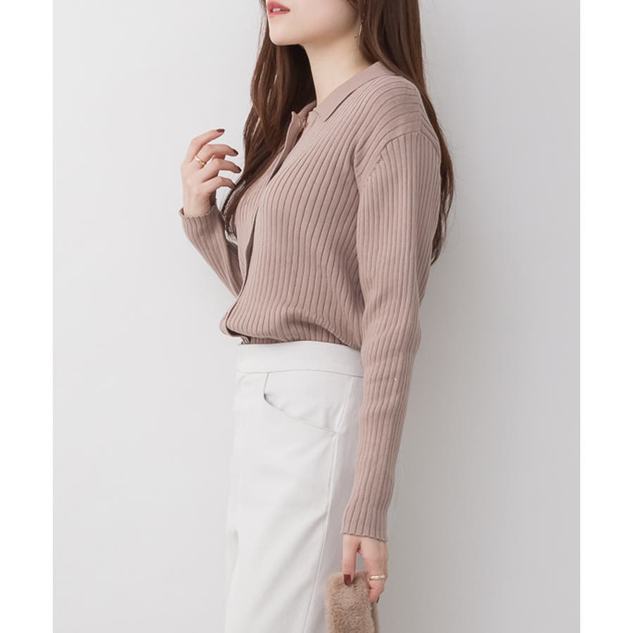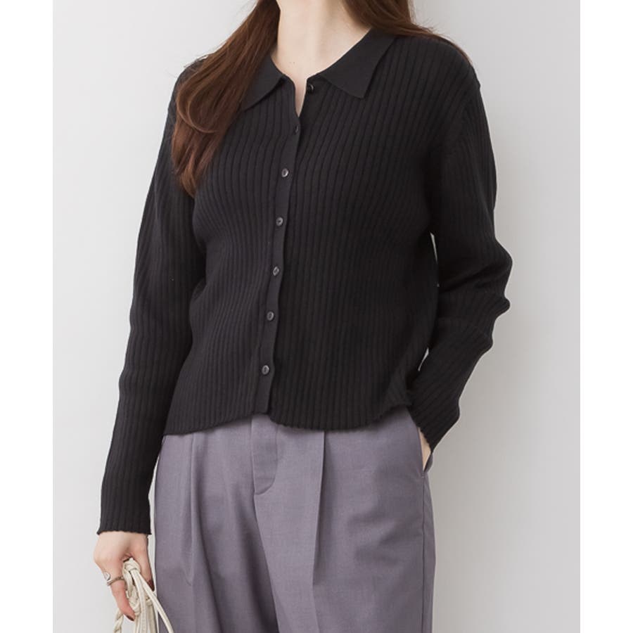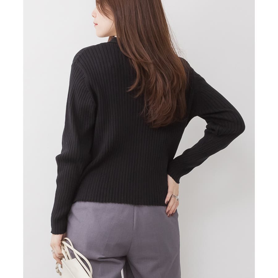 伸縮性に富んだリブ編み素材が体のラインを美しく見せ、クラシカルなポロ衿が洗練された印象を与えます。