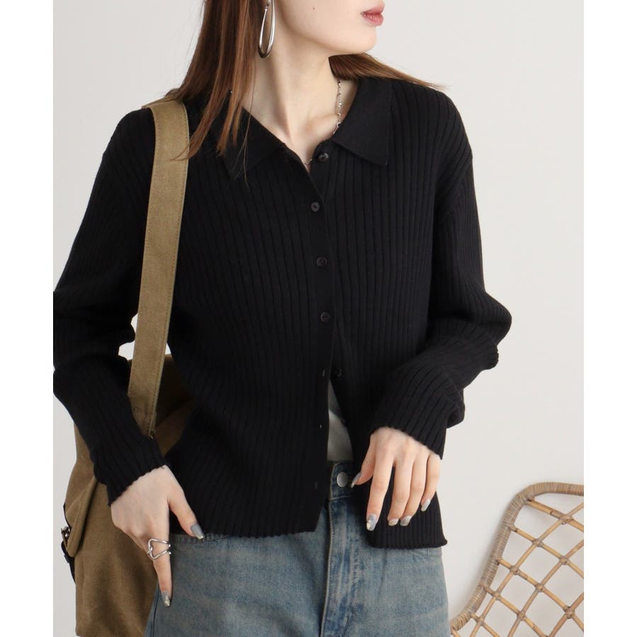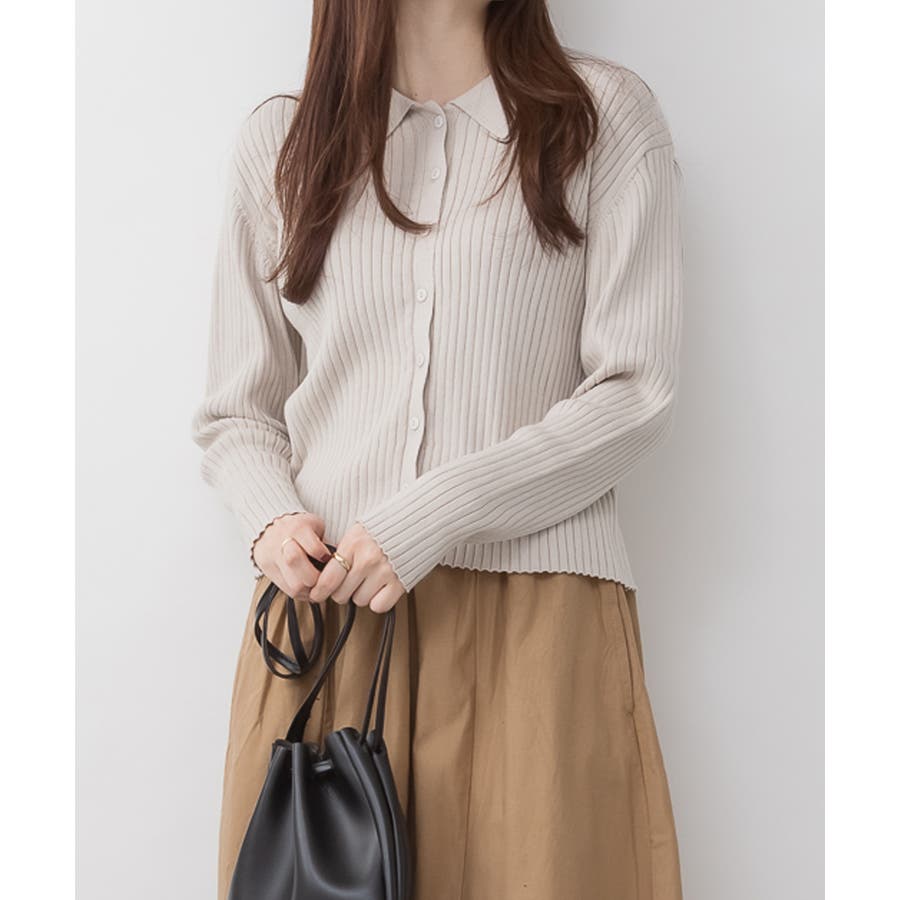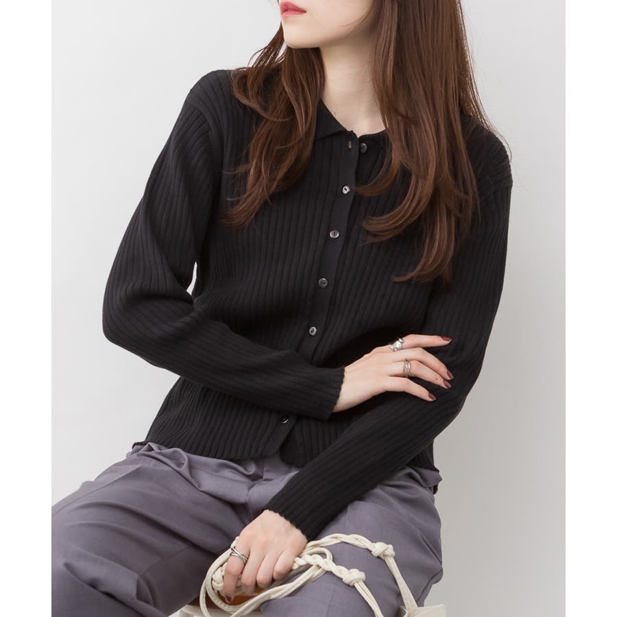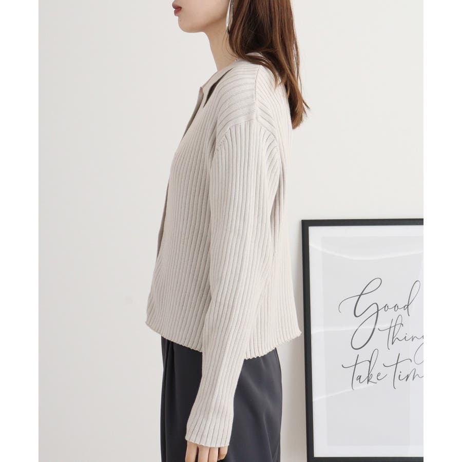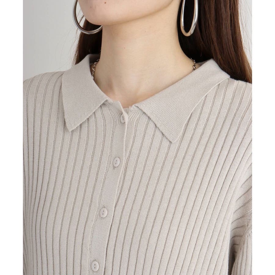 伸縮性に富んだリブ編み素材が体のラインを美しく見せ、クラシカルなポロ衿が洗練された印象を与えます。