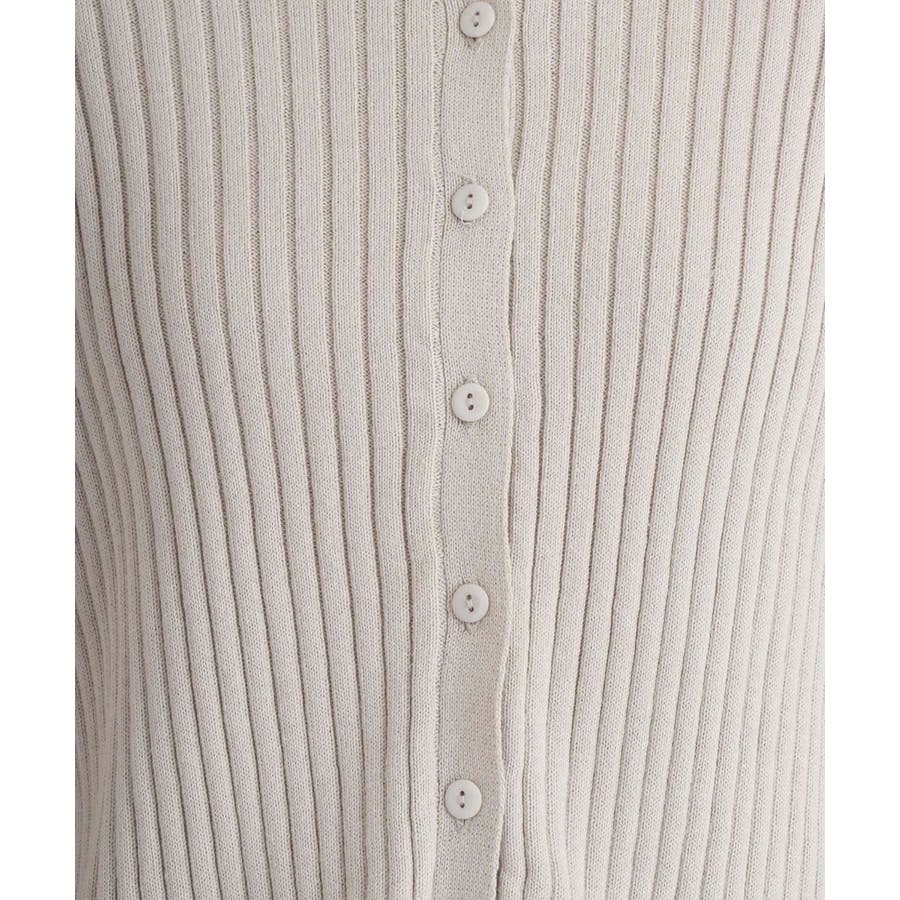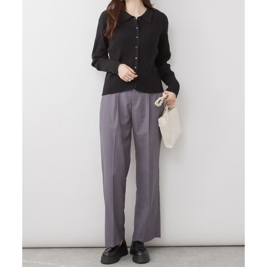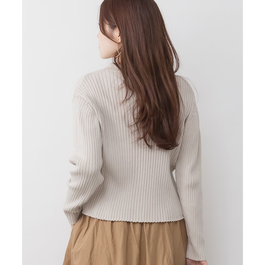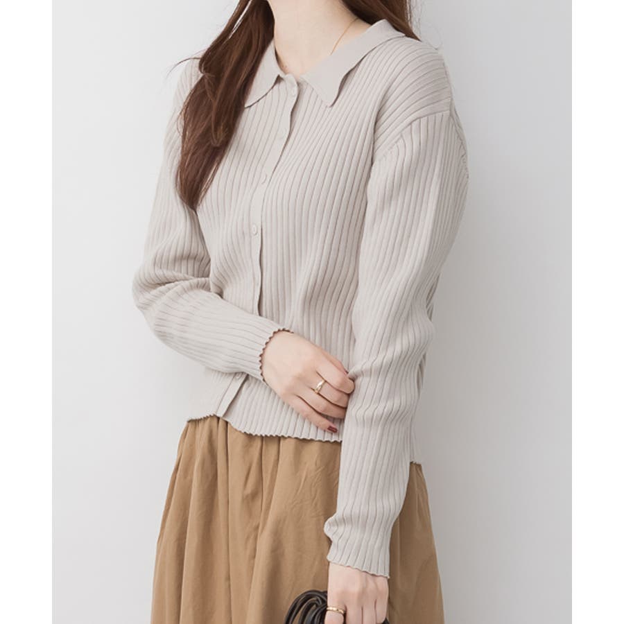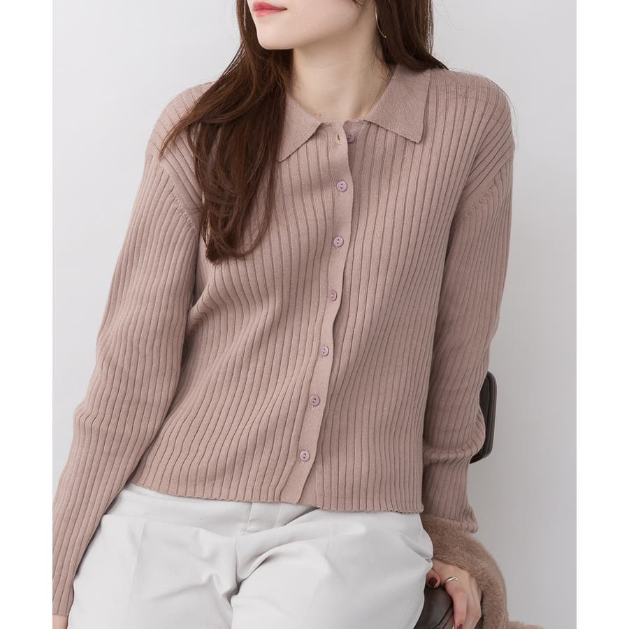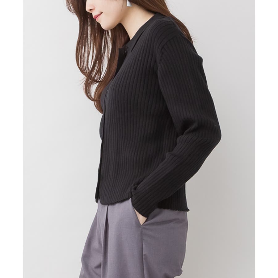 伸縮性に富んだリブ編み素材が体のラインを美しく見せ、クラシカルなポロ衿が洗練された印象を与えます。