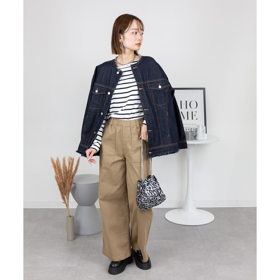 インナーには薄手のボーダーニットを重ねて程よいカジュアルさを添え、ボトムには落ち感のあるサテンワイドパンツを合わせて上品な動きをプラス。
