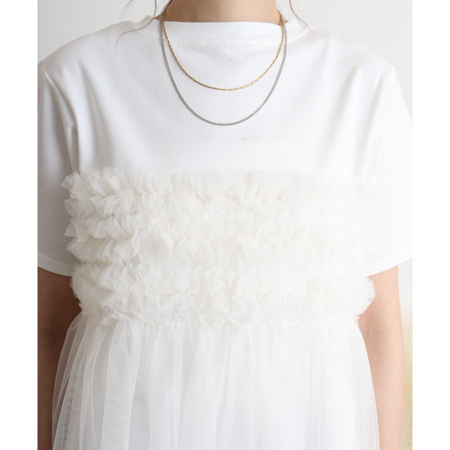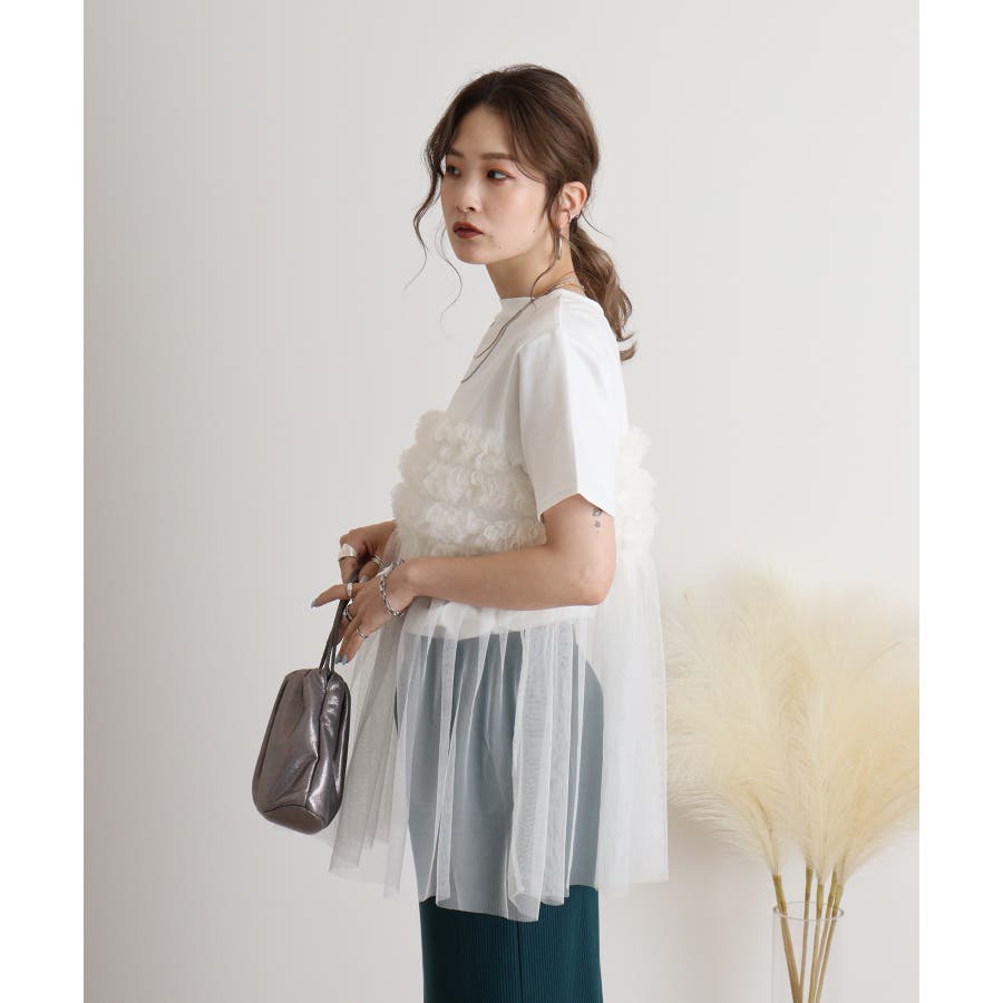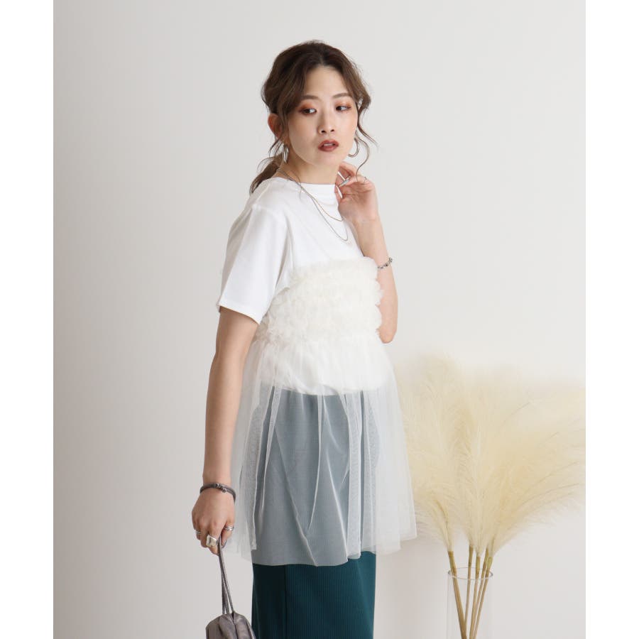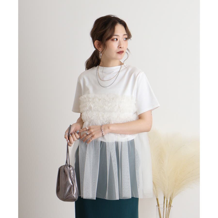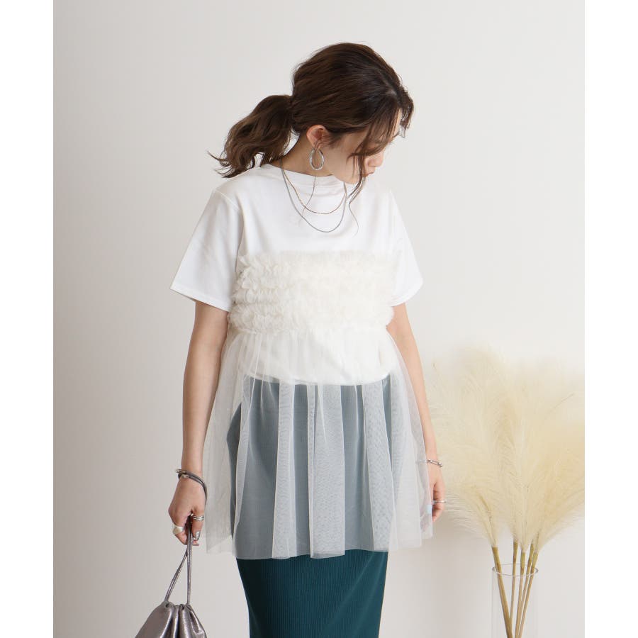 【オフホワイト】プリーツチュールドッキングTシャツ