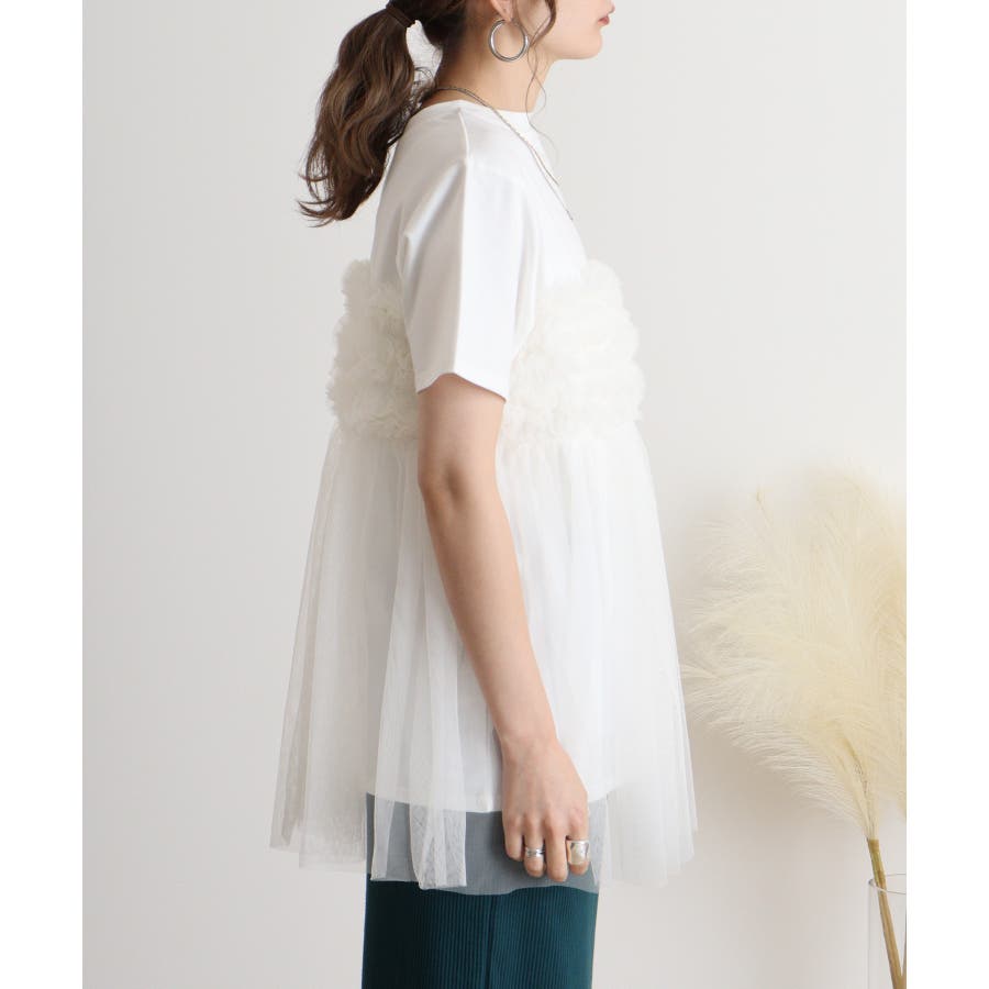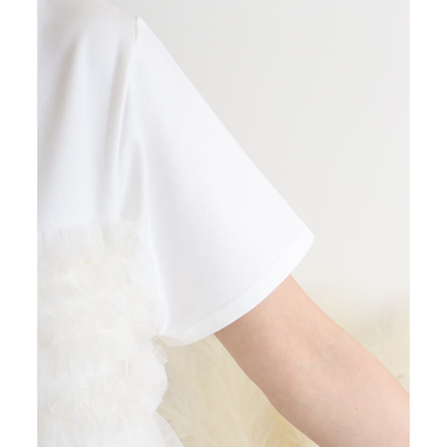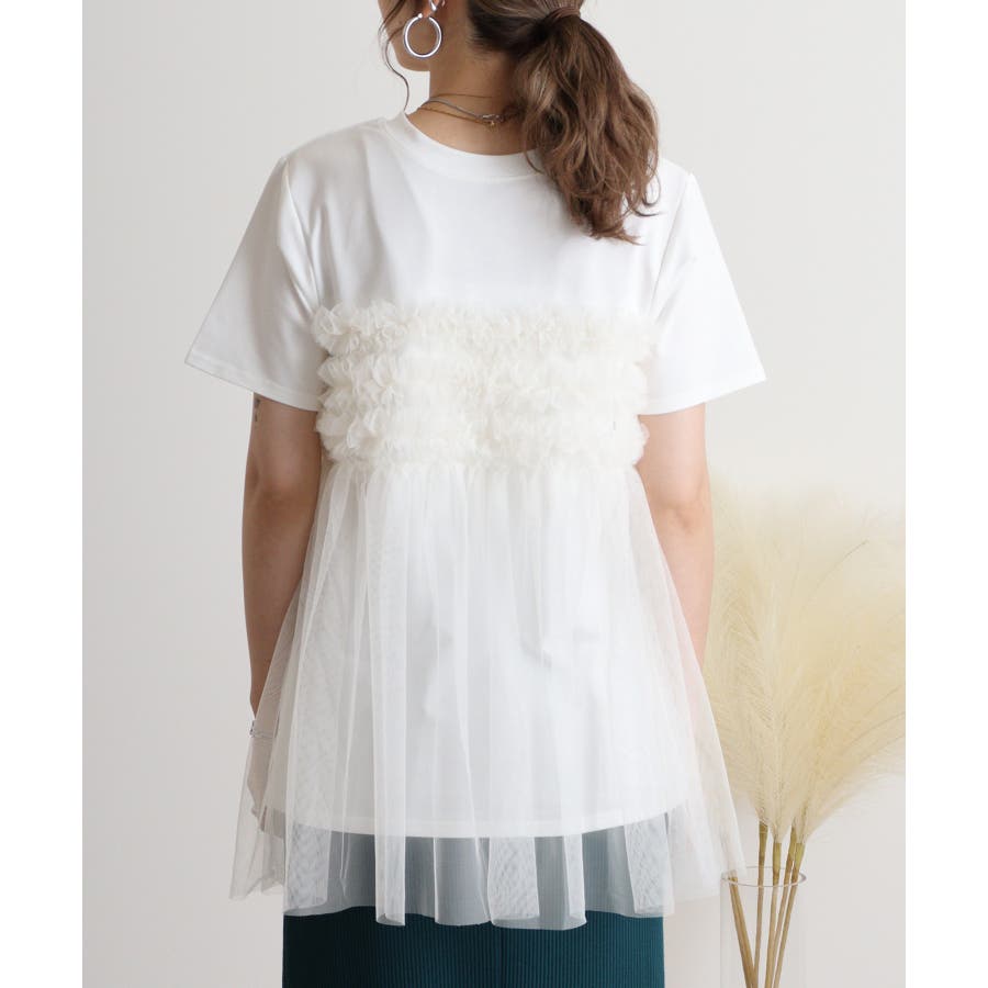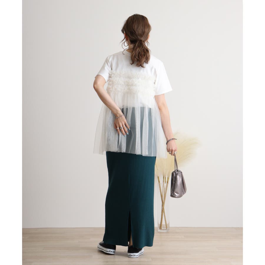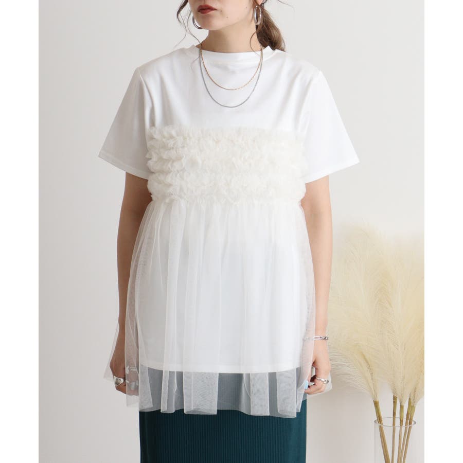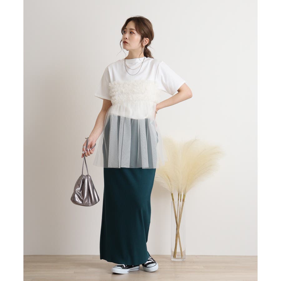 【オフホワイト】プリーツチュールドッキングTシャツ