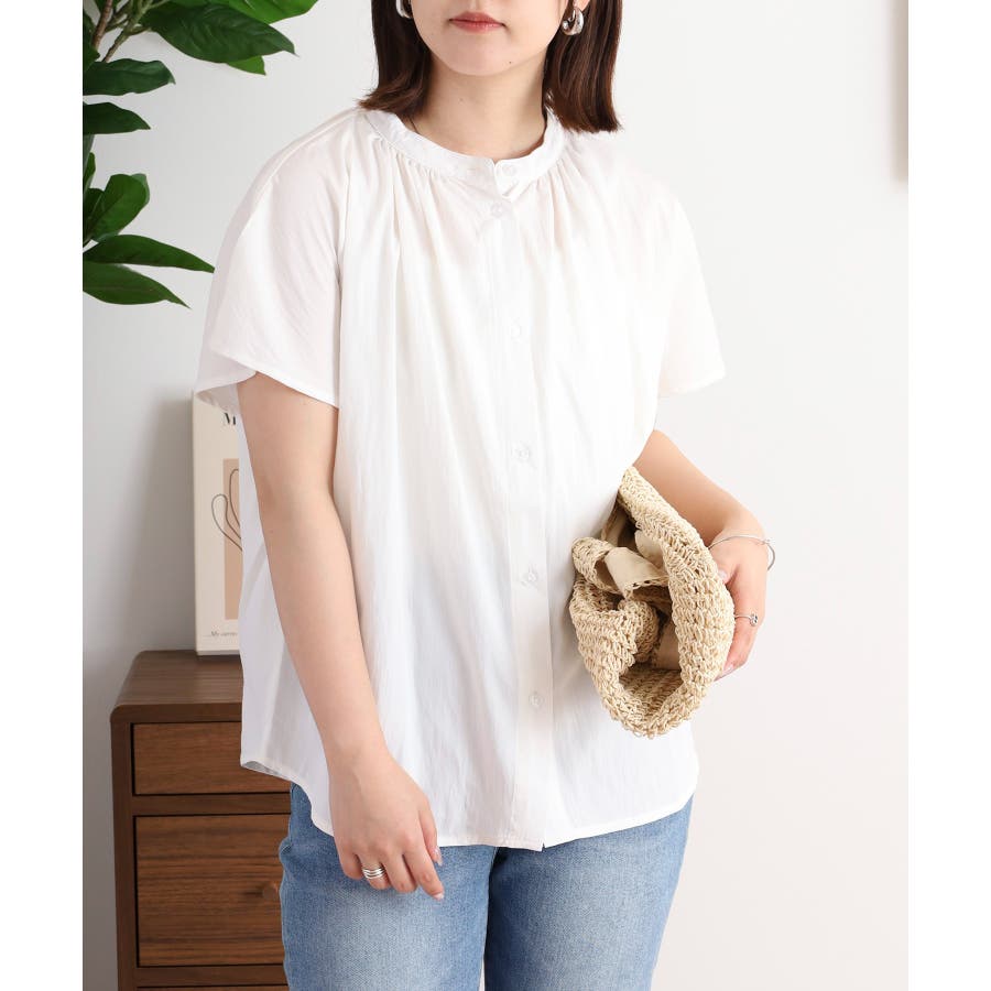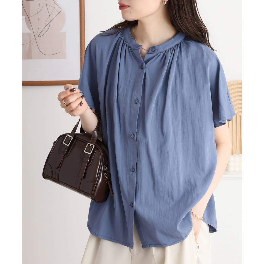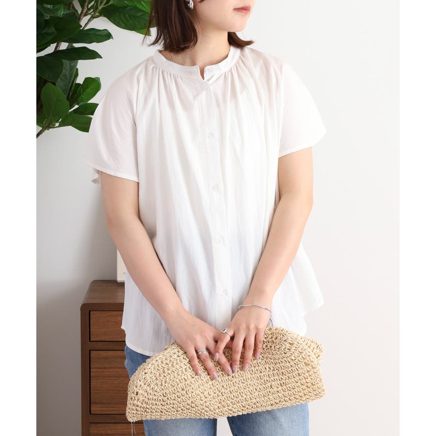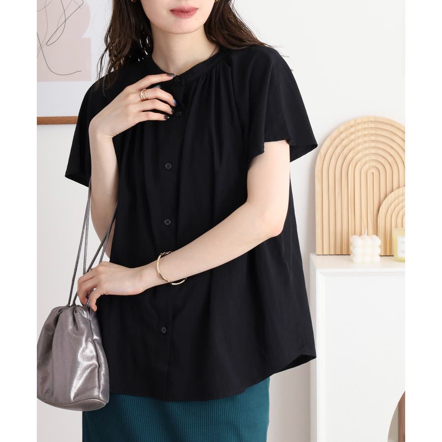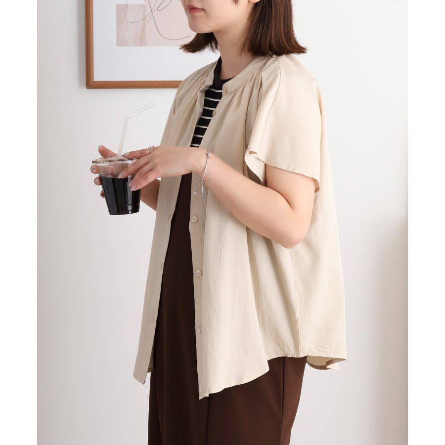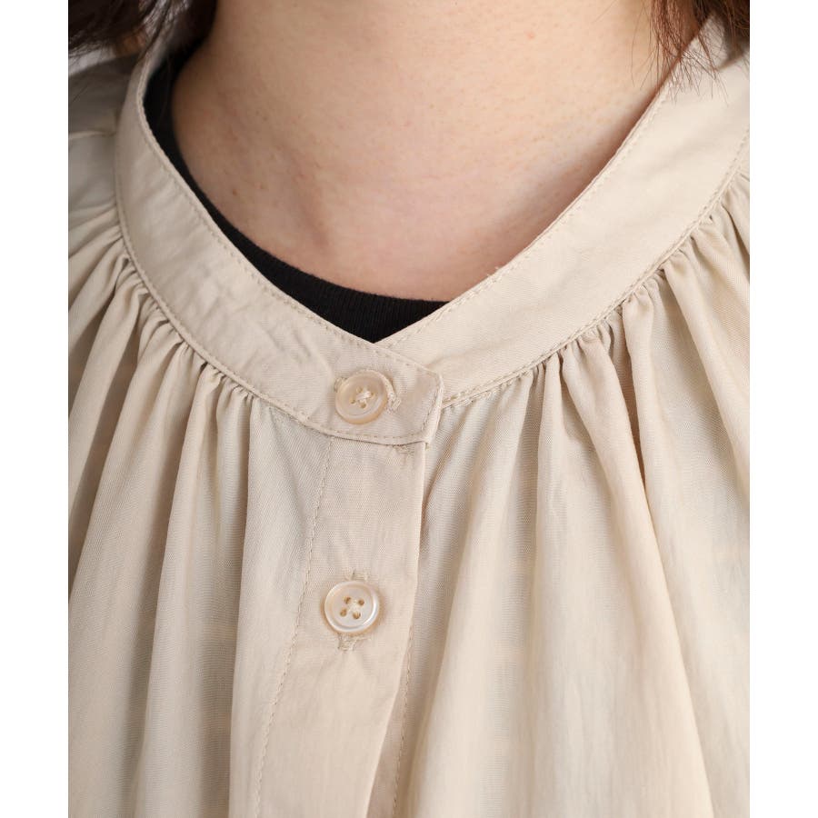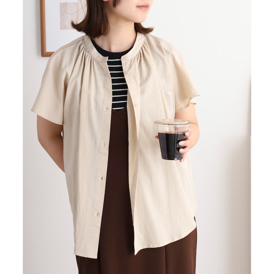 バンドカラーが顔まわりをすっきり見せ、オンにもオフにも対応する洗練された一枚です。