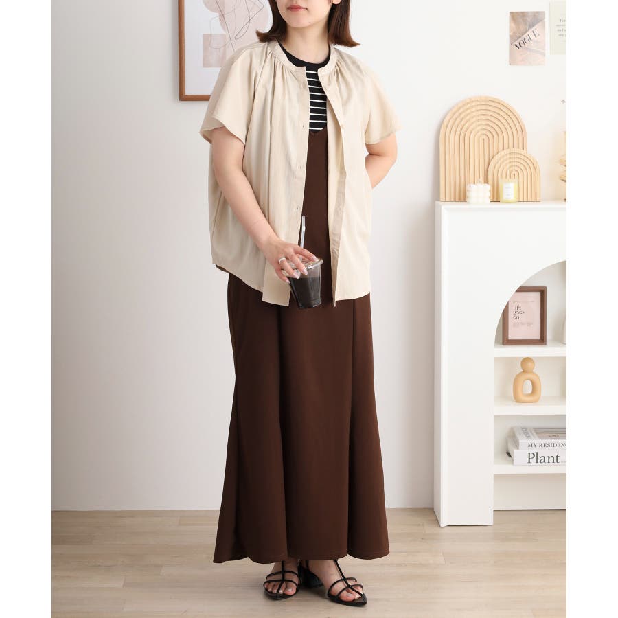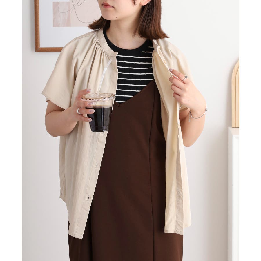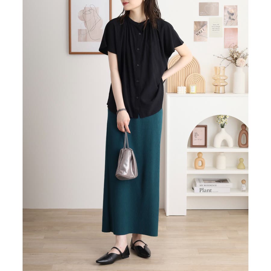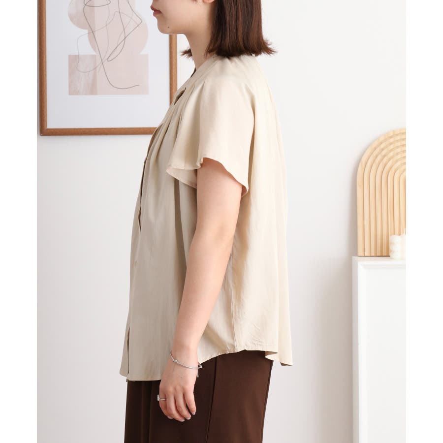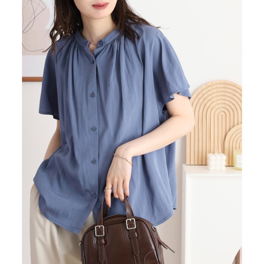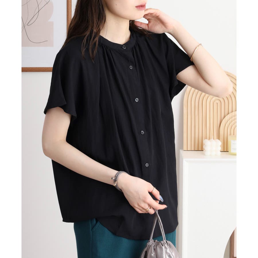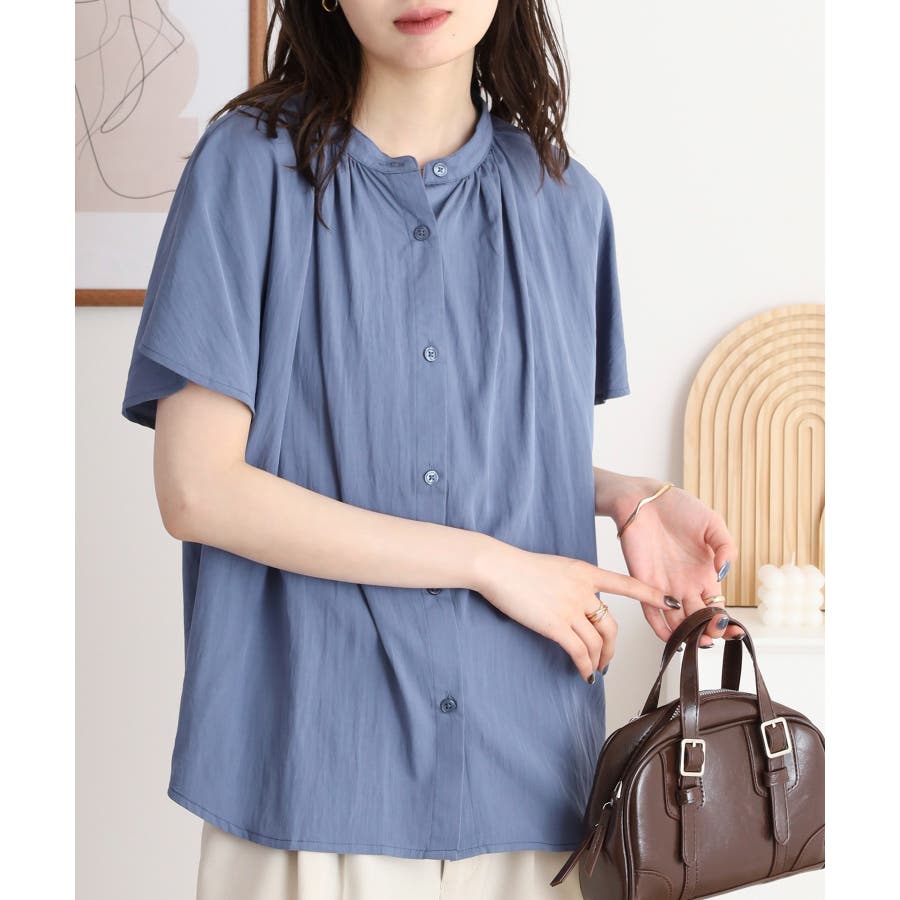 バンドカラーが顔まわりをすっきり見せ、オンにもオフにも対応する洗練された一枚です。