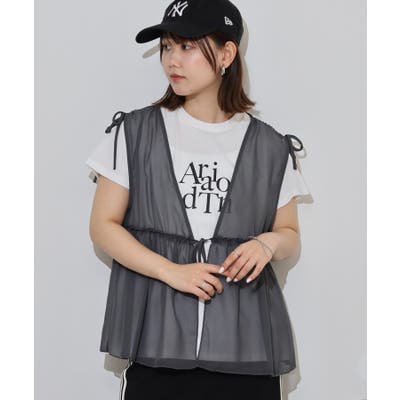 ふんわりシフォンベストと、AラインロゴTシャツがセットになった着映えアンサンブル。