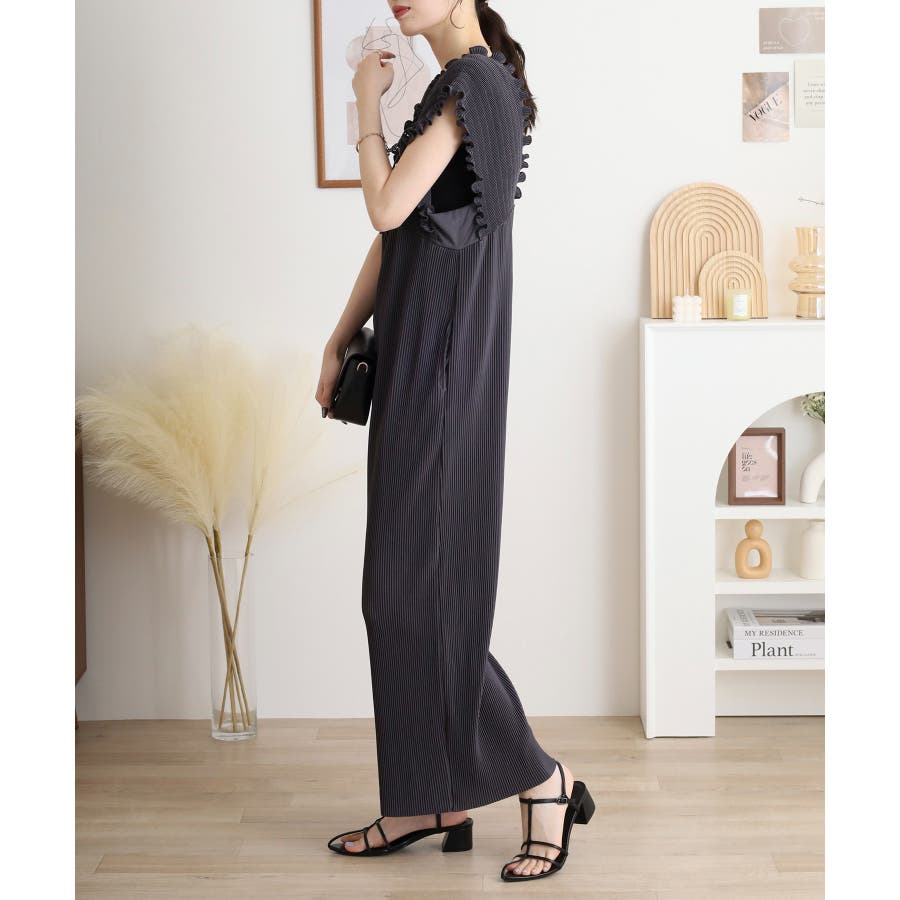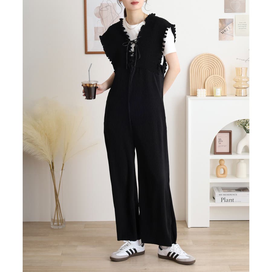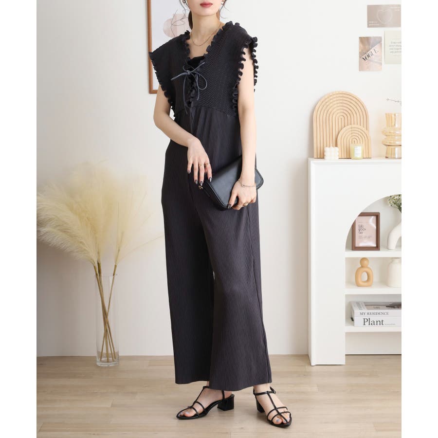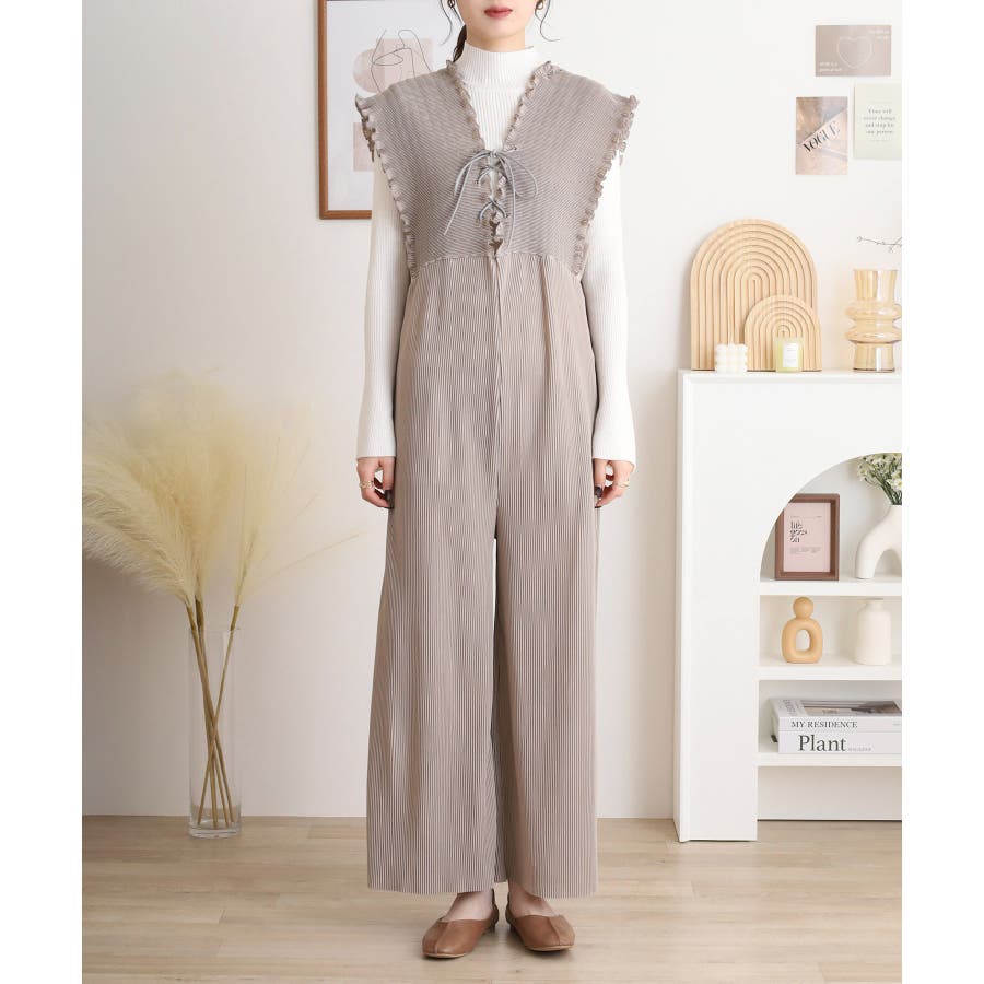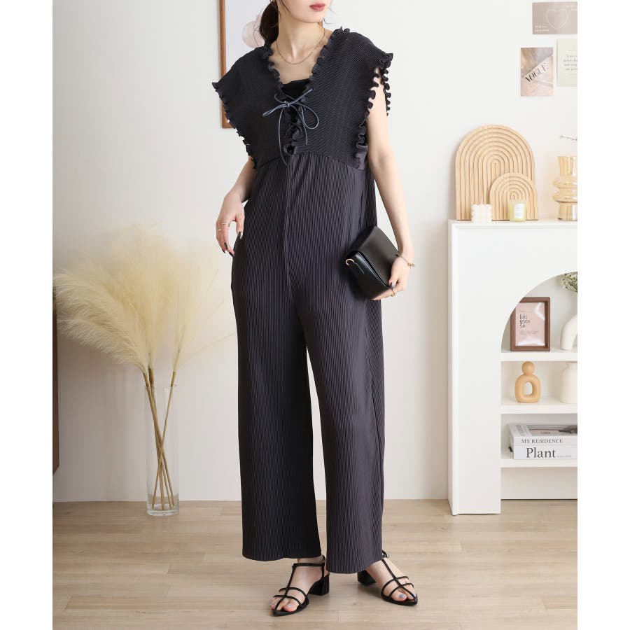 胸元レースアップギャザーオールインワン