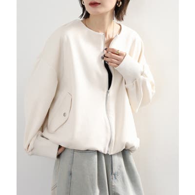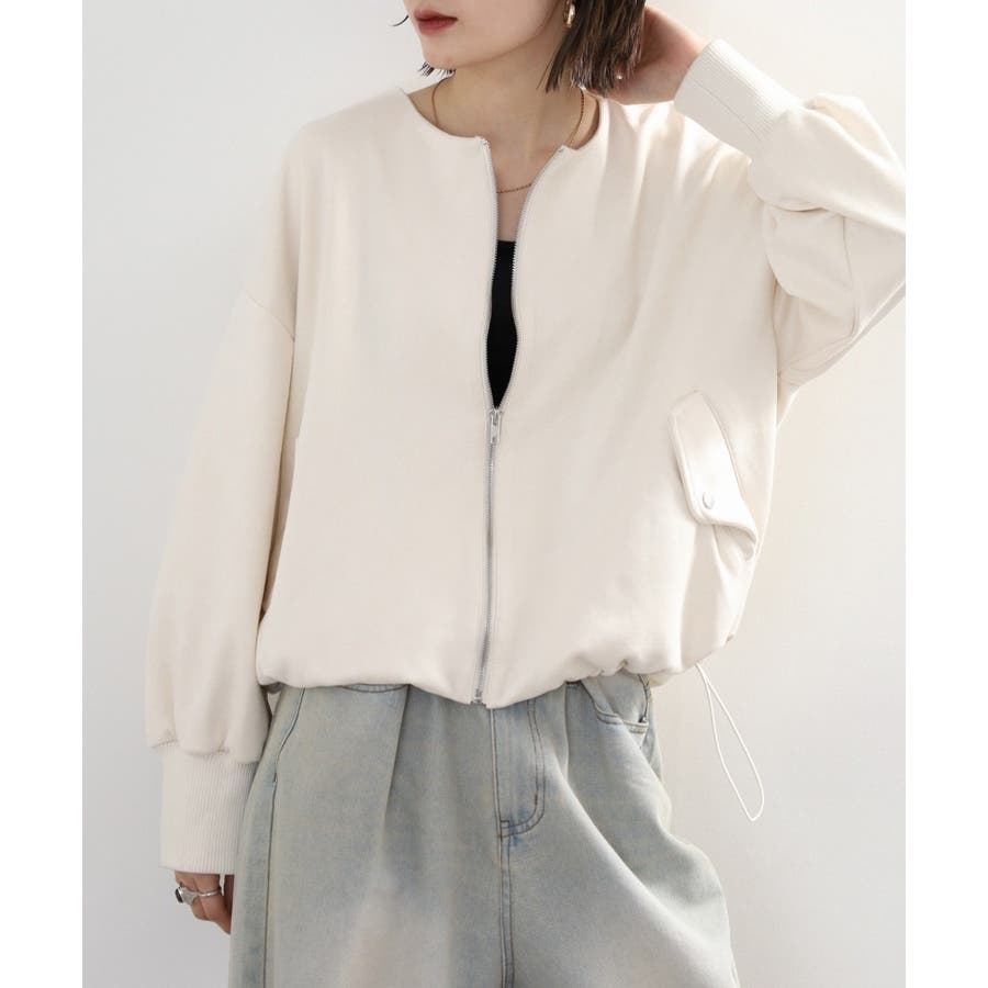 アクセサリーは小ぶりのイヤリングや腕時計を添えると、ブルゾンの丸みと調和した女性らしいスタイリングが完成します。