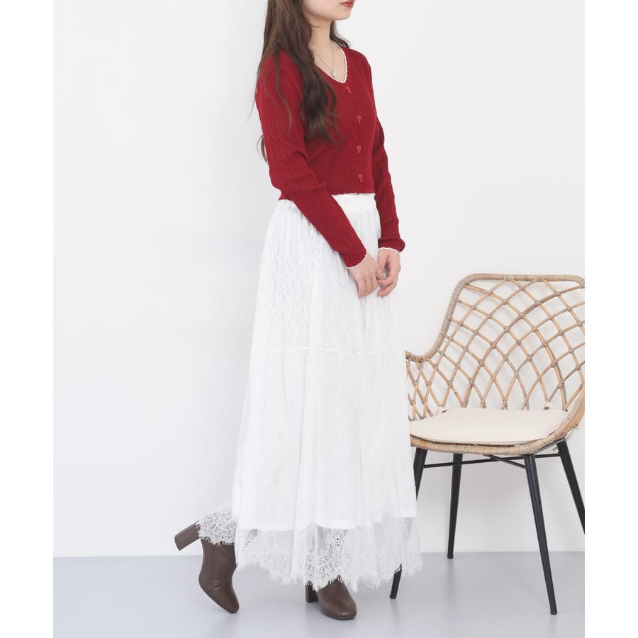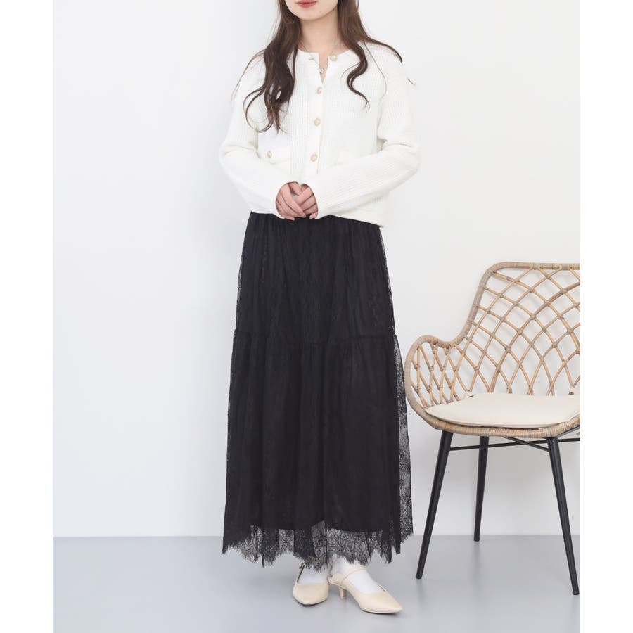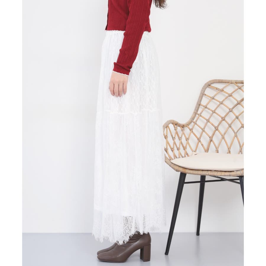 繊細なひげレースを贅沢に切り替えたロングスカートで、動くたびにふわりと揺れる軽やかさが魅力。