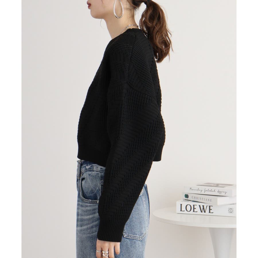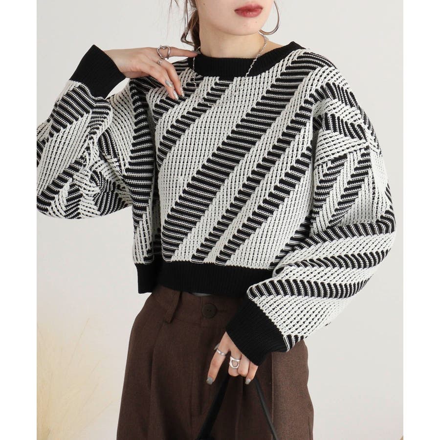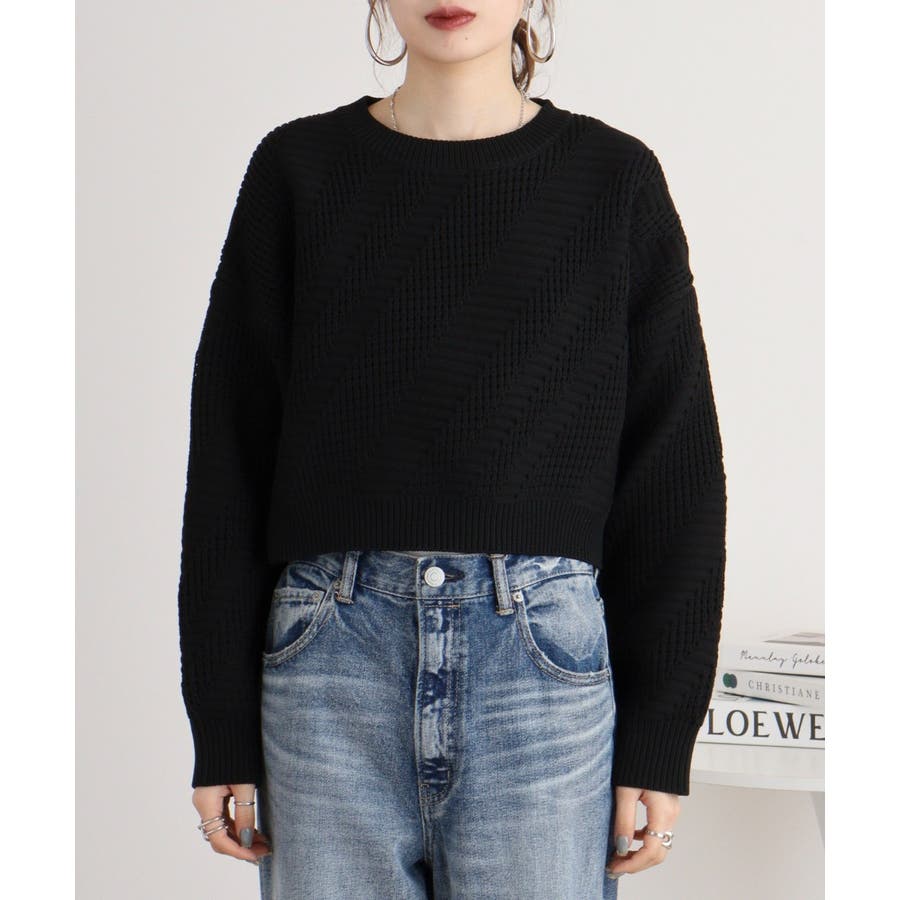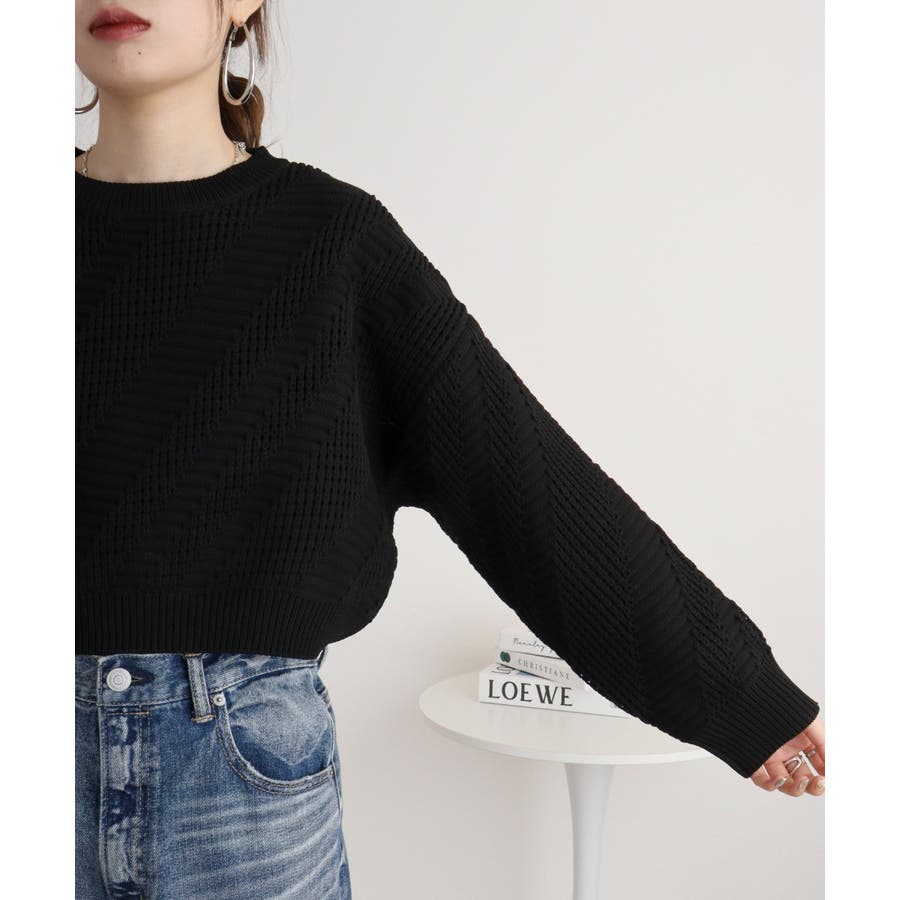 トレンド感のあるデザインとショート丈が特徴のニットトップス。